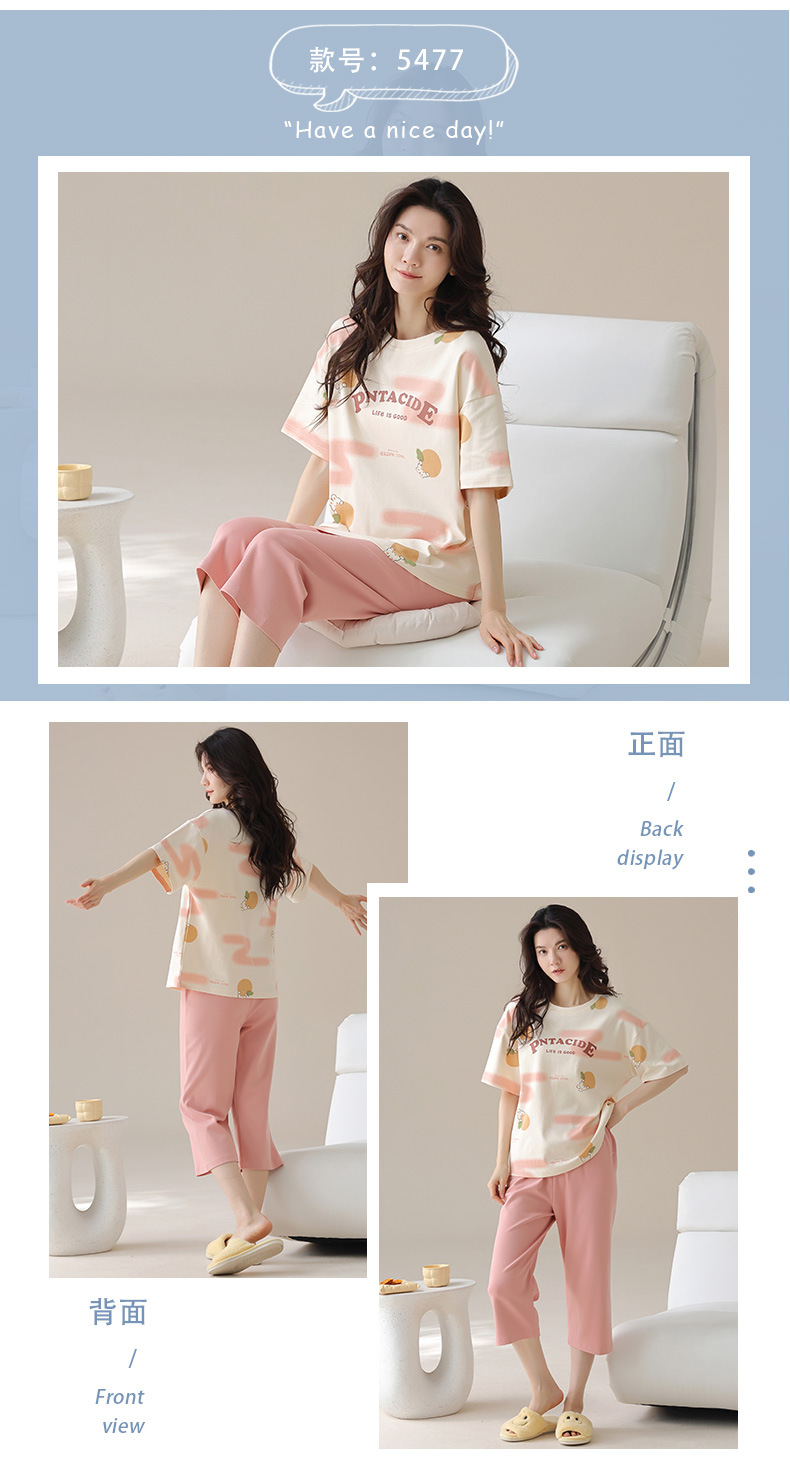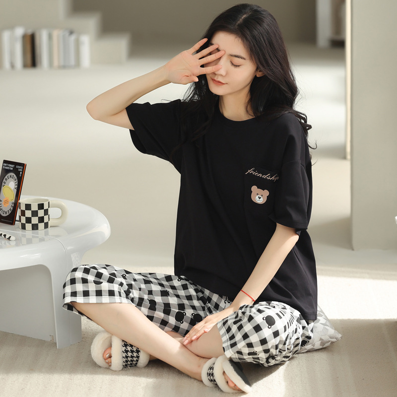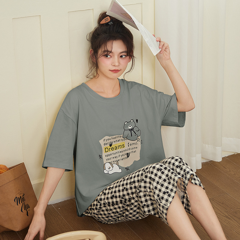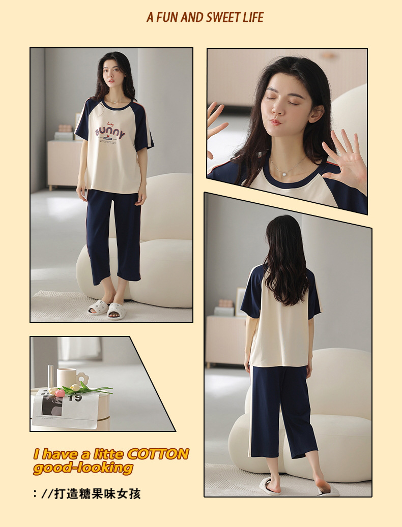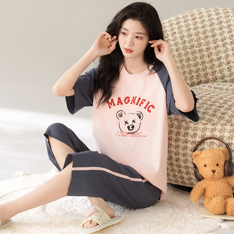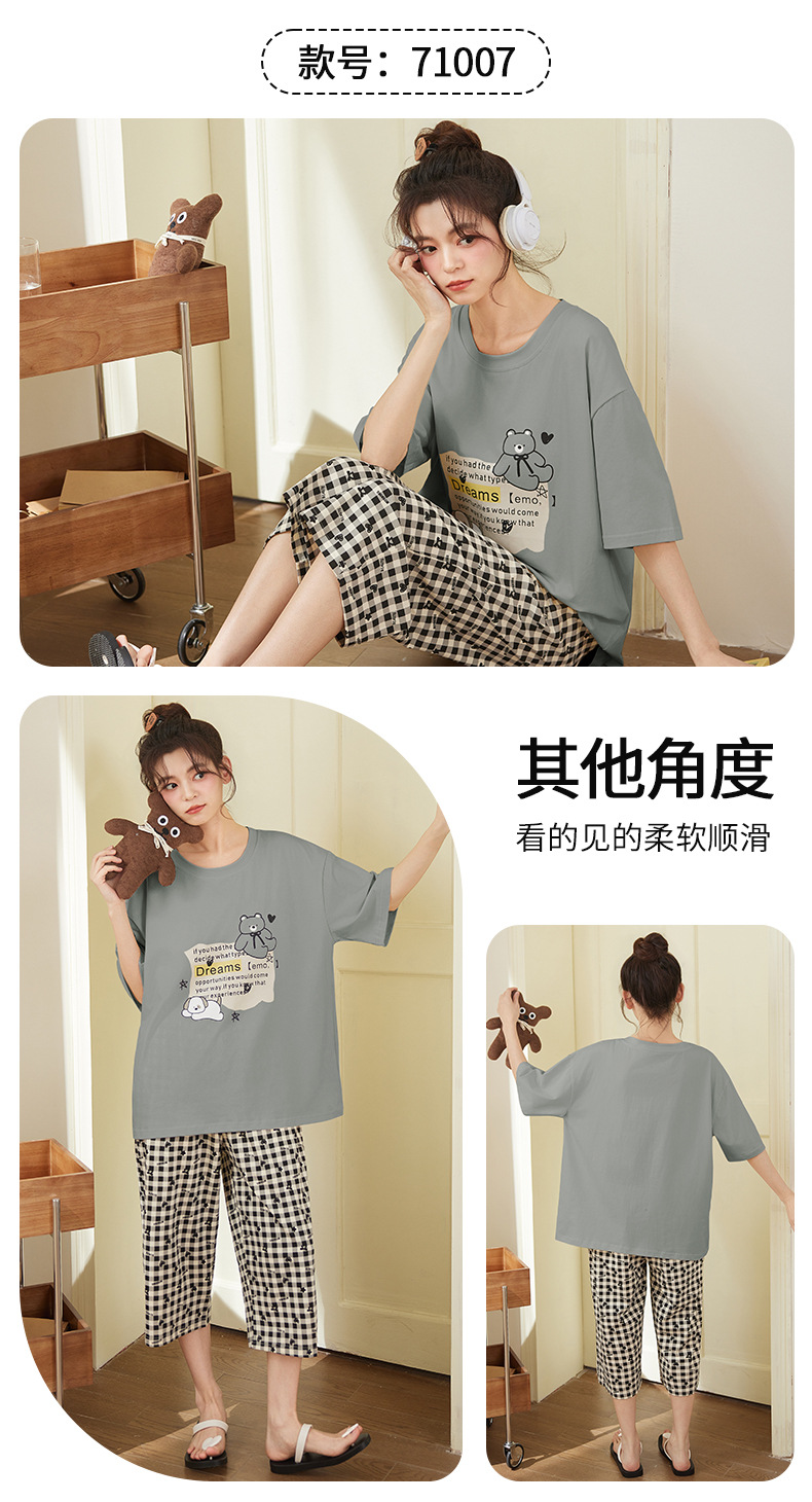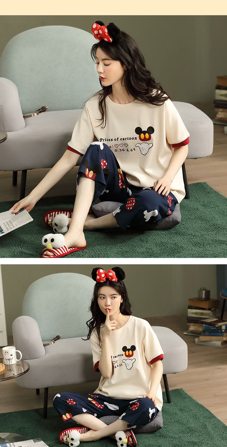 100% 면 잠옷 여성 반팔 크롭 팬츠 한국 여름 새로운 느슨한 캐주얼 학생 홈웨어 세트 얇은스토어 가기