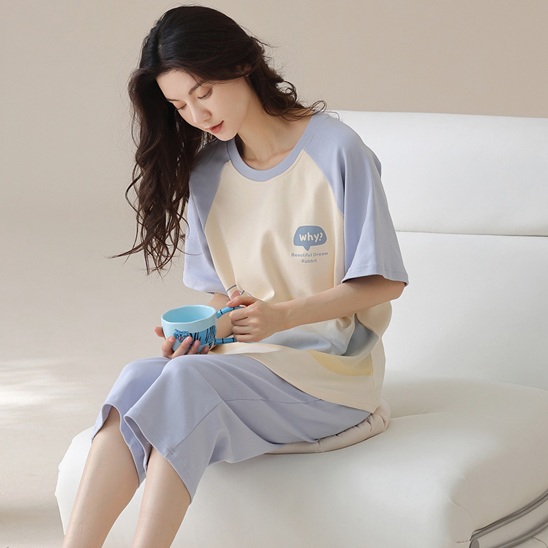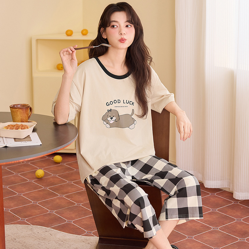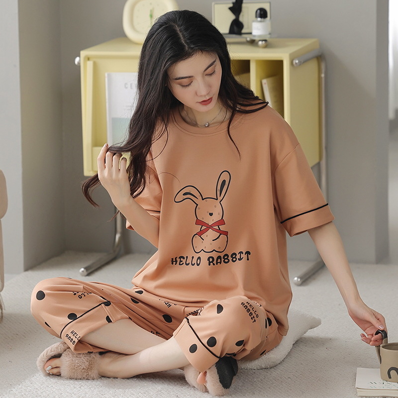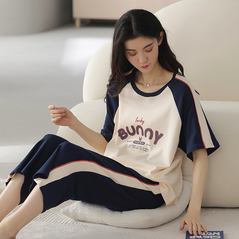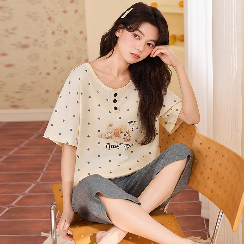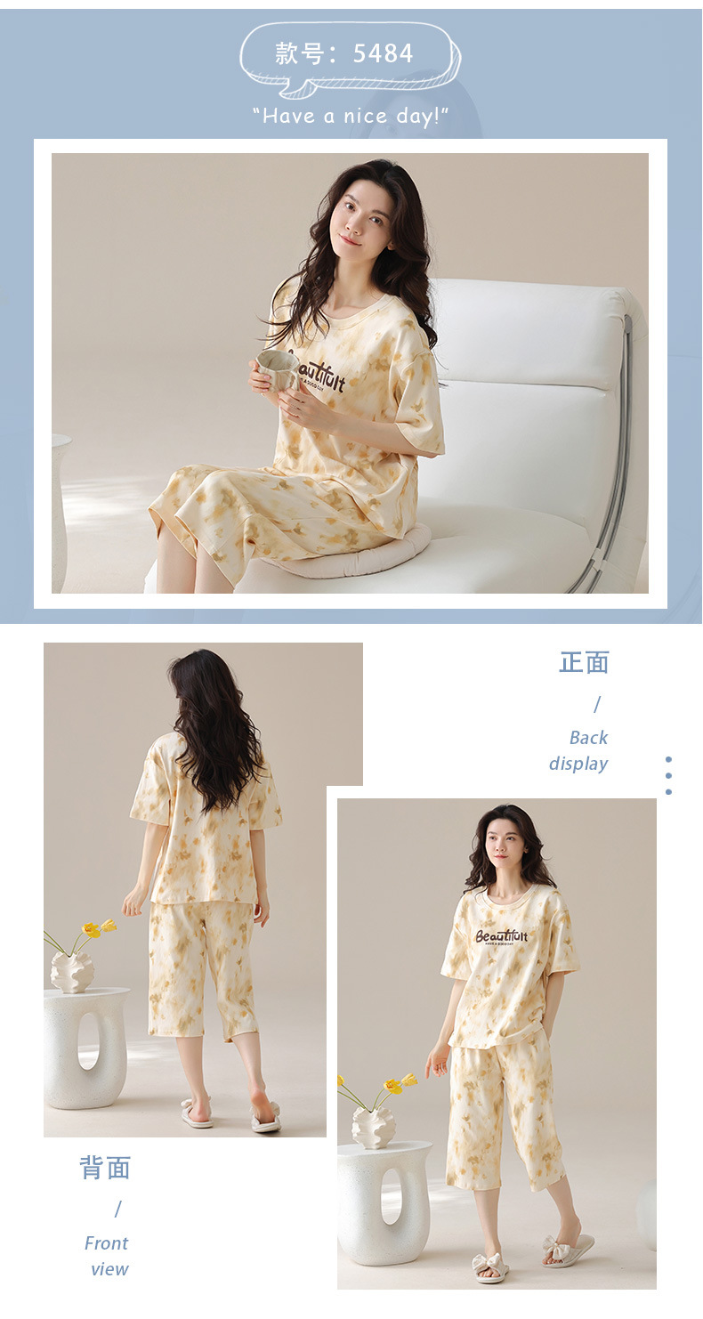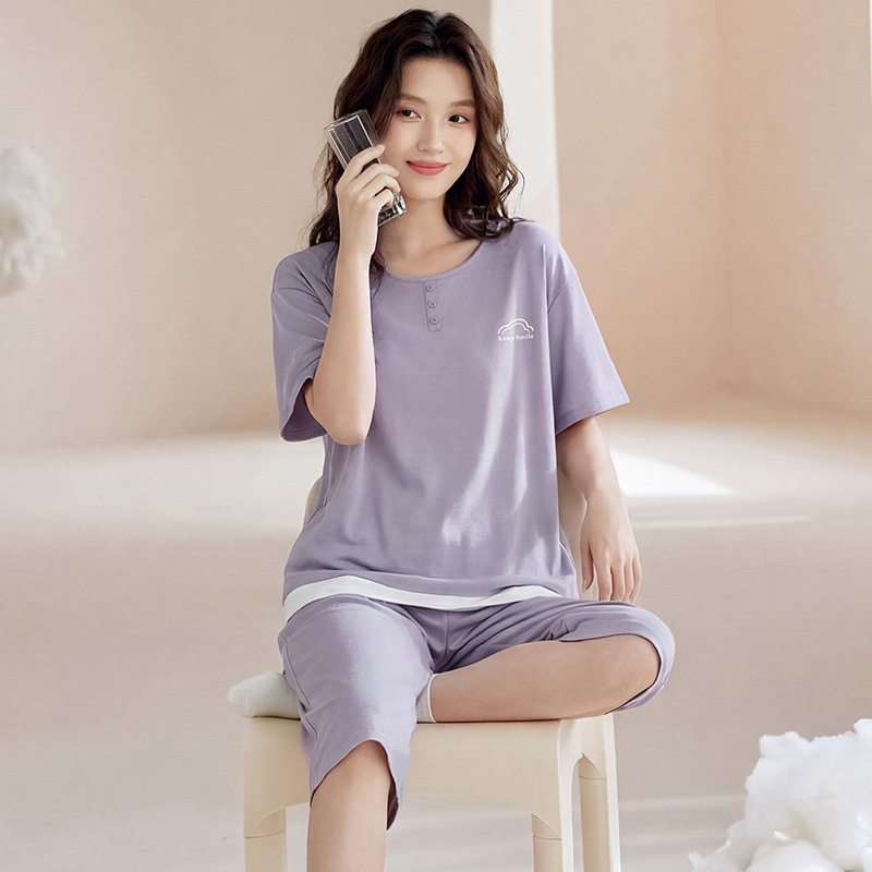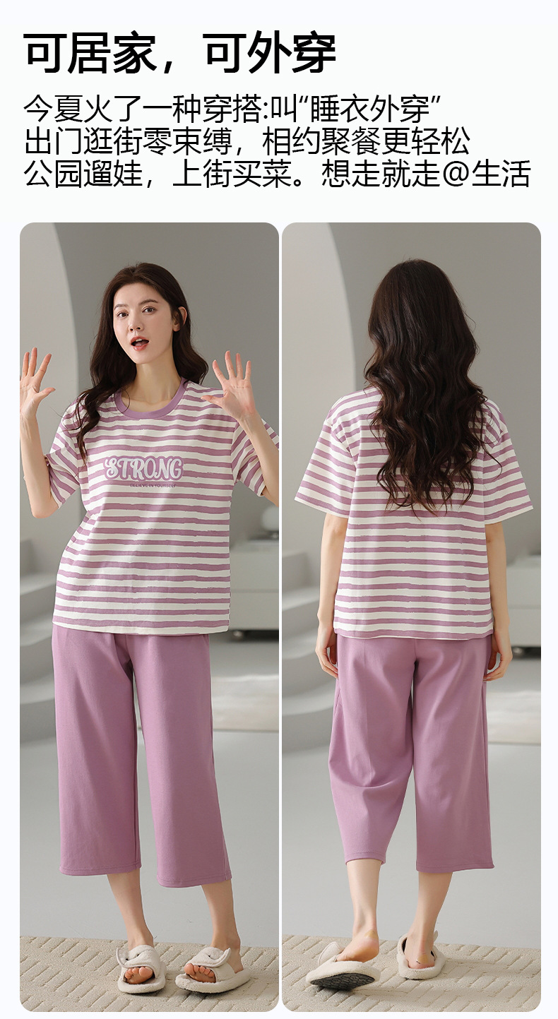 100% 면 잠옷 여성 반팔 크롭 팬츠 한국 여름 새로운 느슨한 캐주얼 학생 홈웨어 세트 얇은스토어 가기