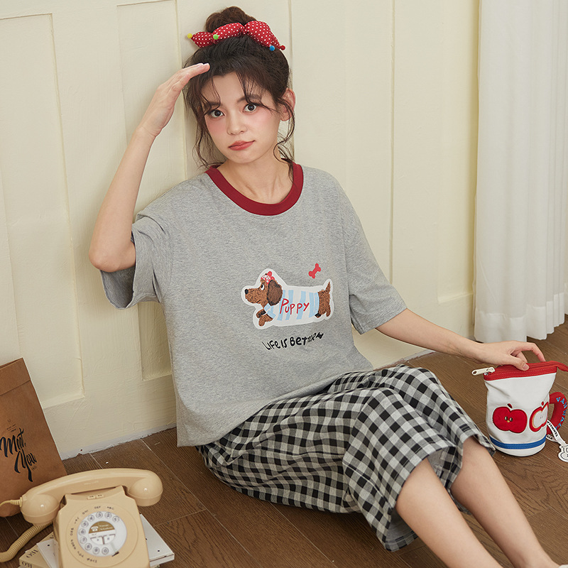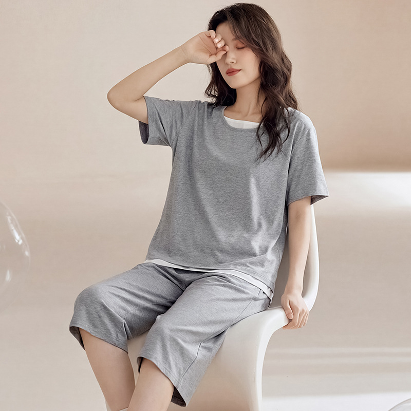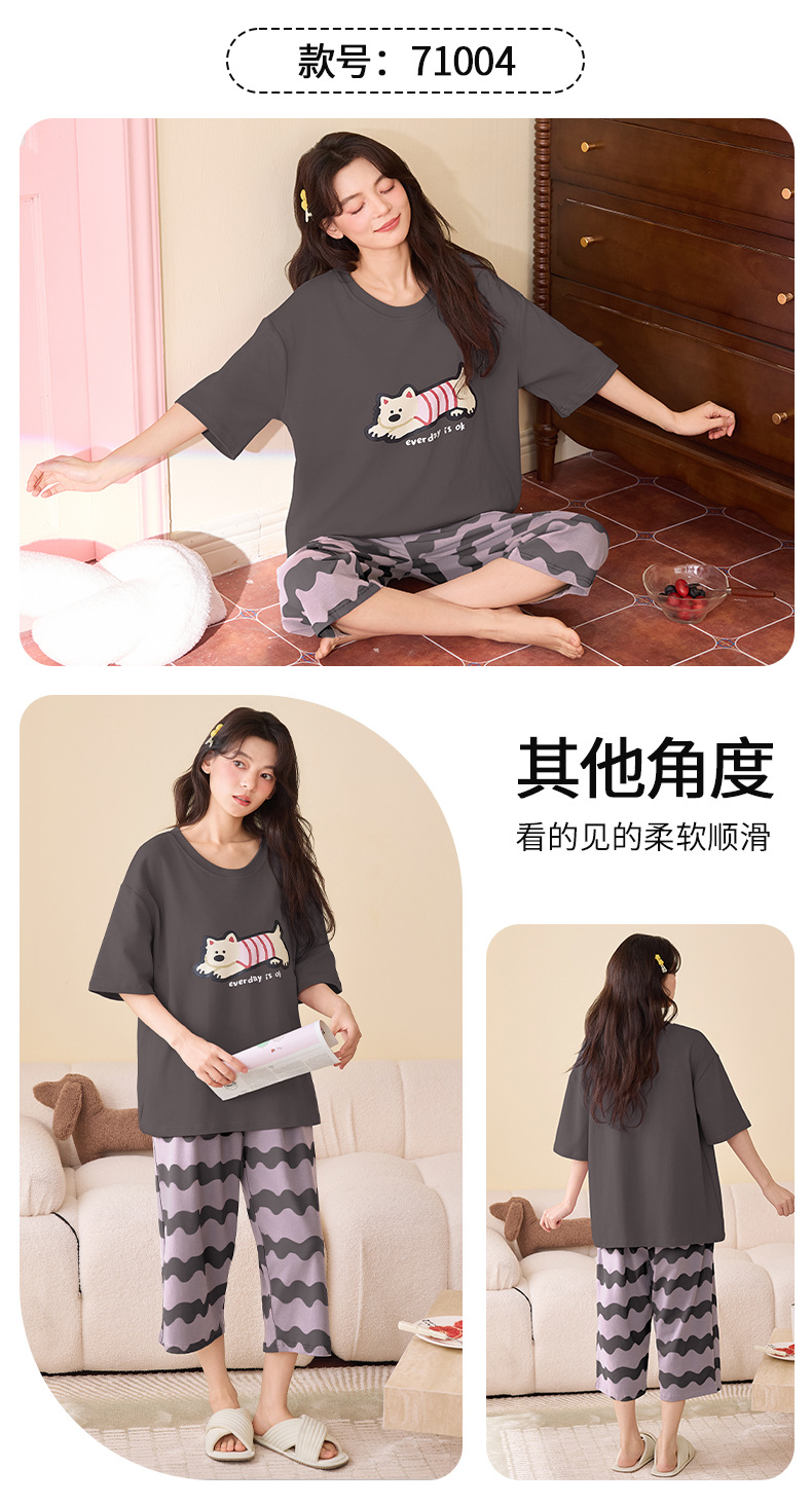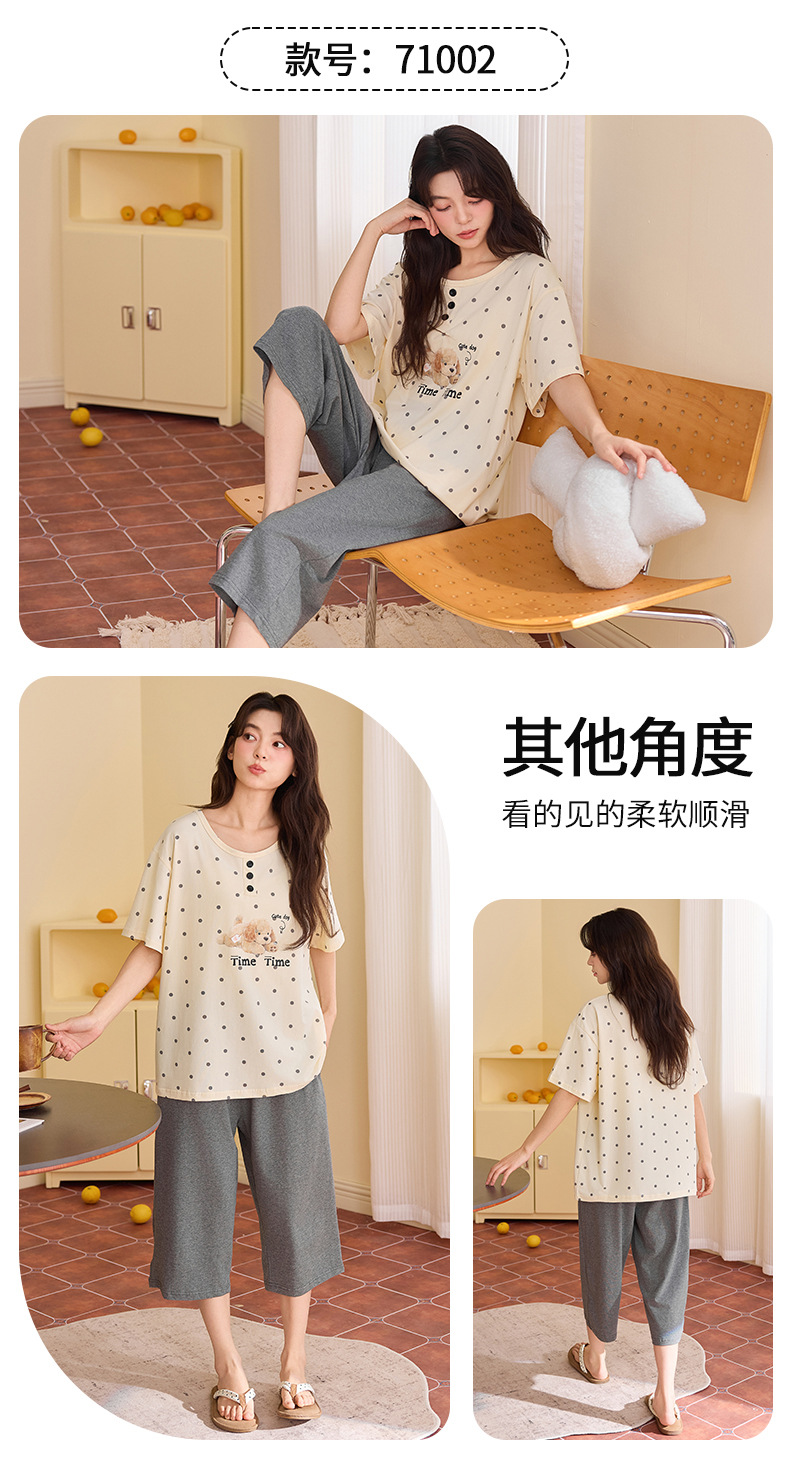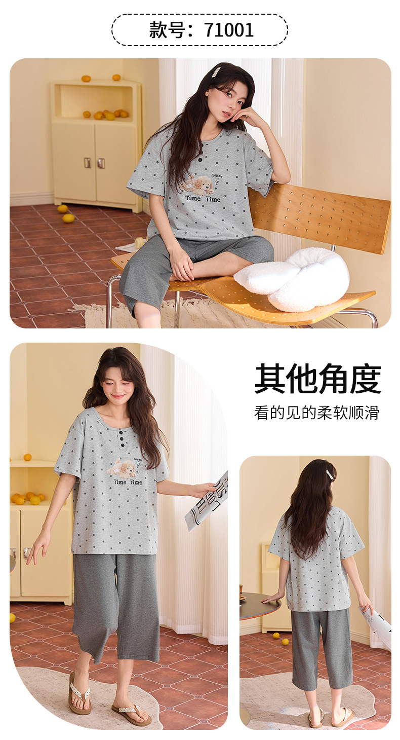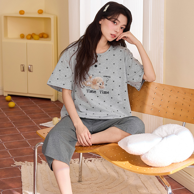 100% 면 잠옷 여성 반팔 크롭 팬츠 한국 여름 새로운 느슨한 캐주얼 학생 홈웨어 세트 얇은스토어 가기
