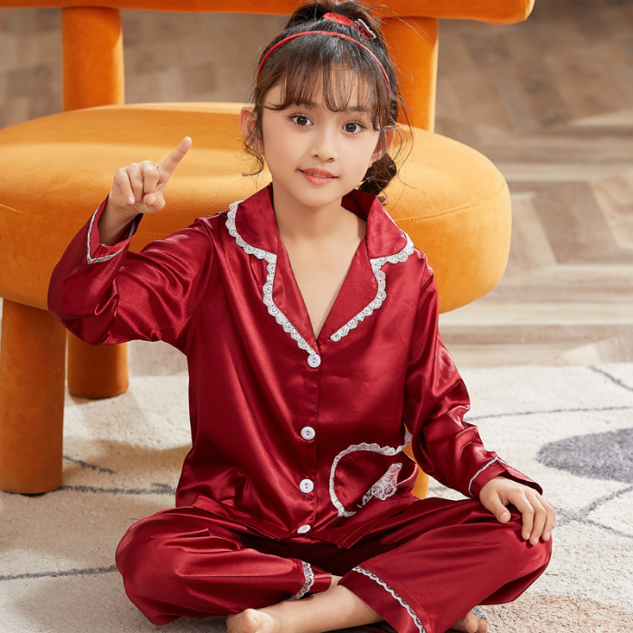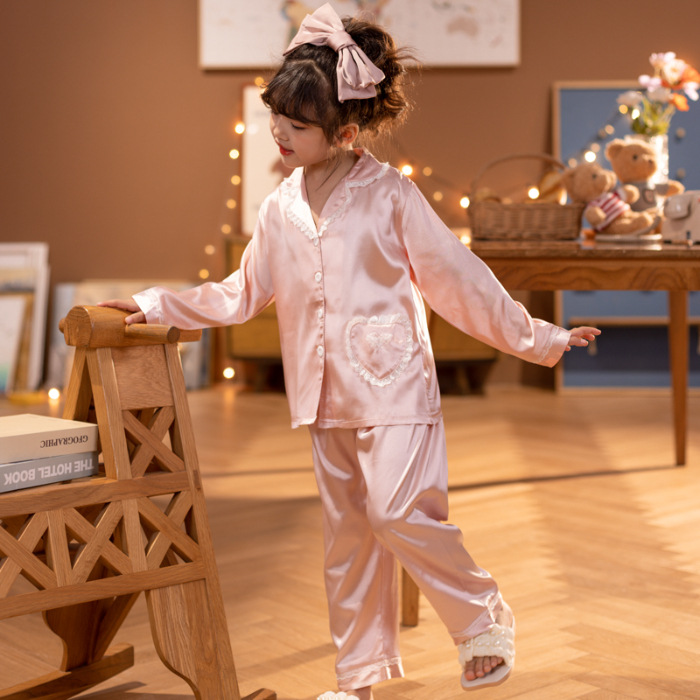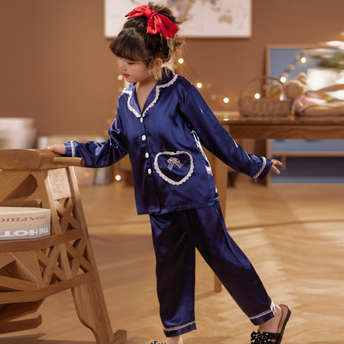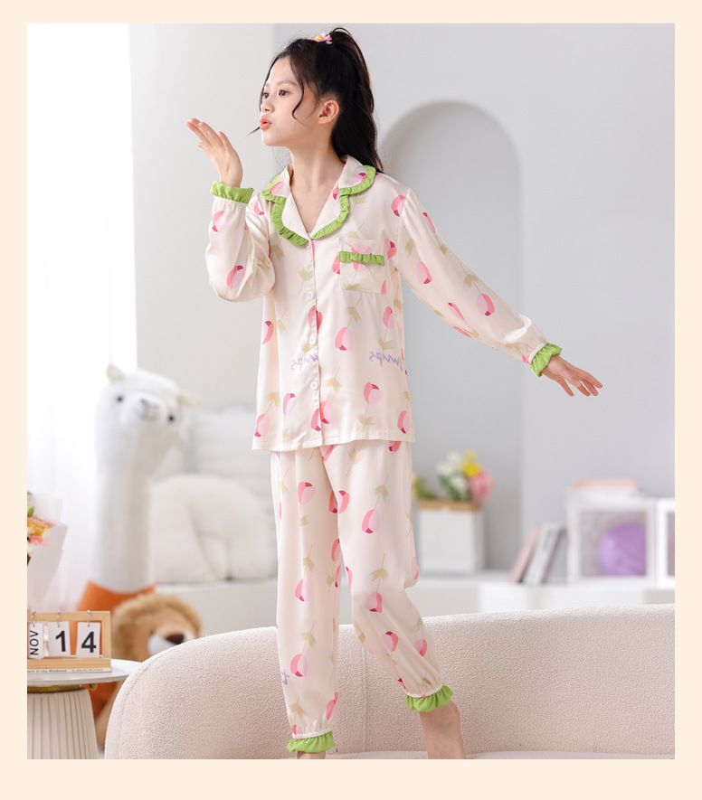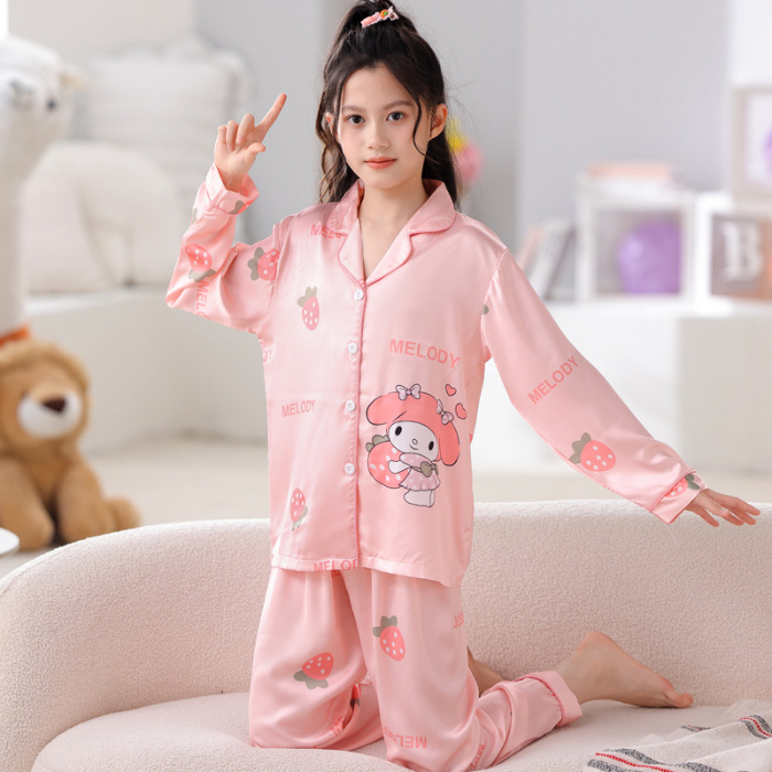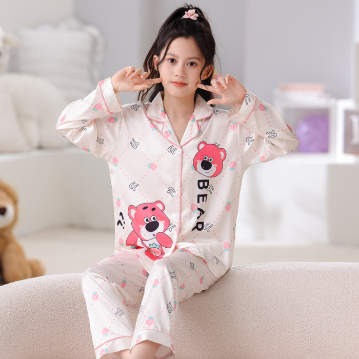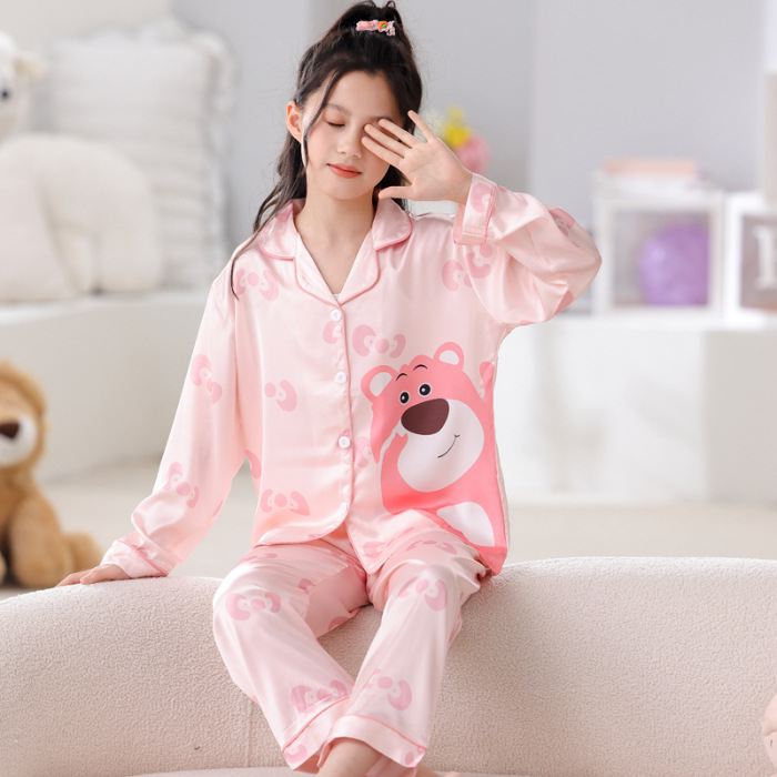 어린이 잠옷 봄과 가을 아이스 실크 소녀들의 귀여운 만화 긴팔 실크 부모-자식 서양식 어린이 홈웨어