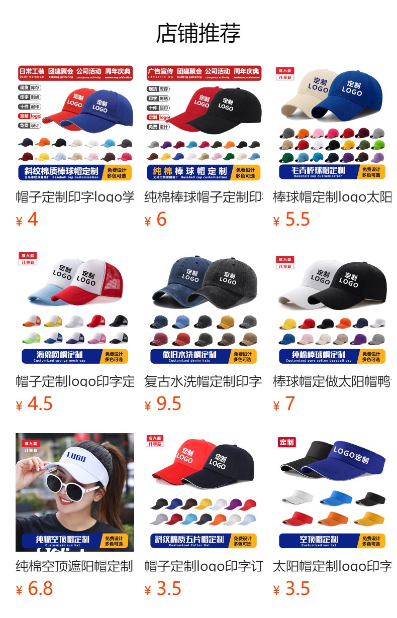 拍下默认纯色,印字logo费用另算,印标+2元/顶 刺绣+3元/顶