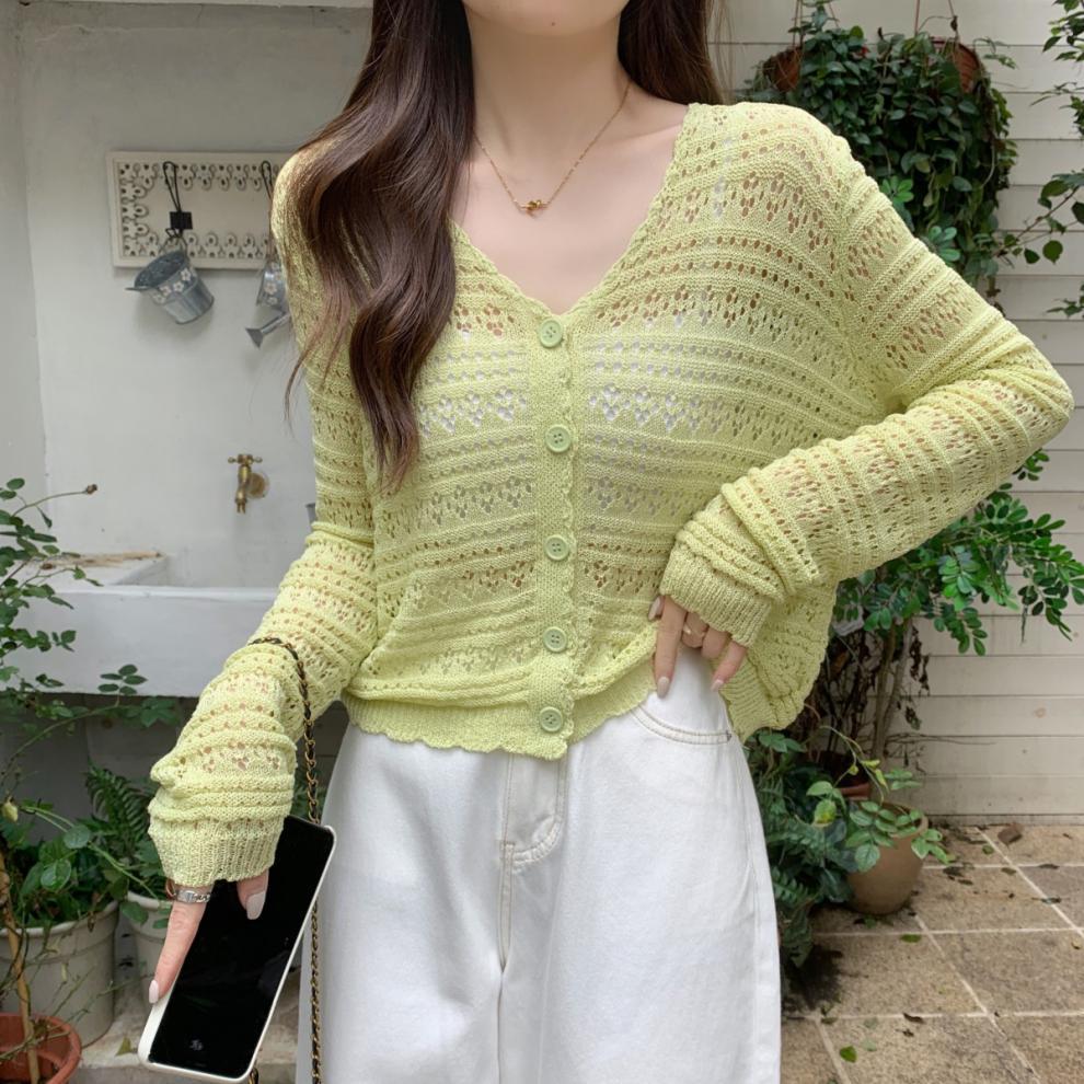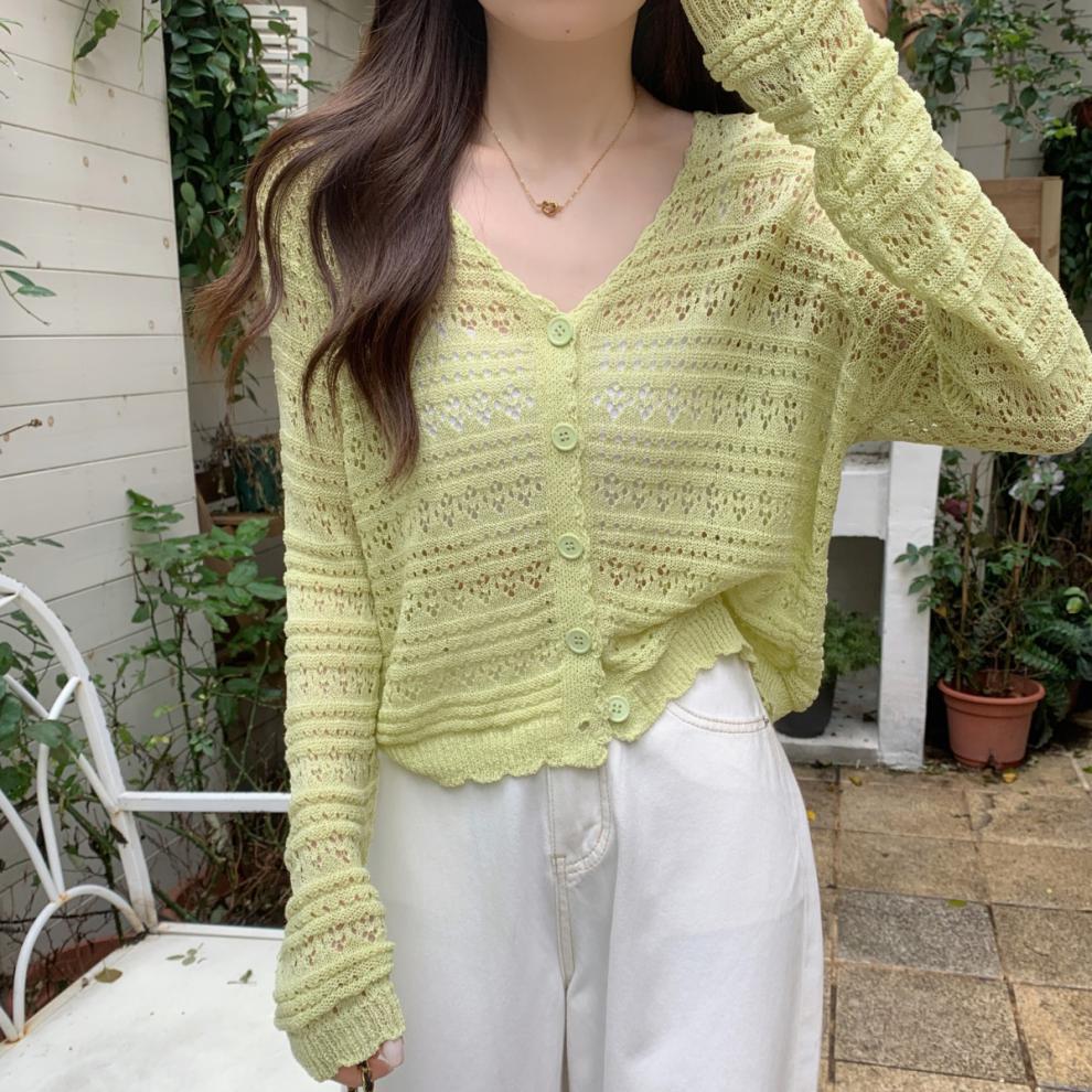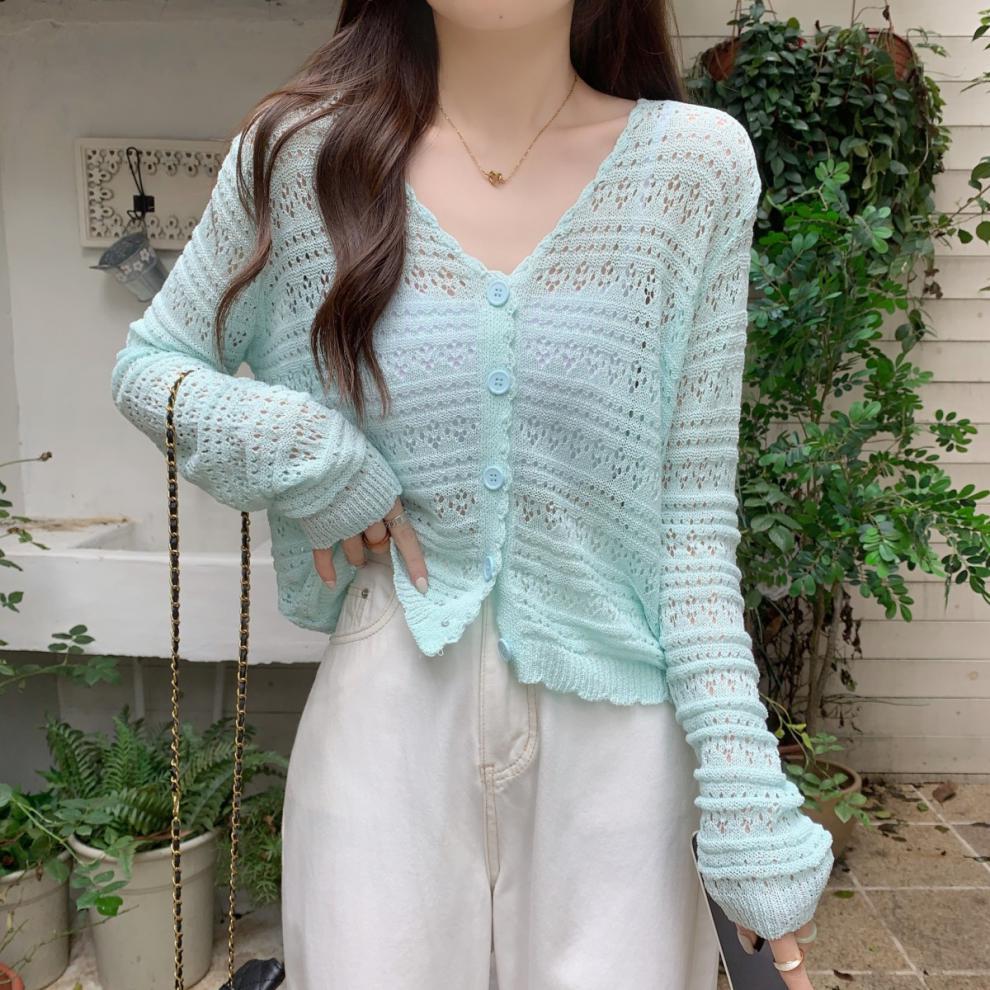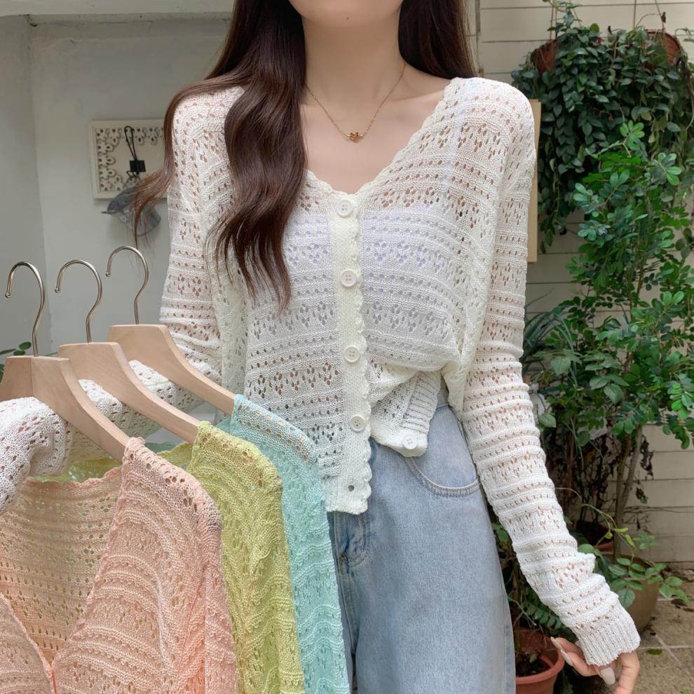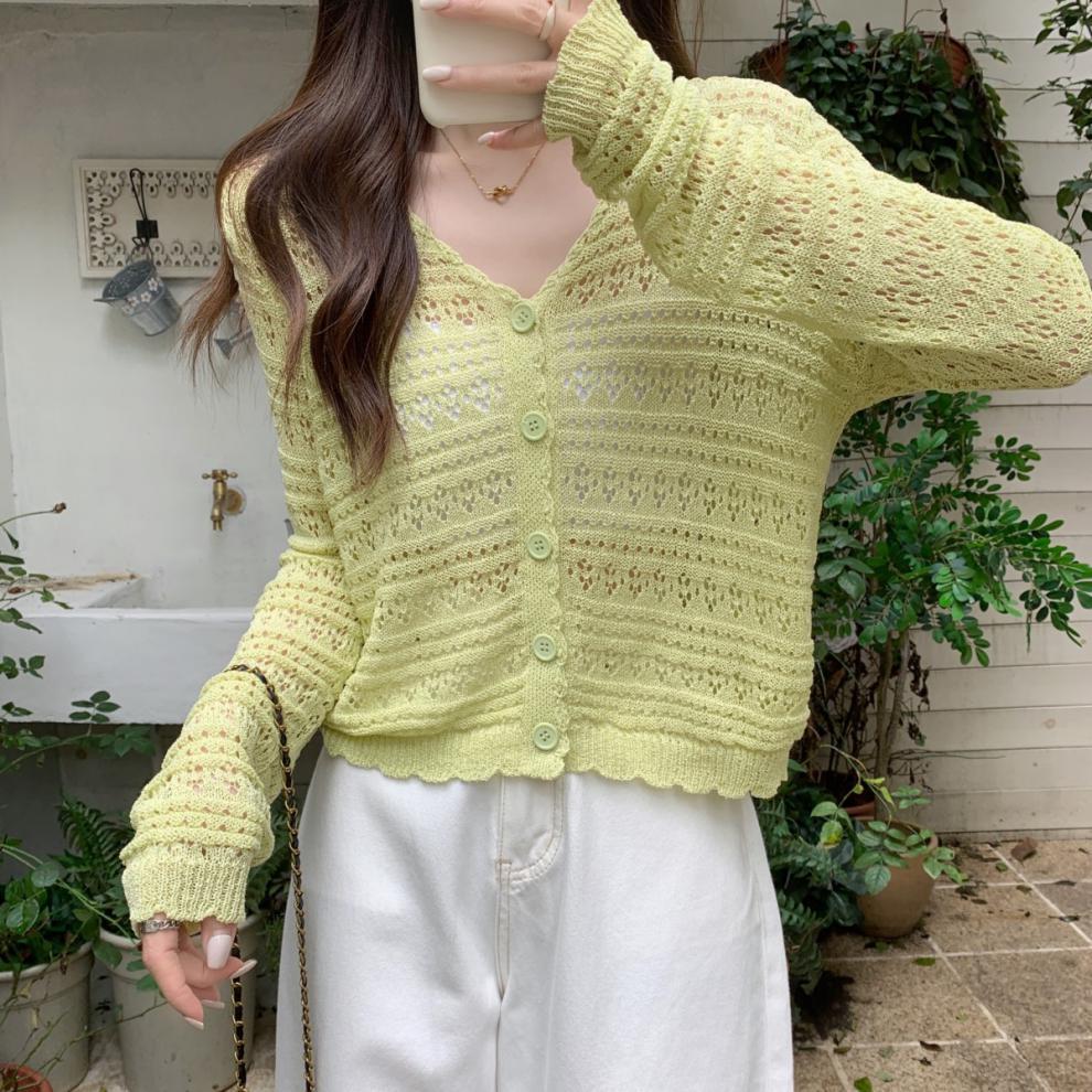 여름 니트 카디건 얇은 여성용 코트 2024 새로운 짧은 V-Neck 할로우 니트 블라우스 아우터 탑스토어 가기