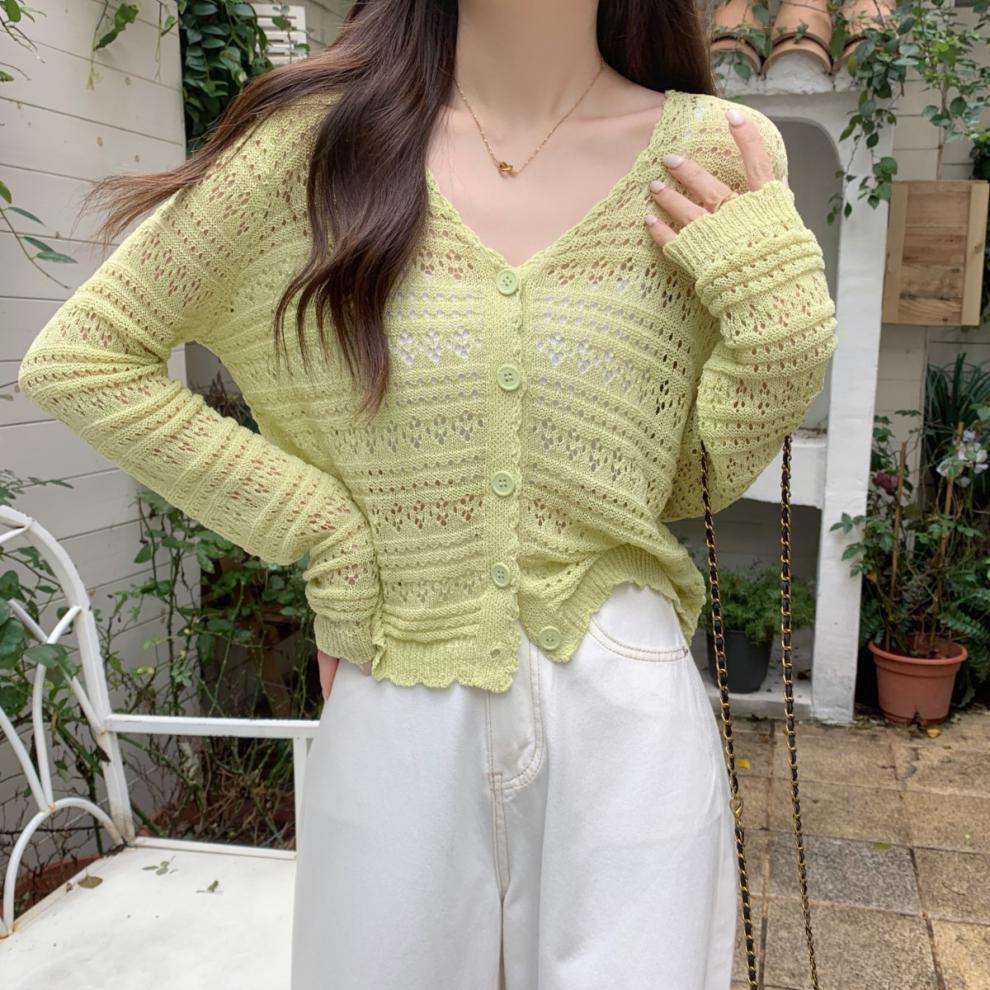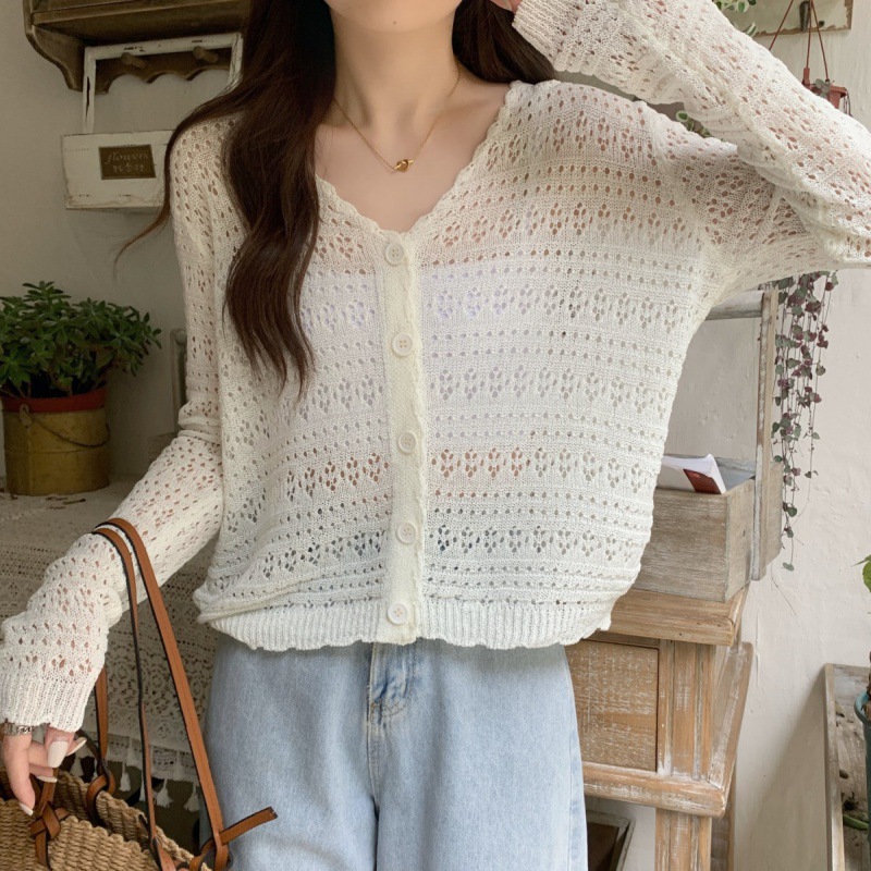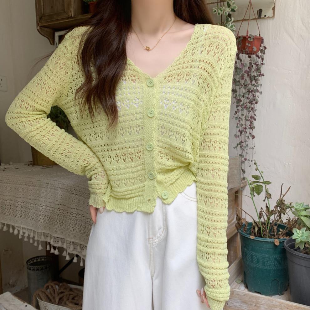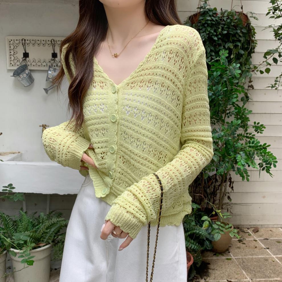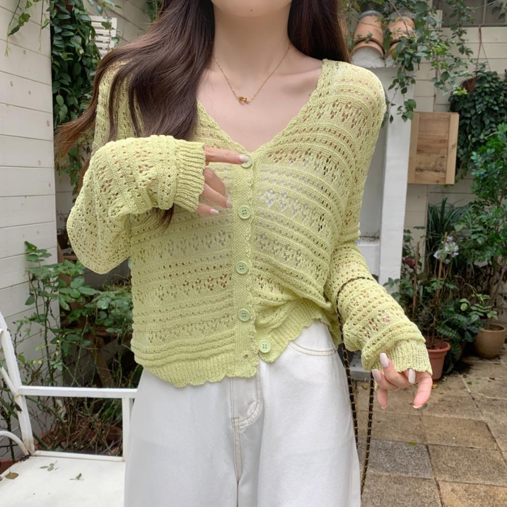 여름 니트 카디건 얇은 여성용 코트 2024 새로운 짧은 V-Neck 할로우 니트 블라우스 아우터 탑스토어 가기