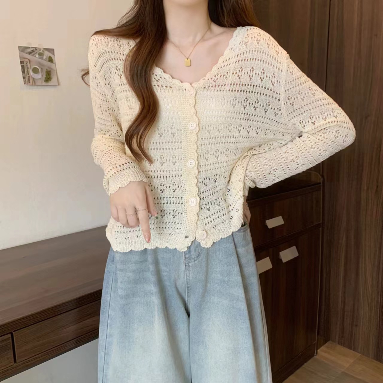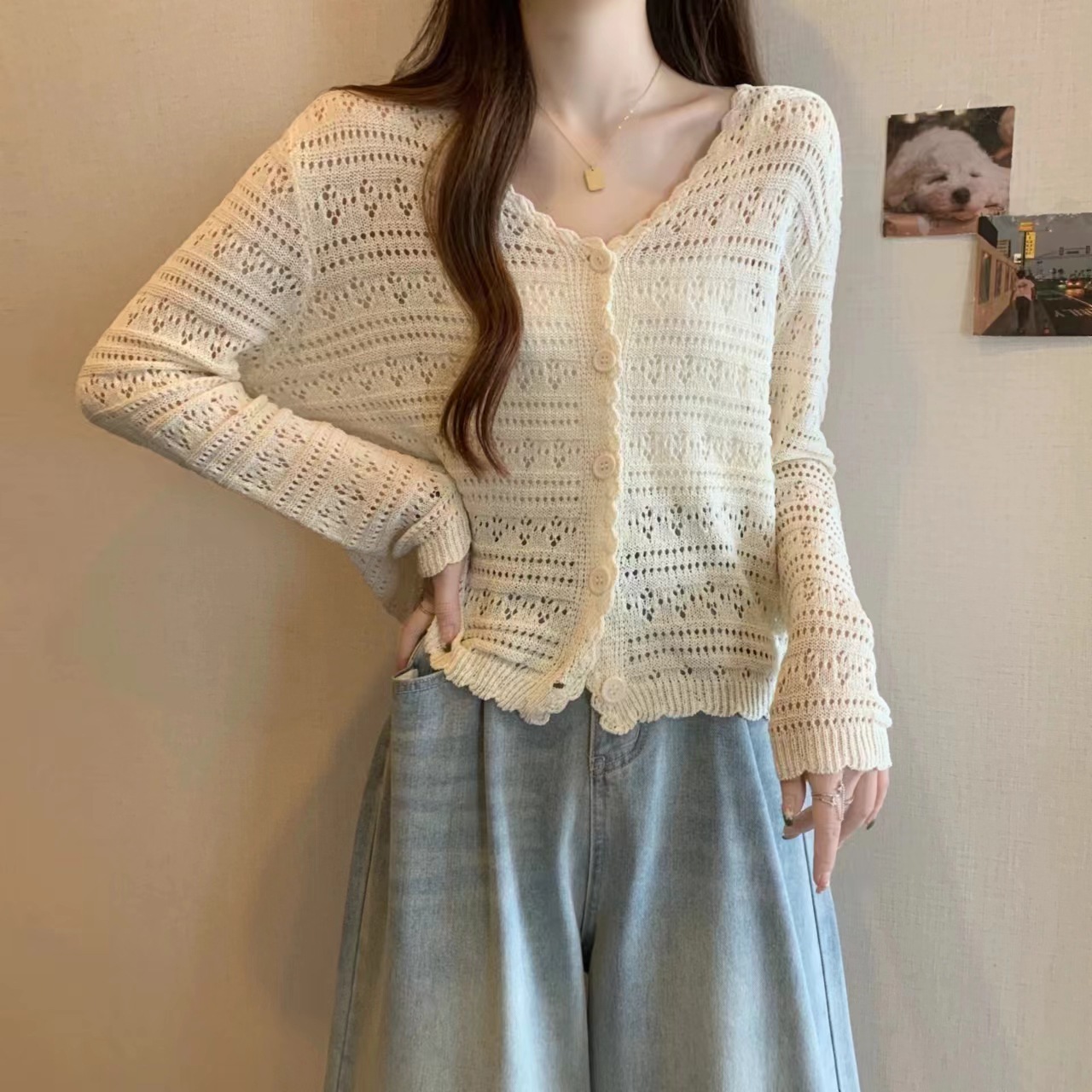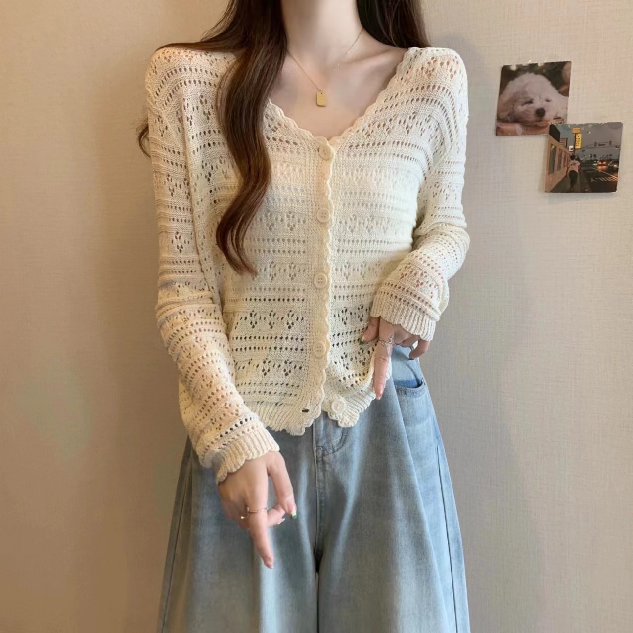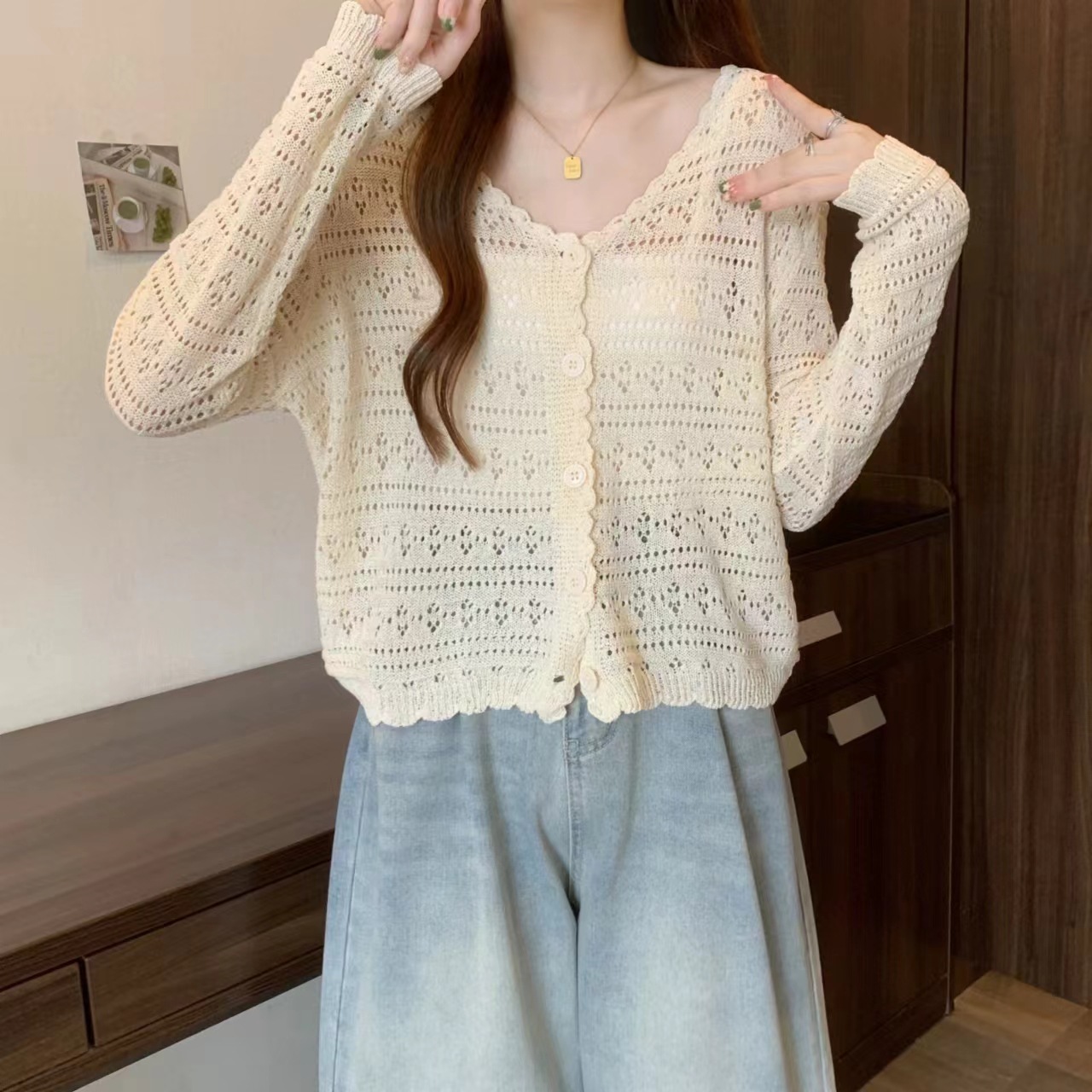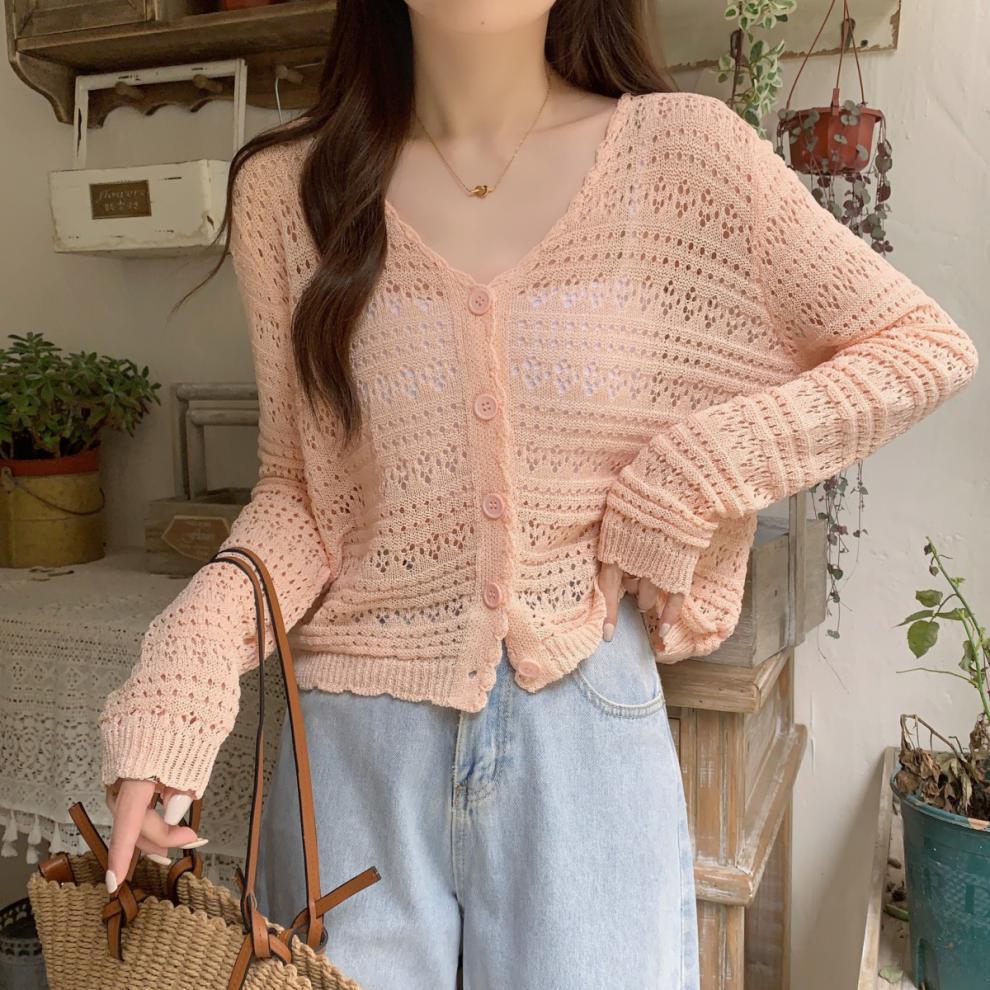 여름 니트 카디건 얇은 여성용 코트 2024 새로운 짧은 V-Neck 할로우 니트 블라우스 아우터 탑
