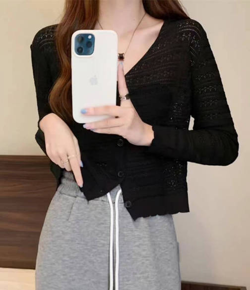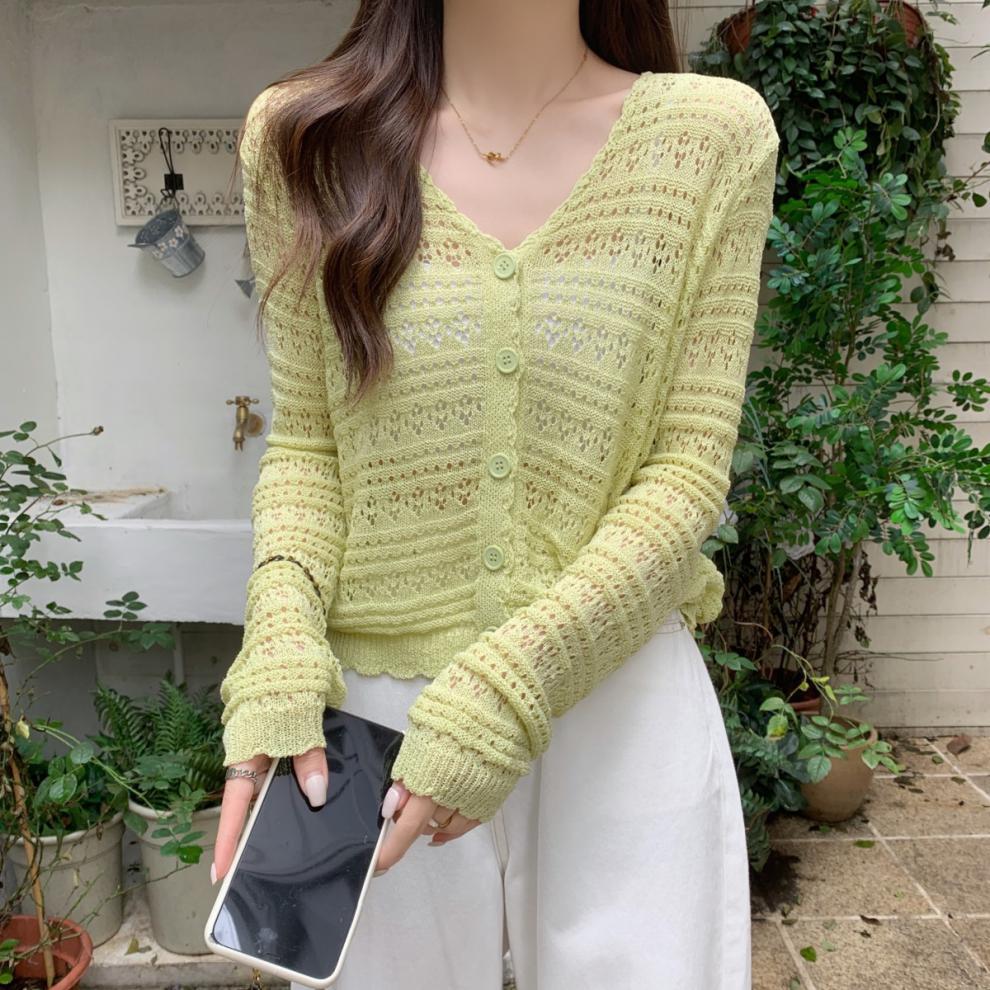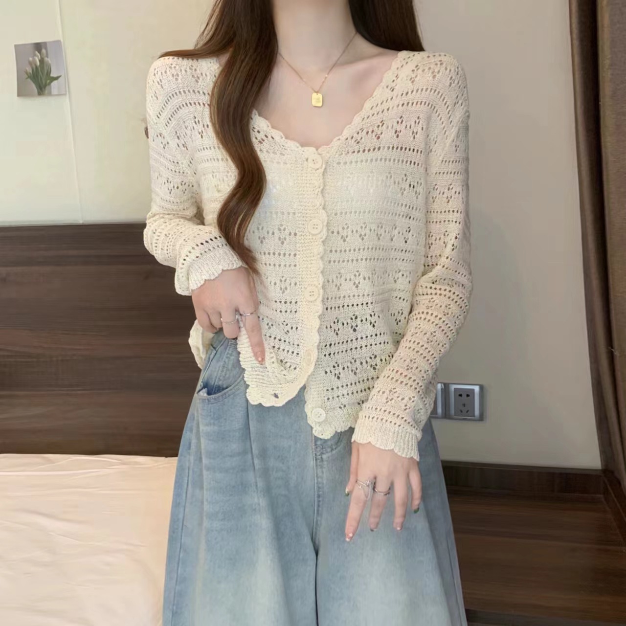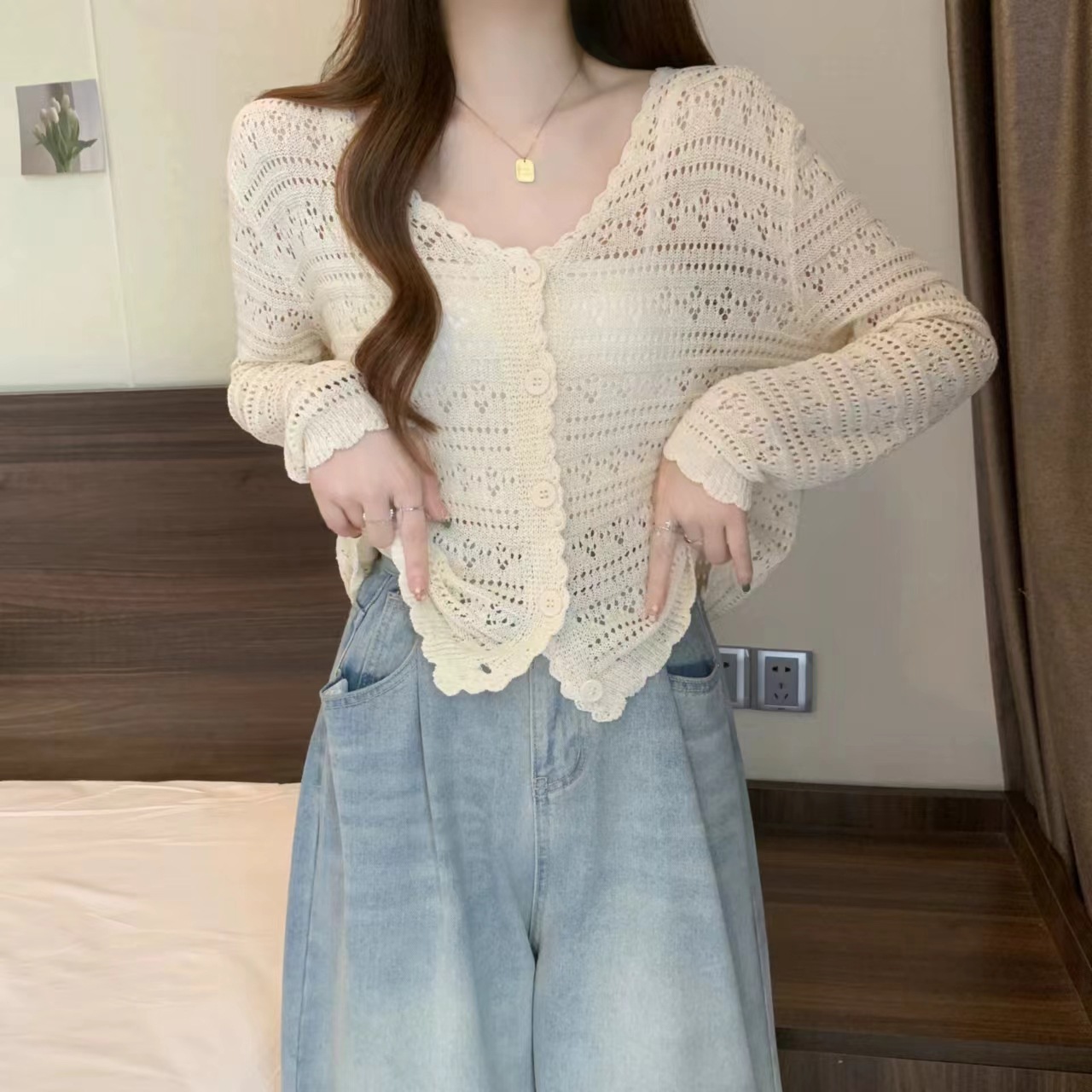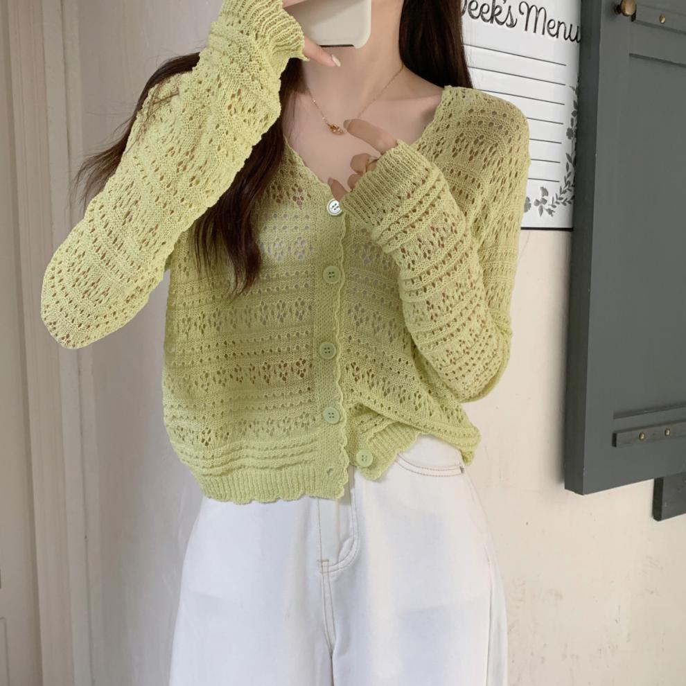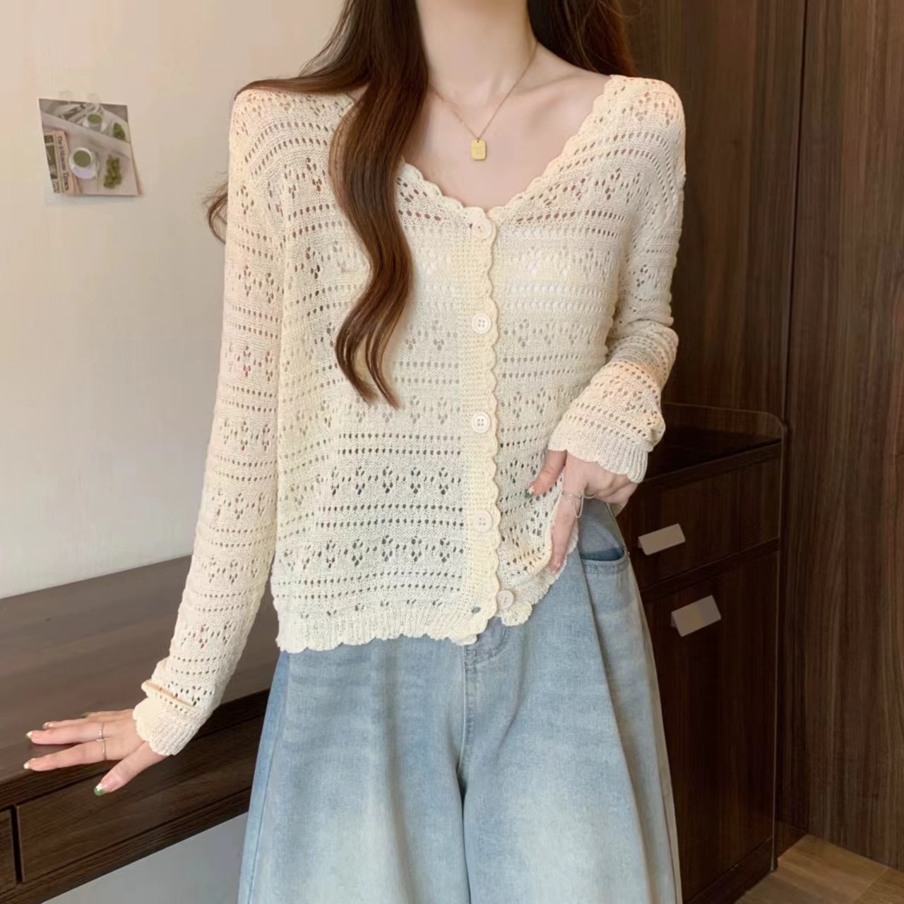 여름 니트 카디건 얇은 여성용 코트 2024 새로운 짧은 V-Neck 할로우 니트 블라우스 아우터 탑