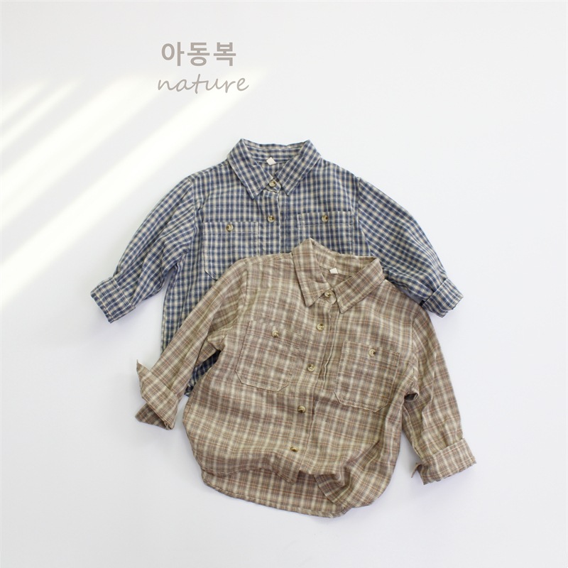2025 어린이 셔츠 봄 소녀 셔츠 클래스 한국어 스타일 옷깃 격자 무늬 소년 탑 순수 코튼 긴팔 도매스토어 가기