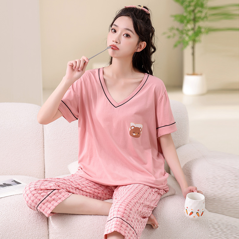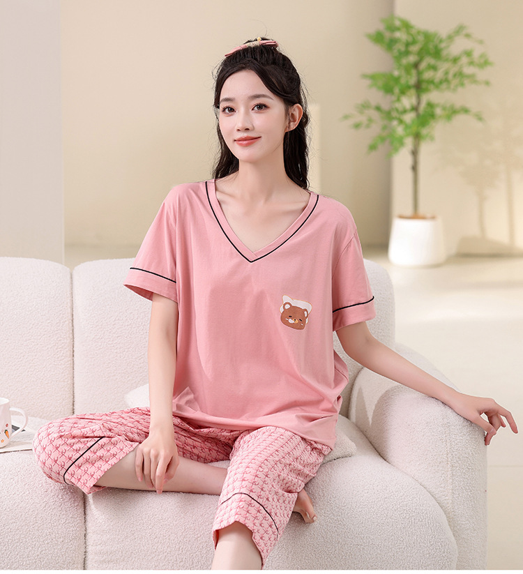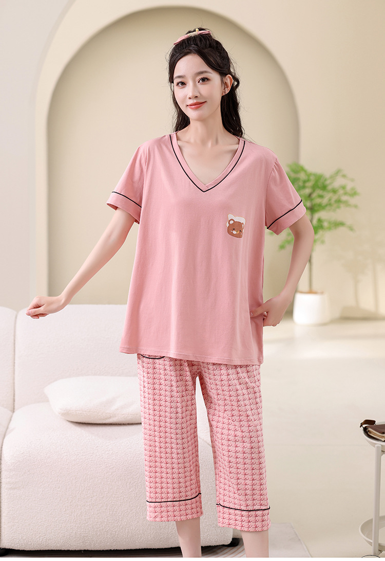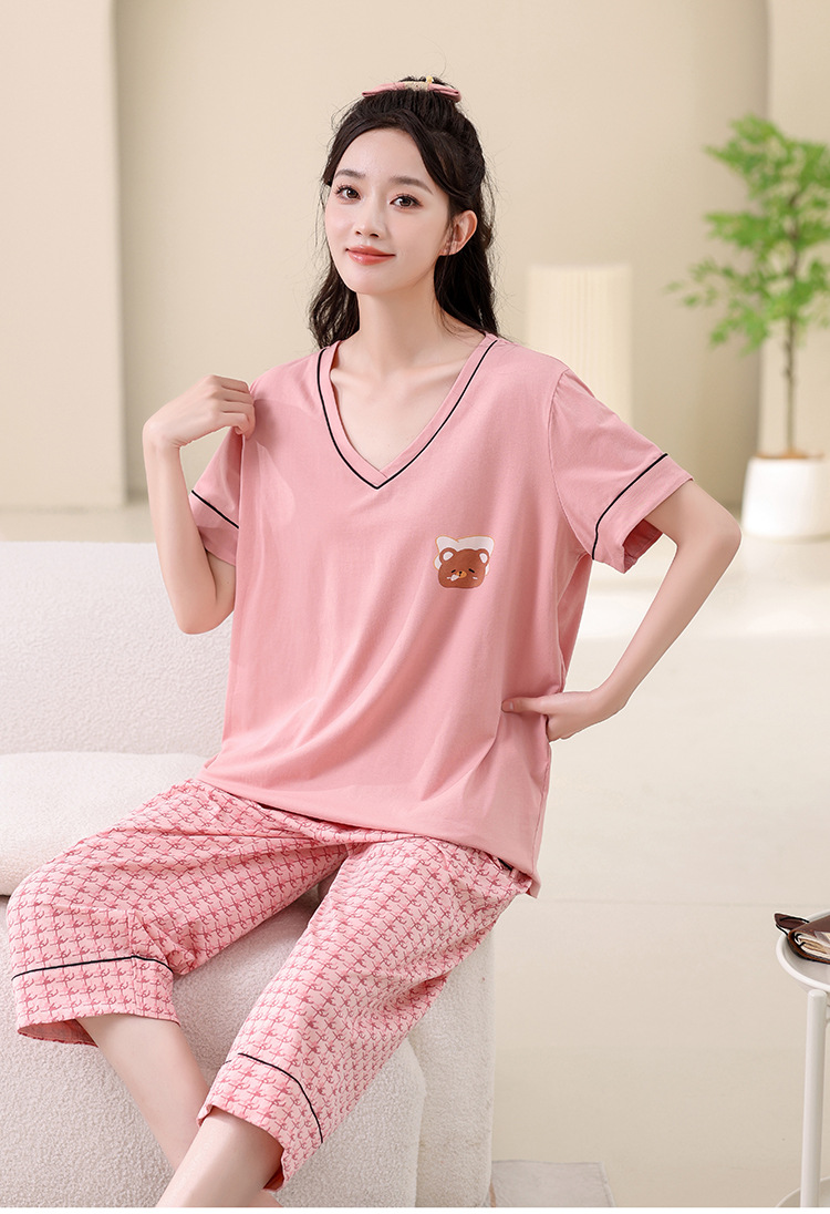 여름 플러스 사이즈 만화 홈웨어 여성용 프린트 파자마 반팔 크롭 팬츠 얇은 V 넥 느슨한 투피스 세트스토어 가기
