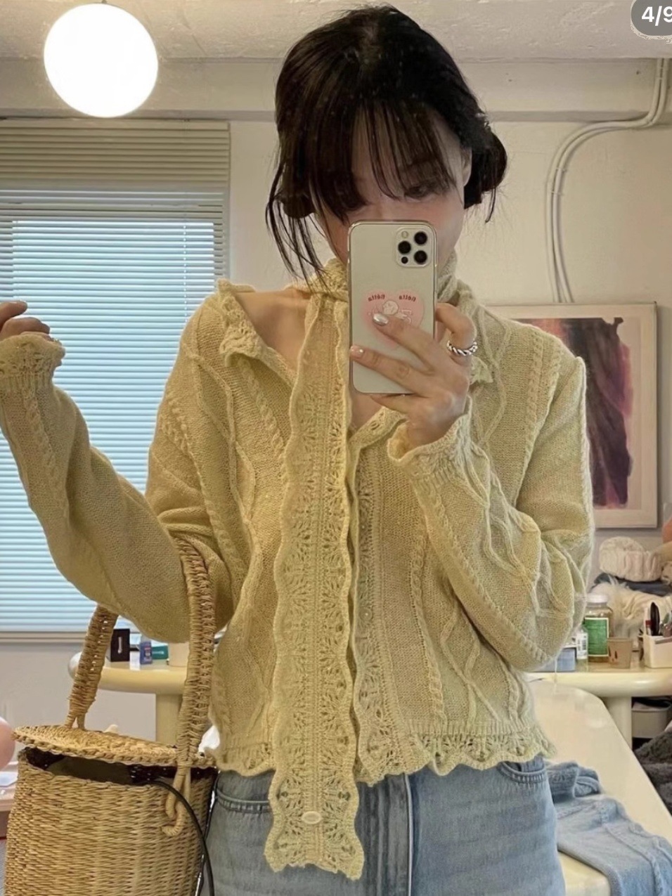 韩国 fl*ta 24早春新款 花边领长袖针织 毛衣开衫