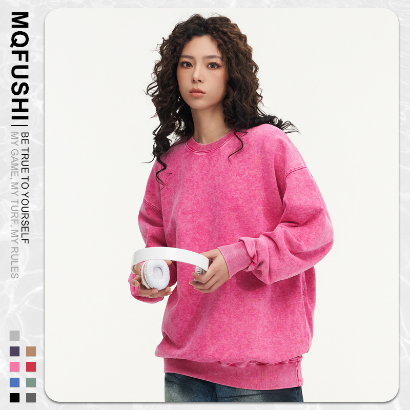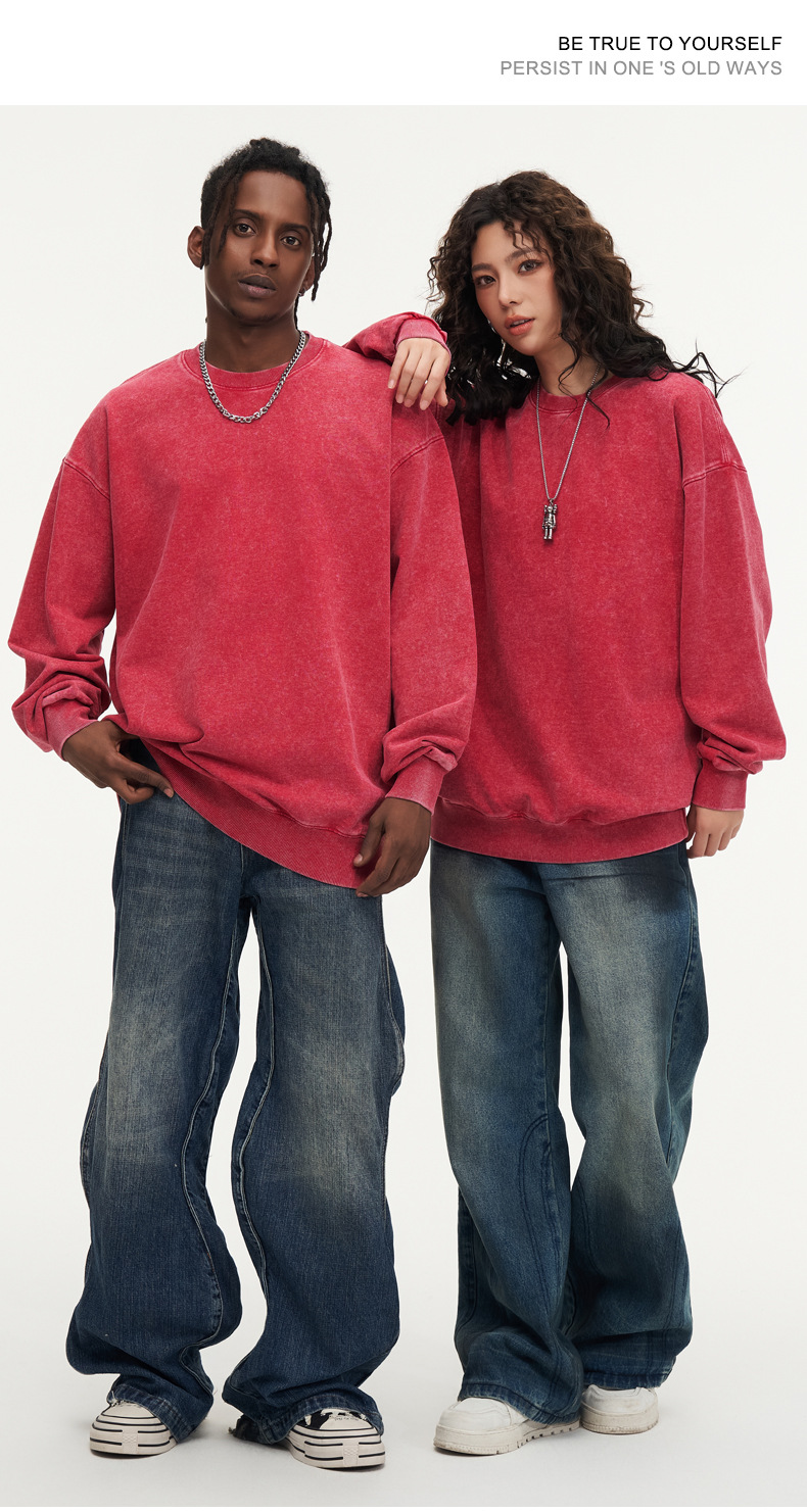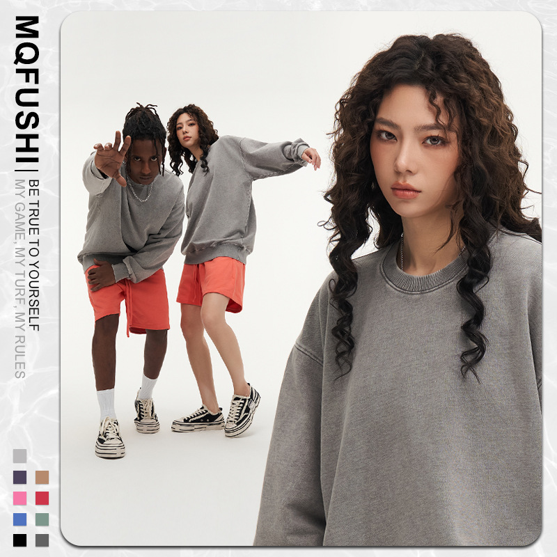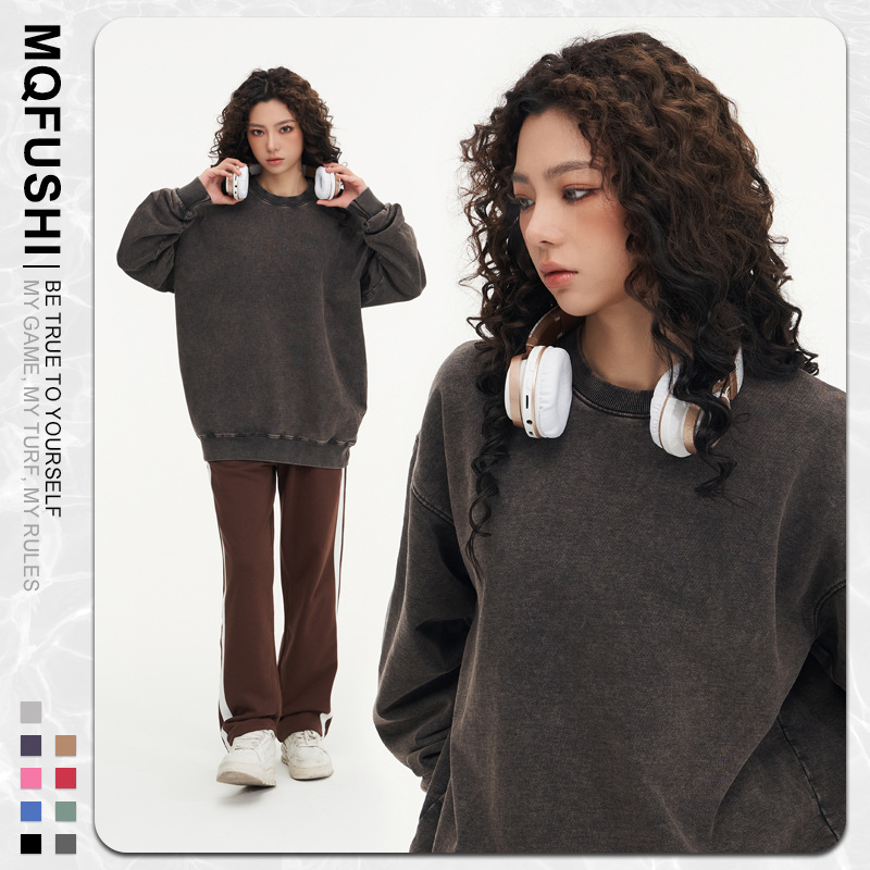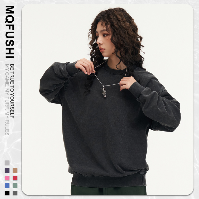 봄가을 425g 순면 왁스염색 워싱 빈티지 라운드넥 스웨트셔츠 루즈핏 블랙 풀오버 남성 유럽 사이즈 커플룩