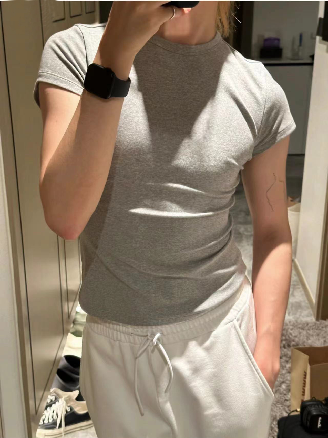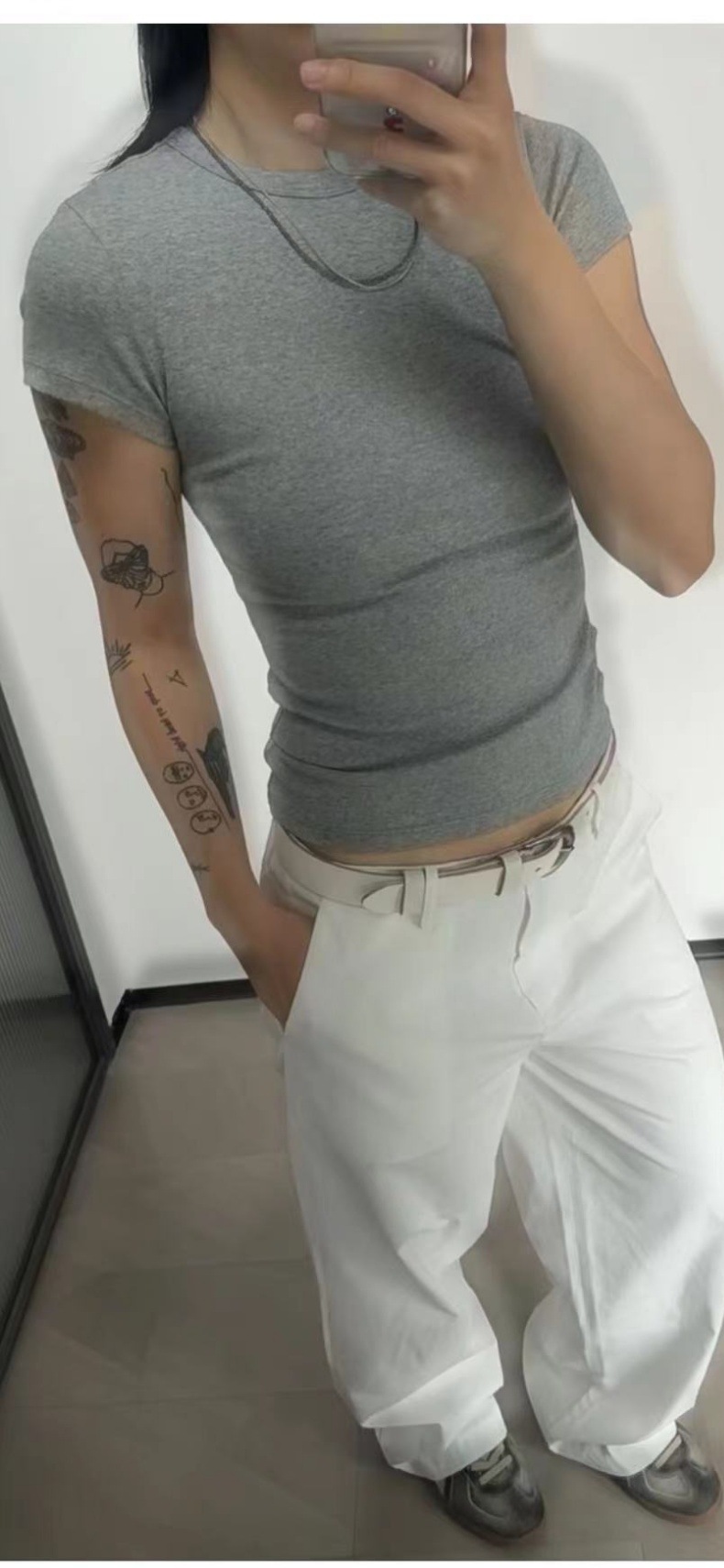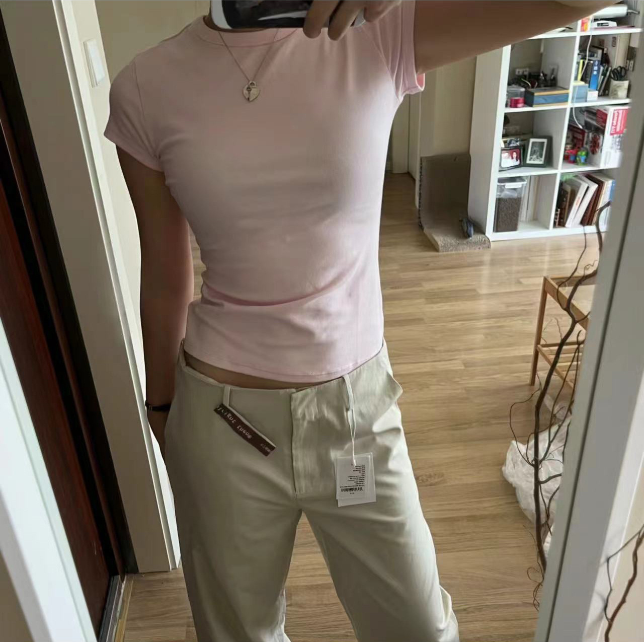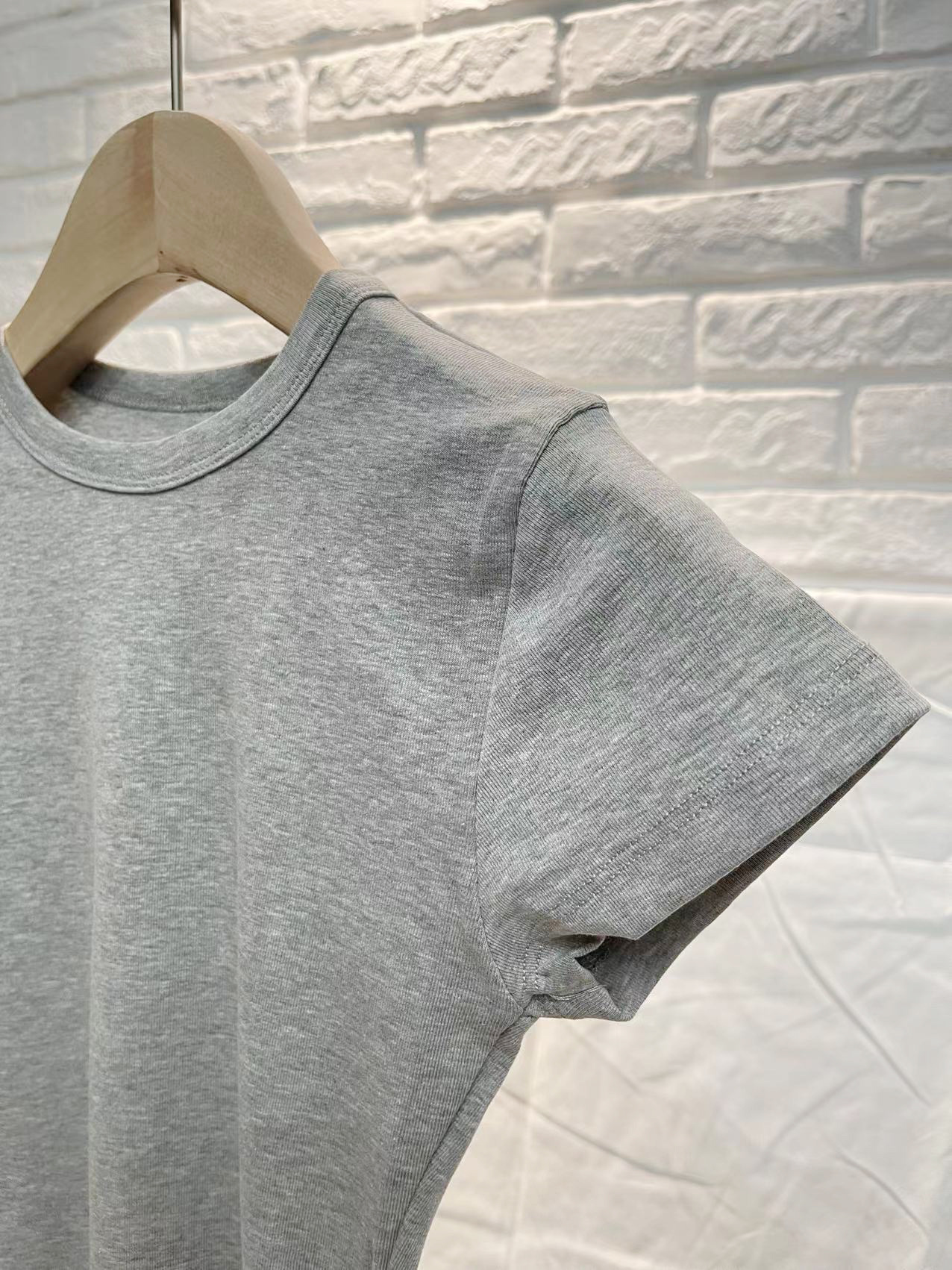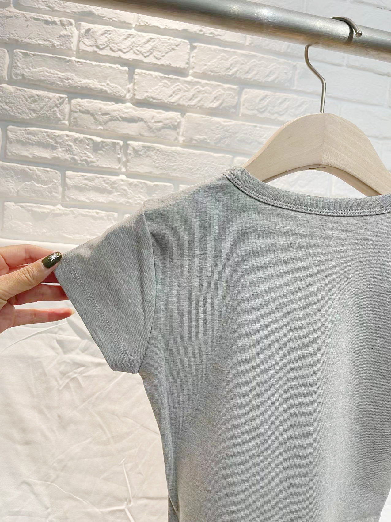 틈새 alrigh*t 기본 오른쪽 어깨 슬림 반팔 코튼 티셔츠 여성 클린핏 봄 여름 라운드 넥 자수 탑