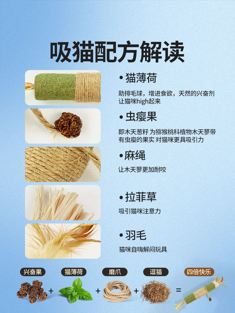 产品材质:拉菲草+虫瘿果+木天蓼+薄荷+棉绳