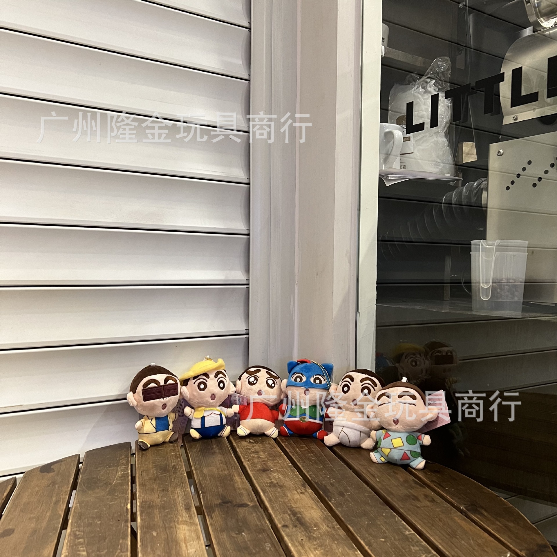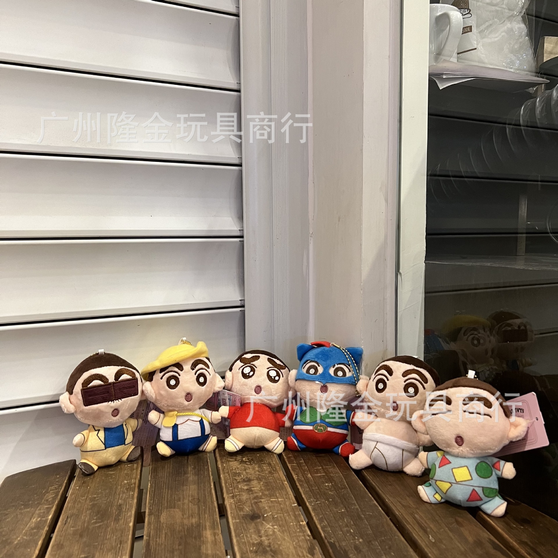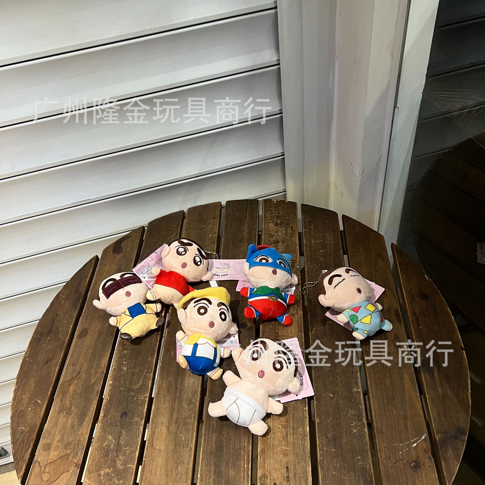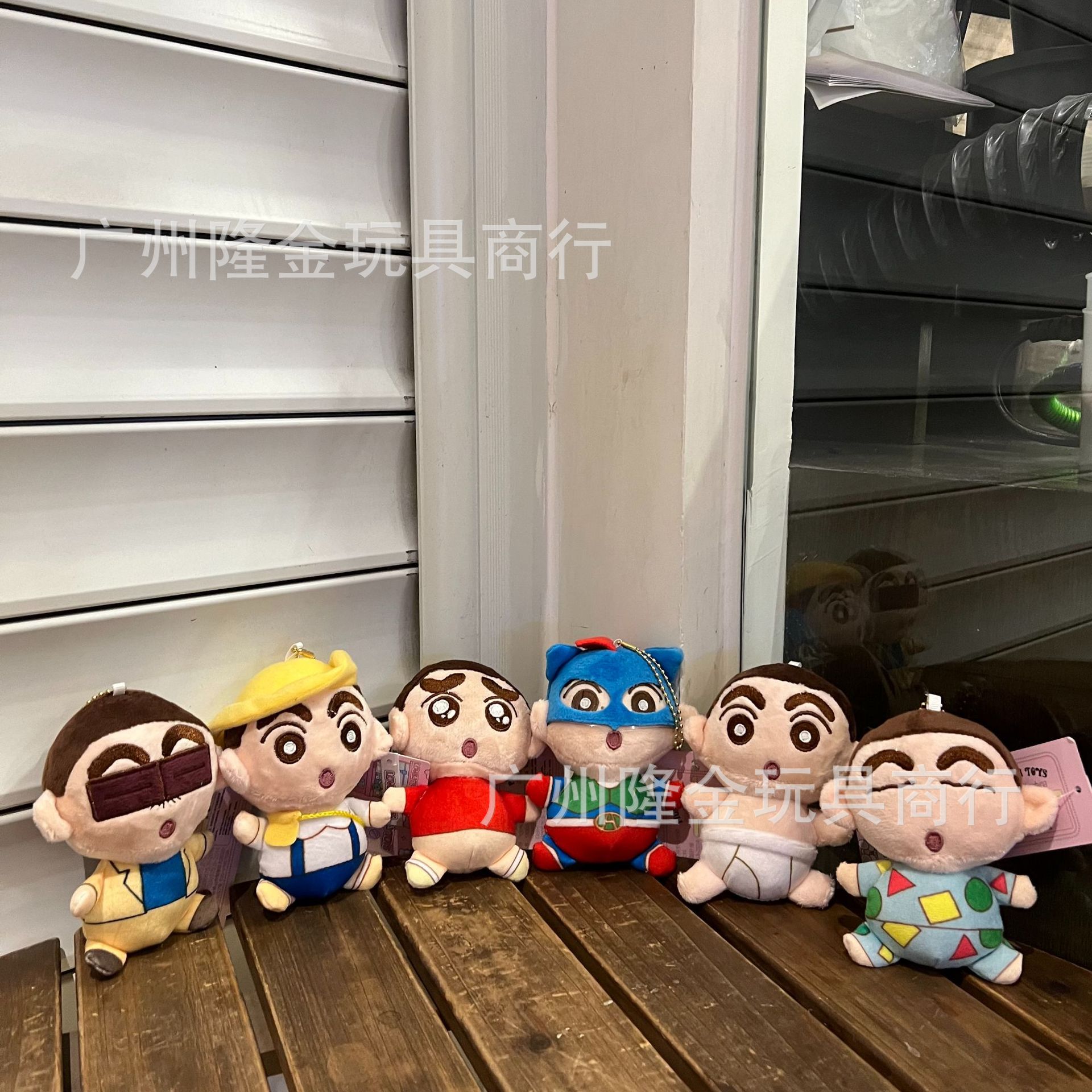 재고 만화 만화 귀여운 잠옷 크레용 작은 새로운 흰색 봉제 인형 가방 펜던트 비디오 게임 도시 인형 잡기 기계스토어 가기