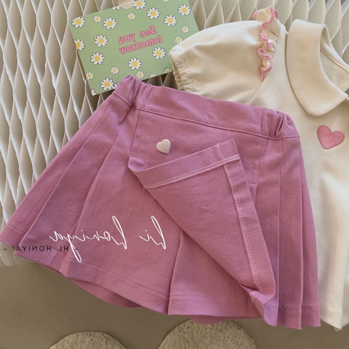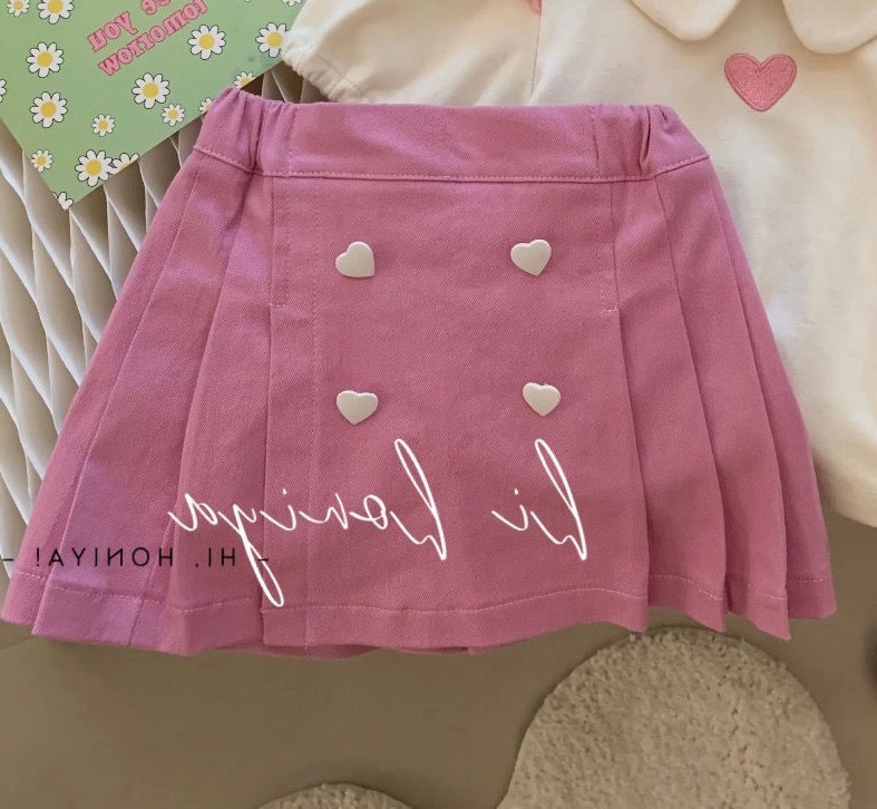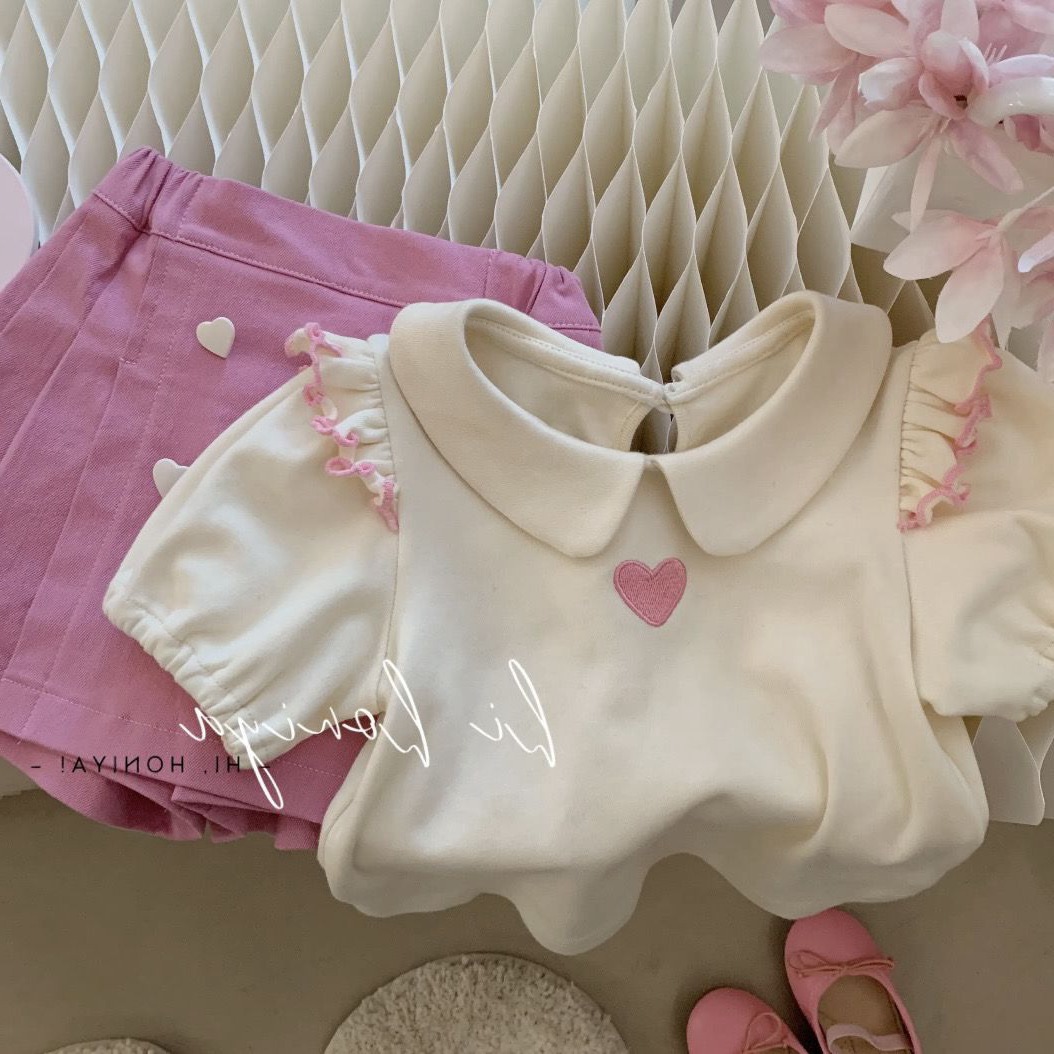 소녀 세트 2024 여름 옷 소녀 사랑 자수 퍼프 소매 바닥 셔츠 주름 짧은 치마 투피스 세트 95125
