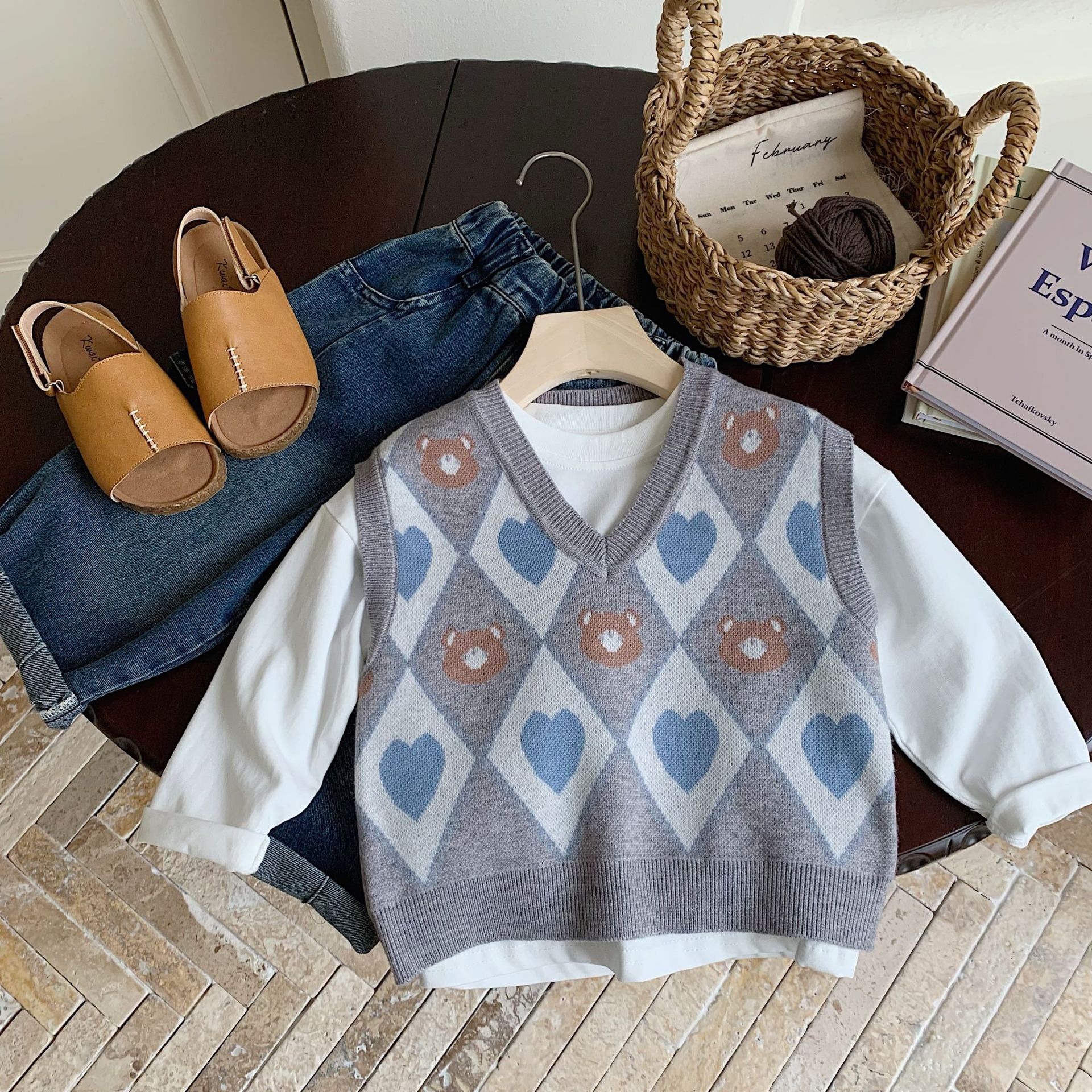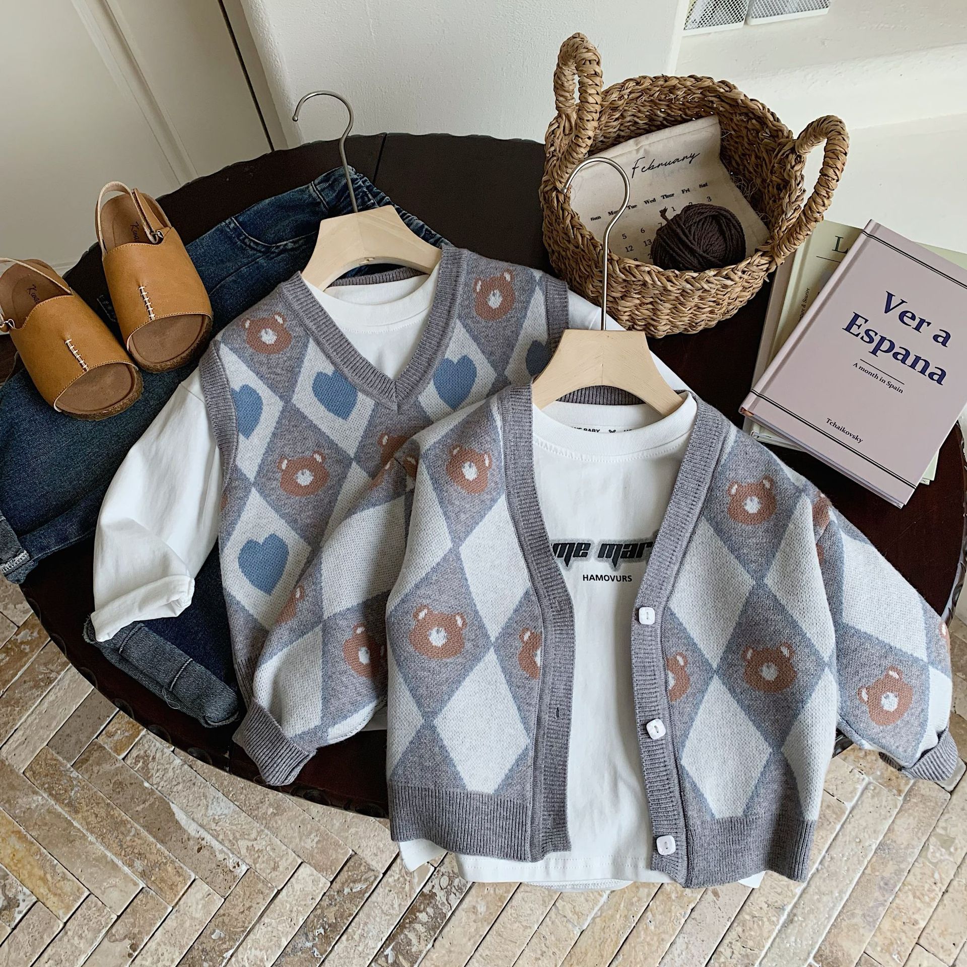어린이 스웨터 Bangcheng 2025 가을 아동복 모직 가디건 다이아몬드 무늬 조끼 남녀공용 곰돌이 조끼 MY0016