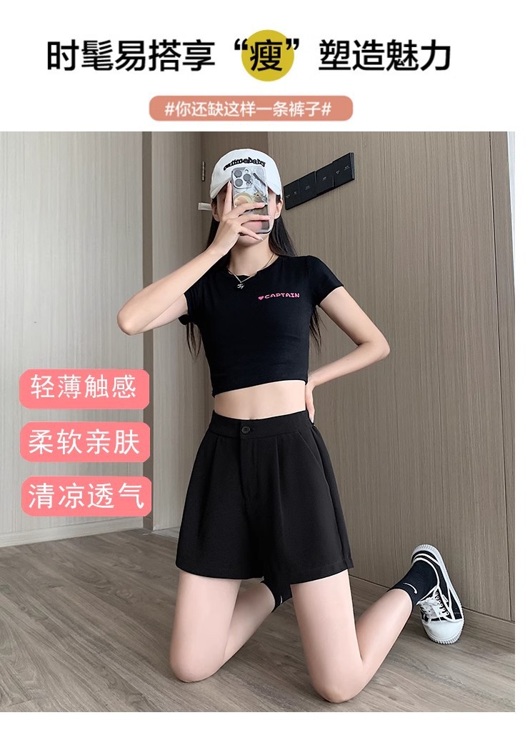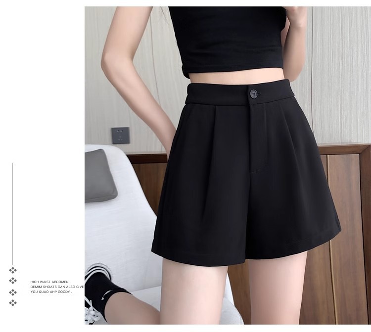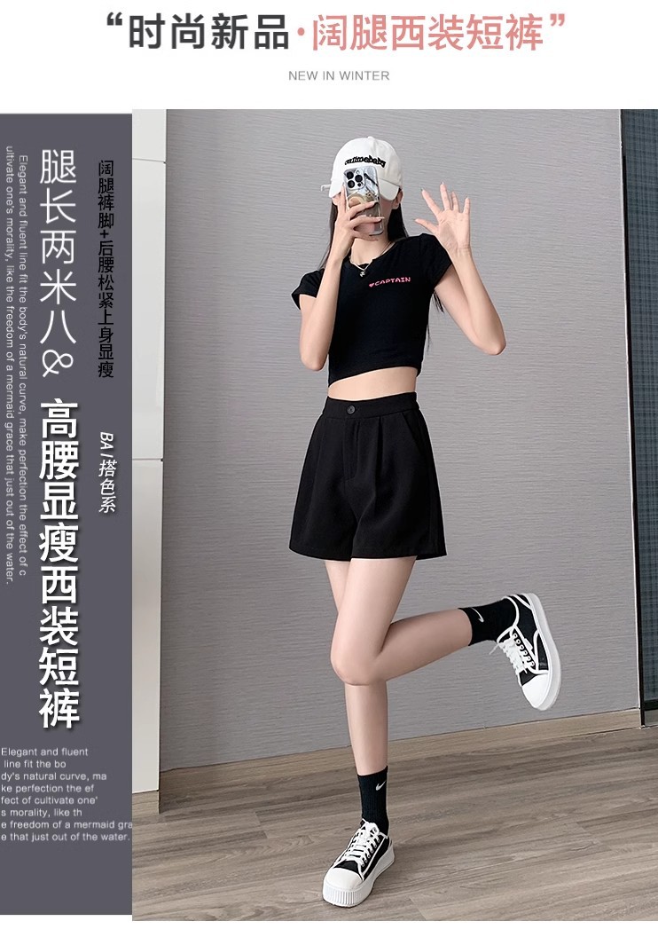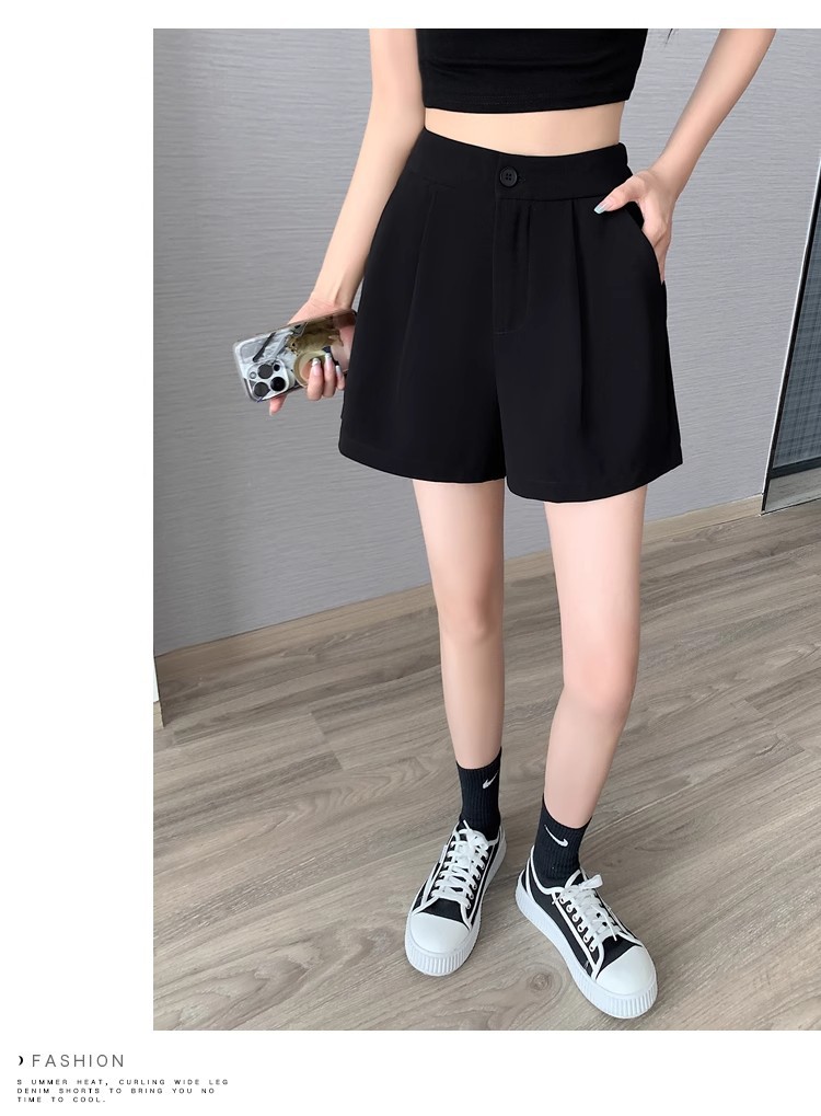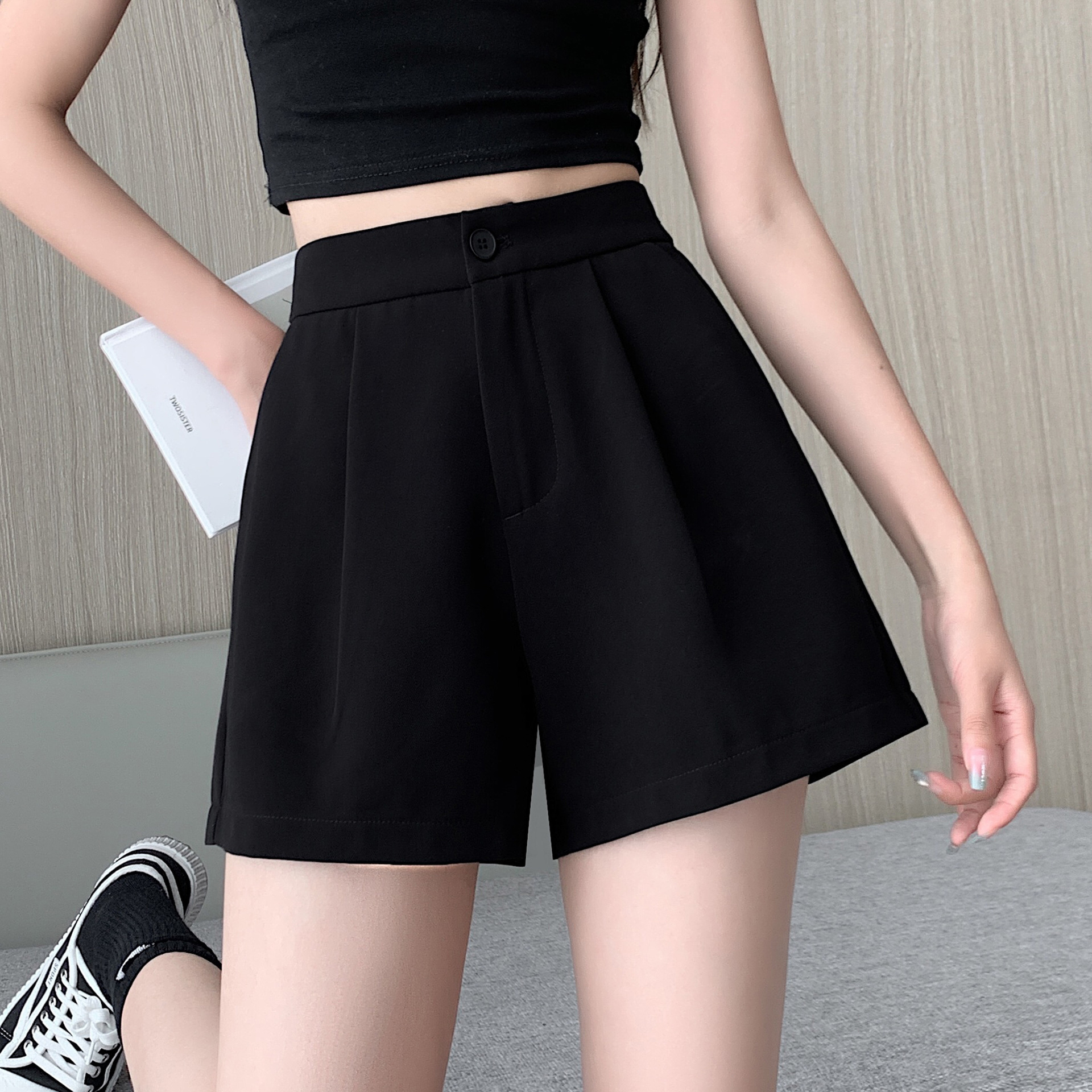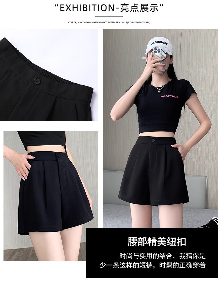 블랙 탄성 하이 허리 캐주얼 세트 반바지 여름 여성 2024 새로운 얇은 느슨한 작은 A 라인 와이드 다리 바지스토어 가기