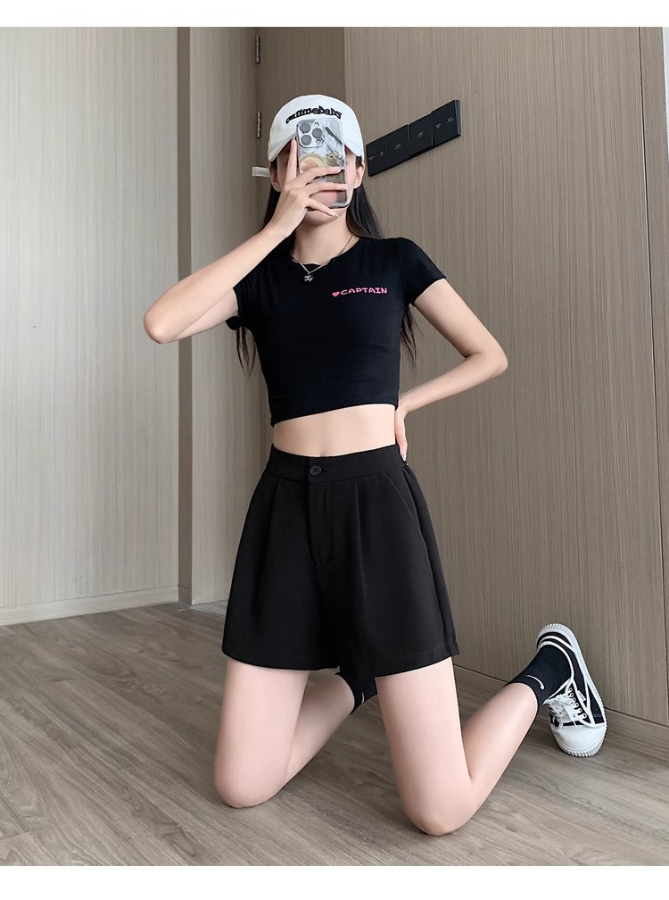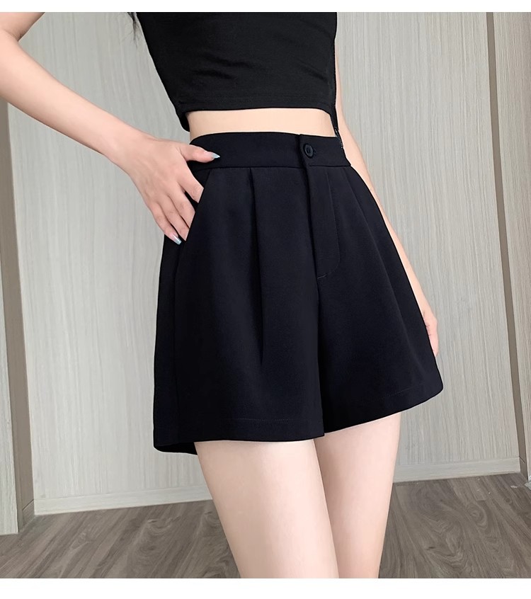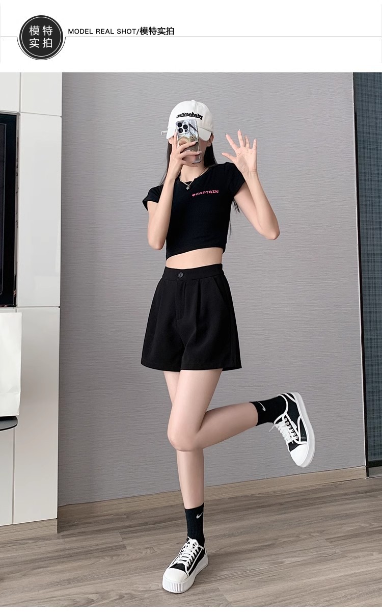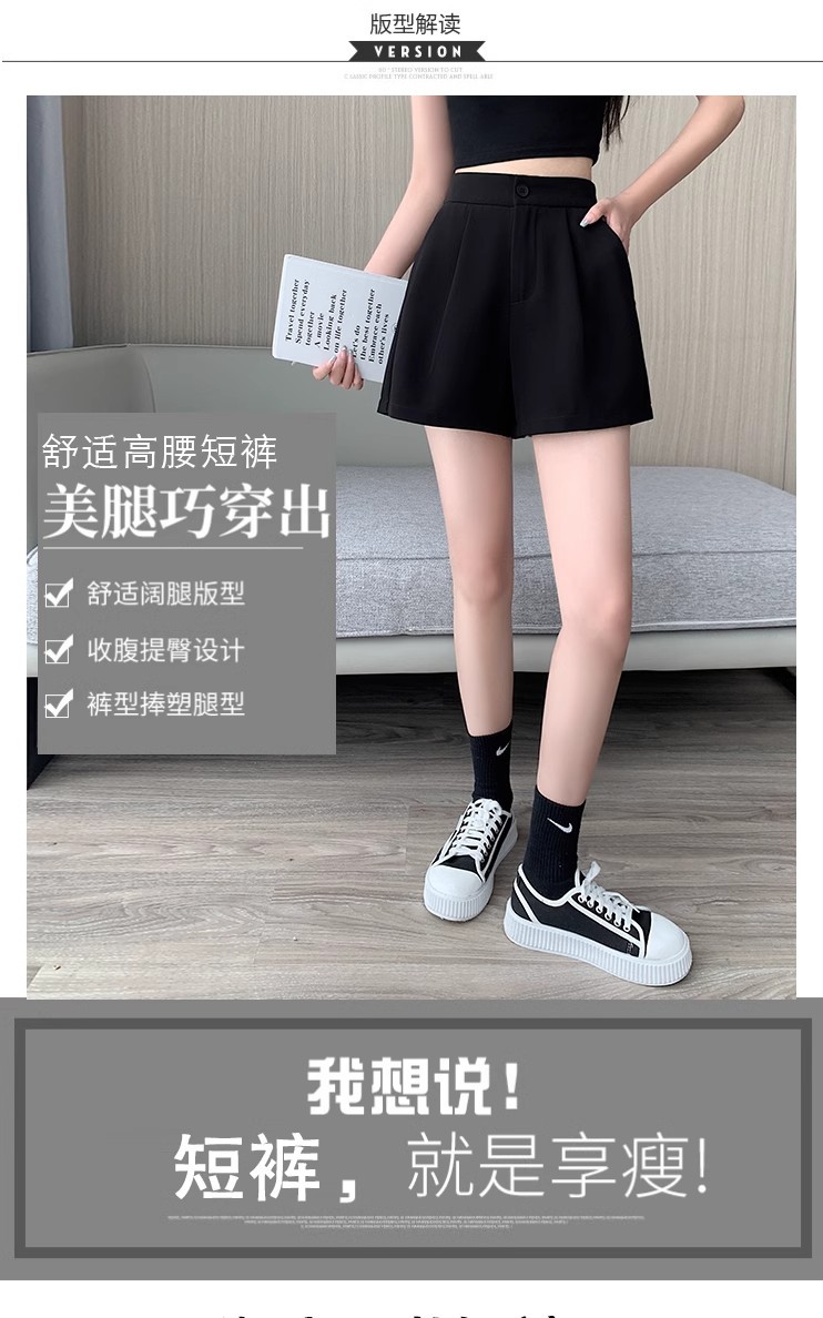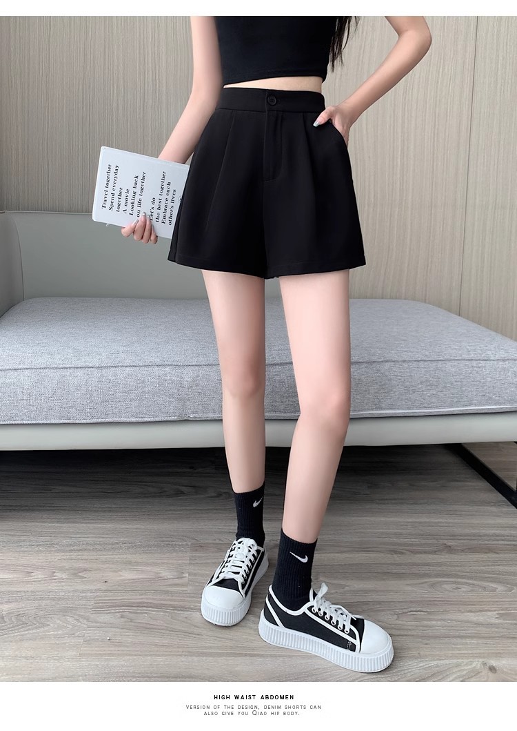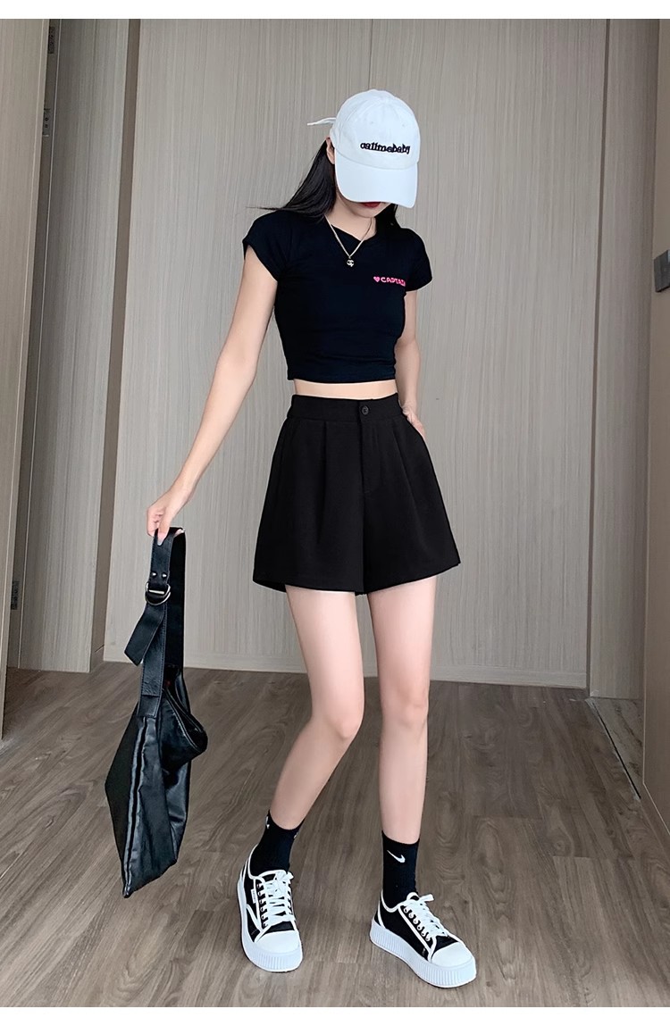 블랙 탄성 하이 허리 캐주얼 세트 반바지 여름 여성 2024 새로운 얇은 느슨한 작은 A 라인 와이드 다리 바지스토어 가기