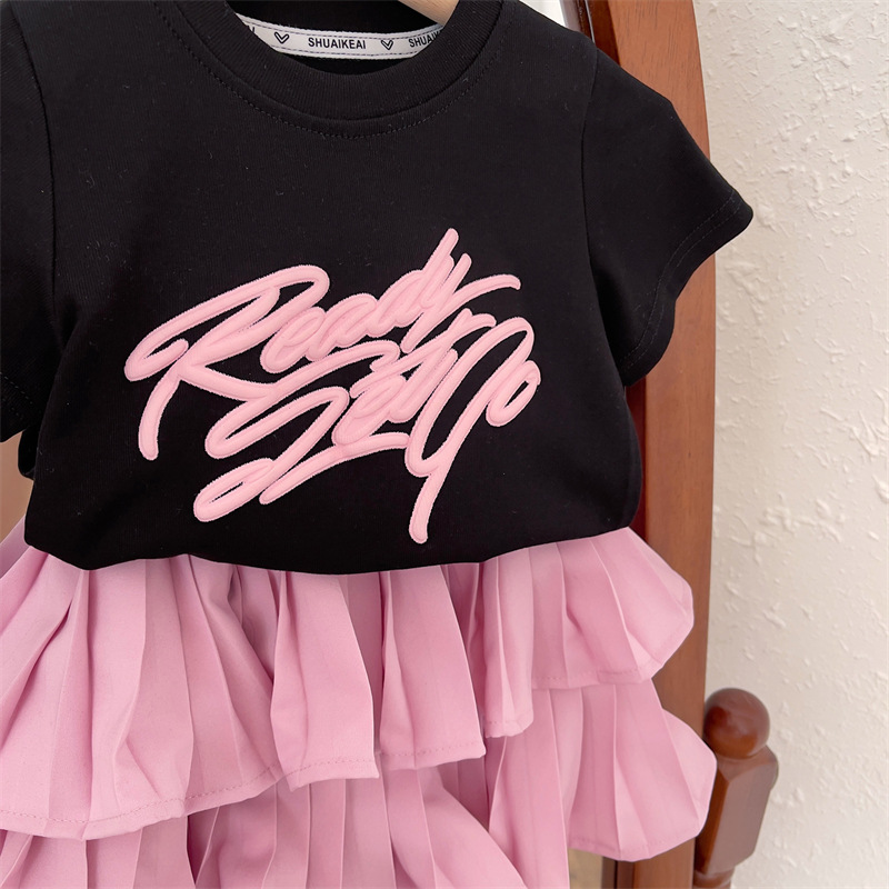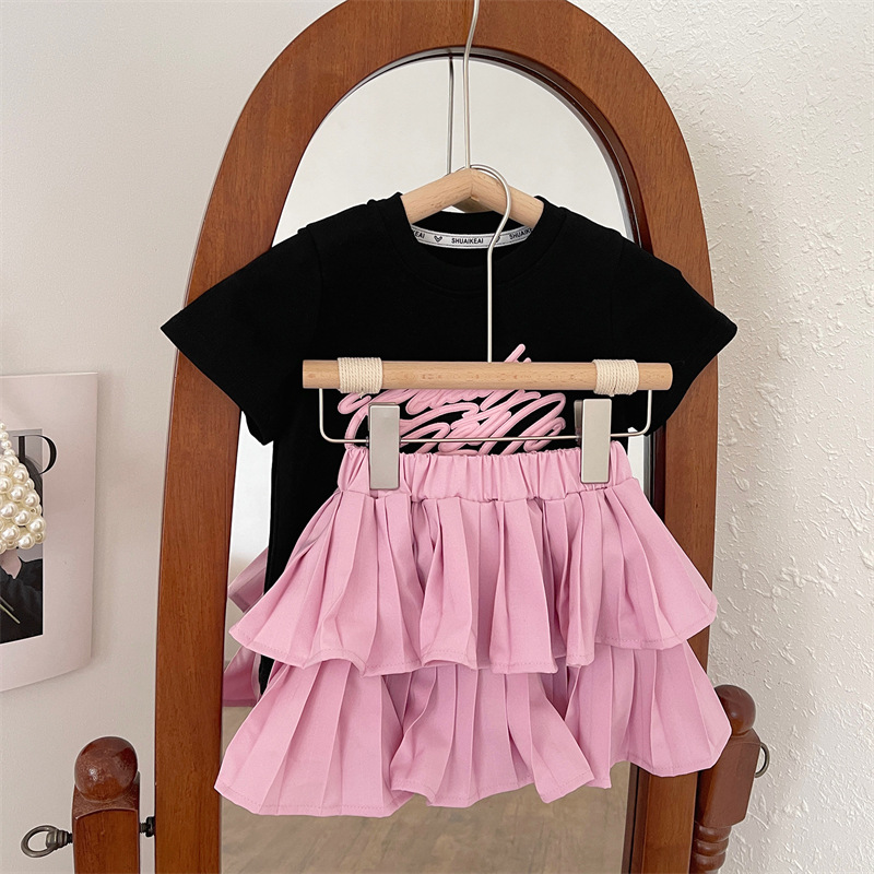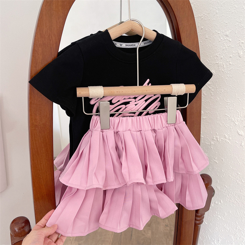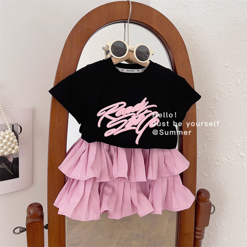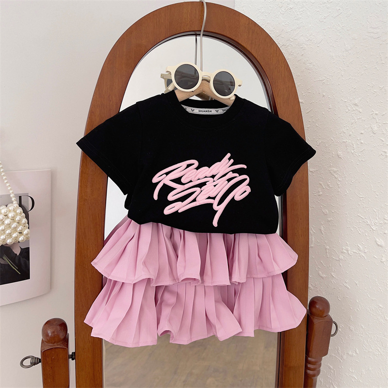 한국 아동복 2024 여름 소녀의 세련된 편지 프린트 티셔츠 달콤한 핑크 주름 짧은 치마 어린이 세트