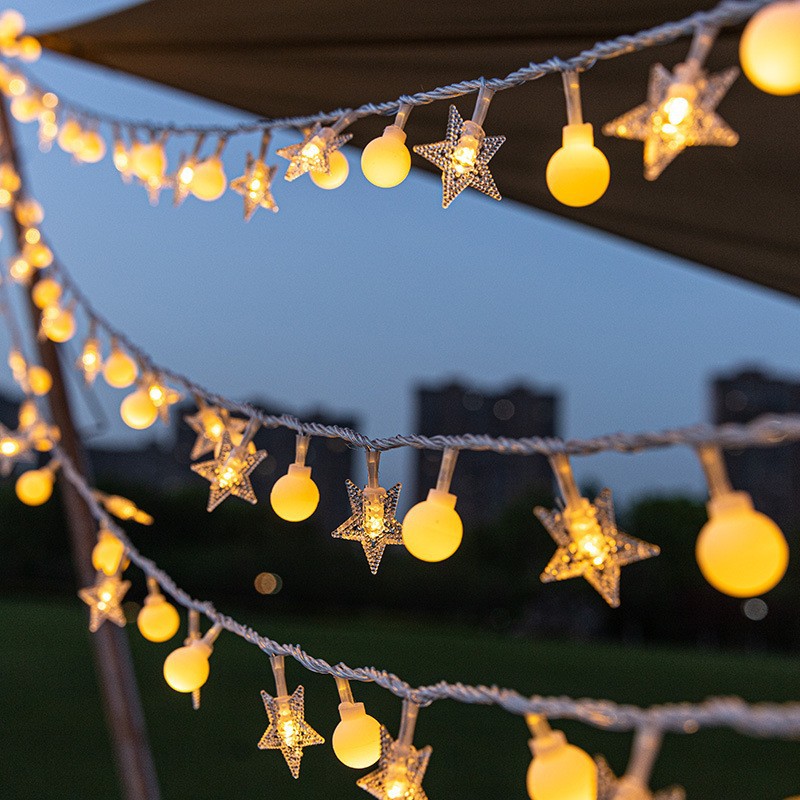 야외 크리스마스 LED 캐노피 작은 흰색 공 별 빛 문자열 태양 야외 안뜰 캠프 분위기 장식 빛