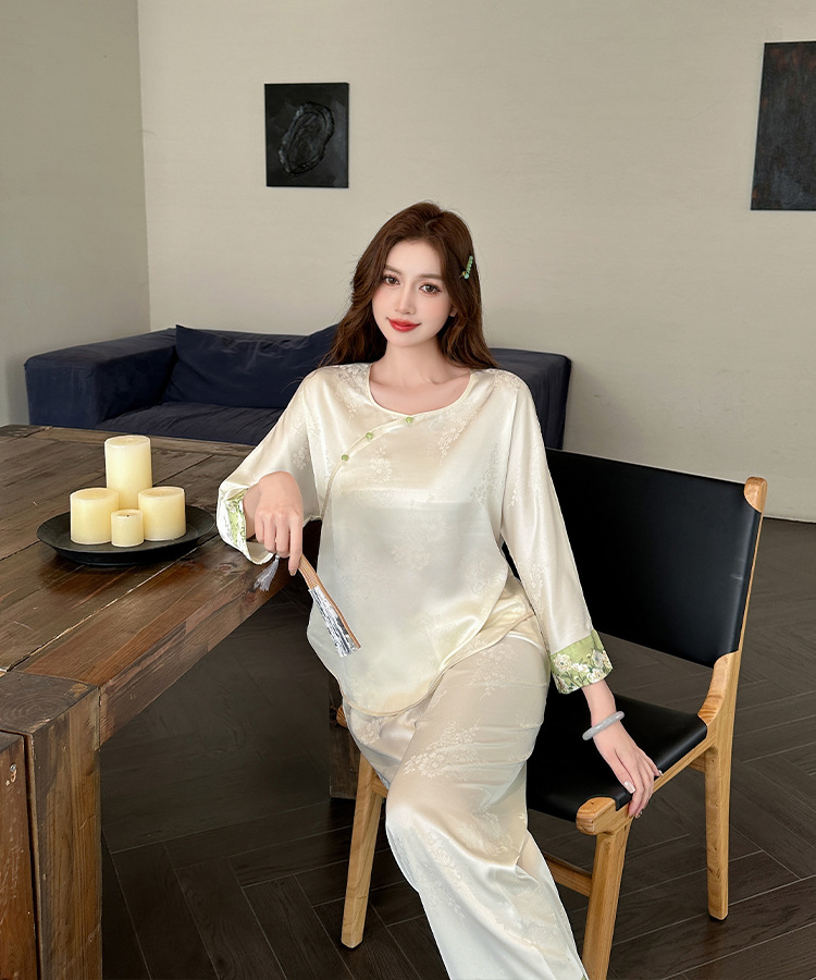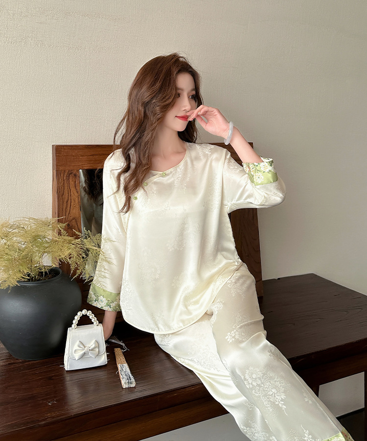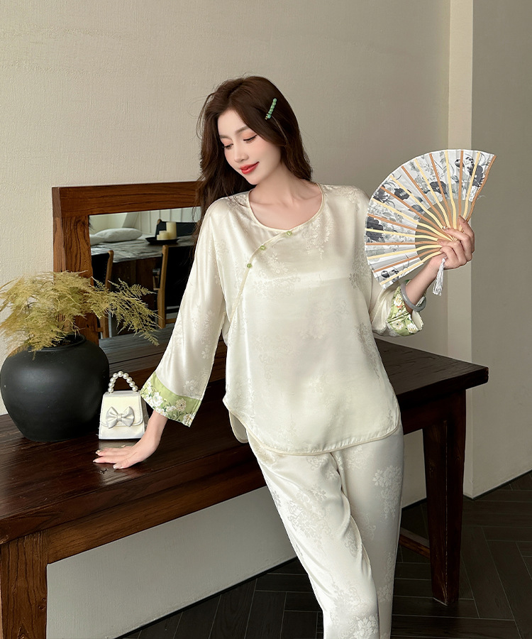 여성을위한 얼음 실크 잠옷 봄과 여름 새로운 중국 스타일 국가 스타일 정장 모조 실크 새틴 자카드 긴팔 고화질 레이스 가정 의류스토어 가기