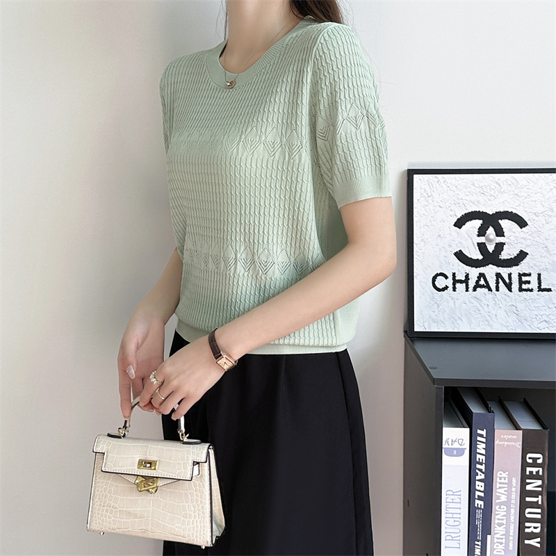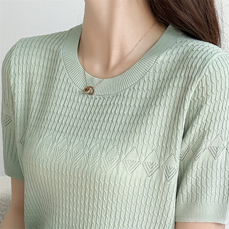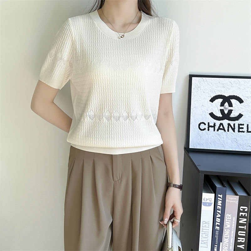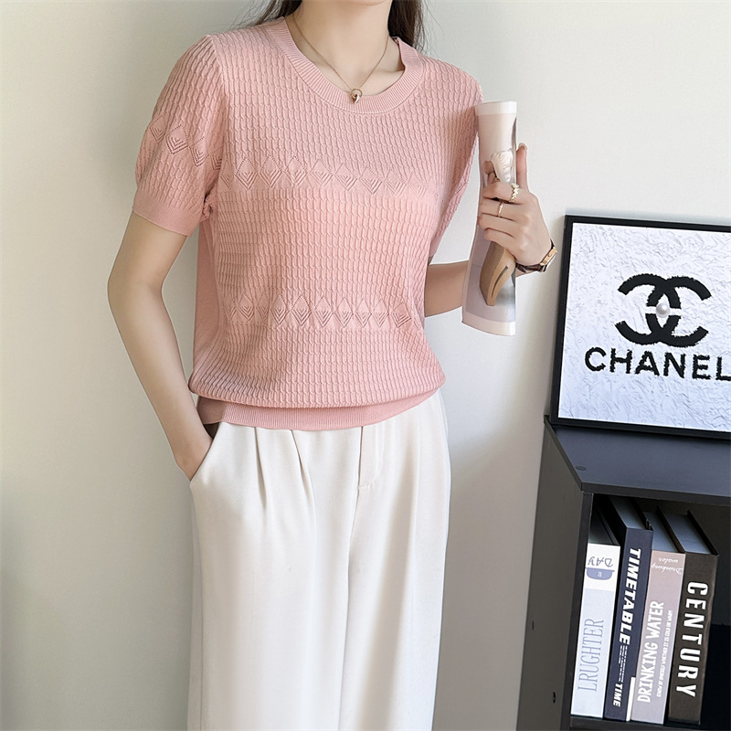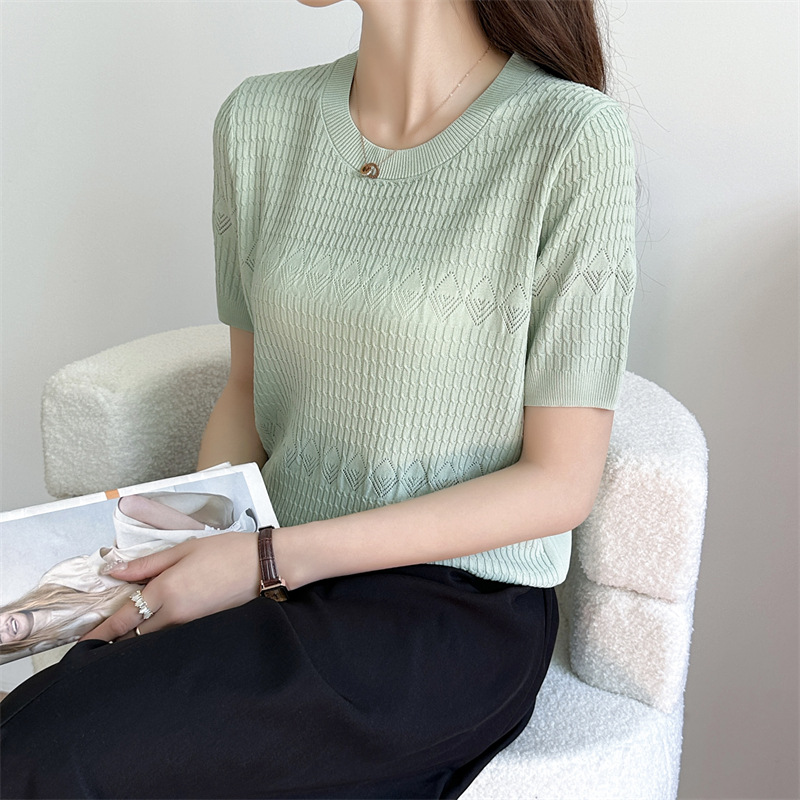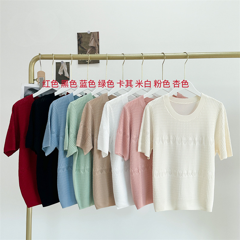 프랑스 여름 새로운 라운드 넥 풀오버 부드러운 지적 자카드 아이스 실크 짧은 소매 스웨터 연령 감소 복고풍 탑