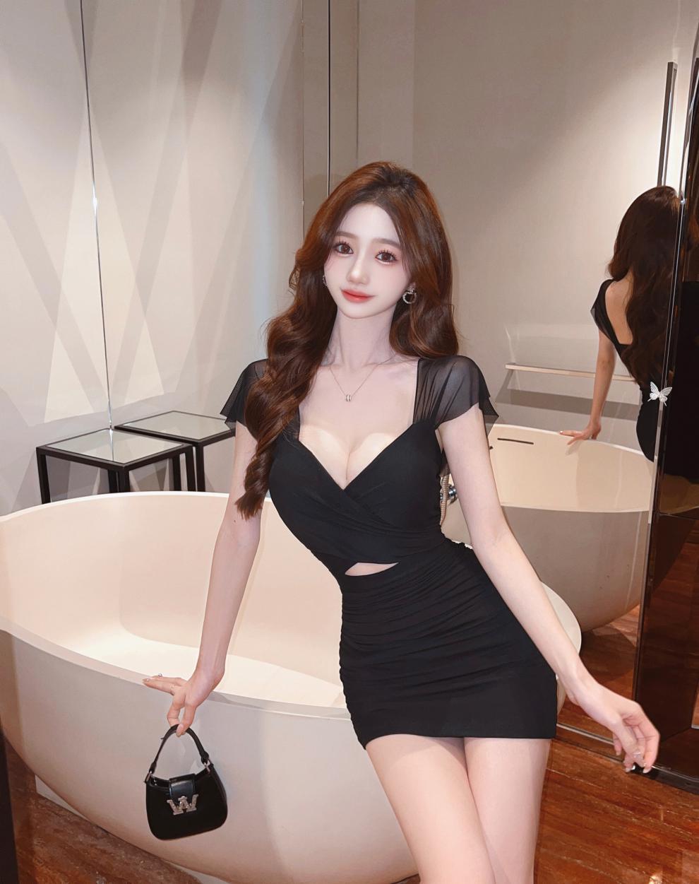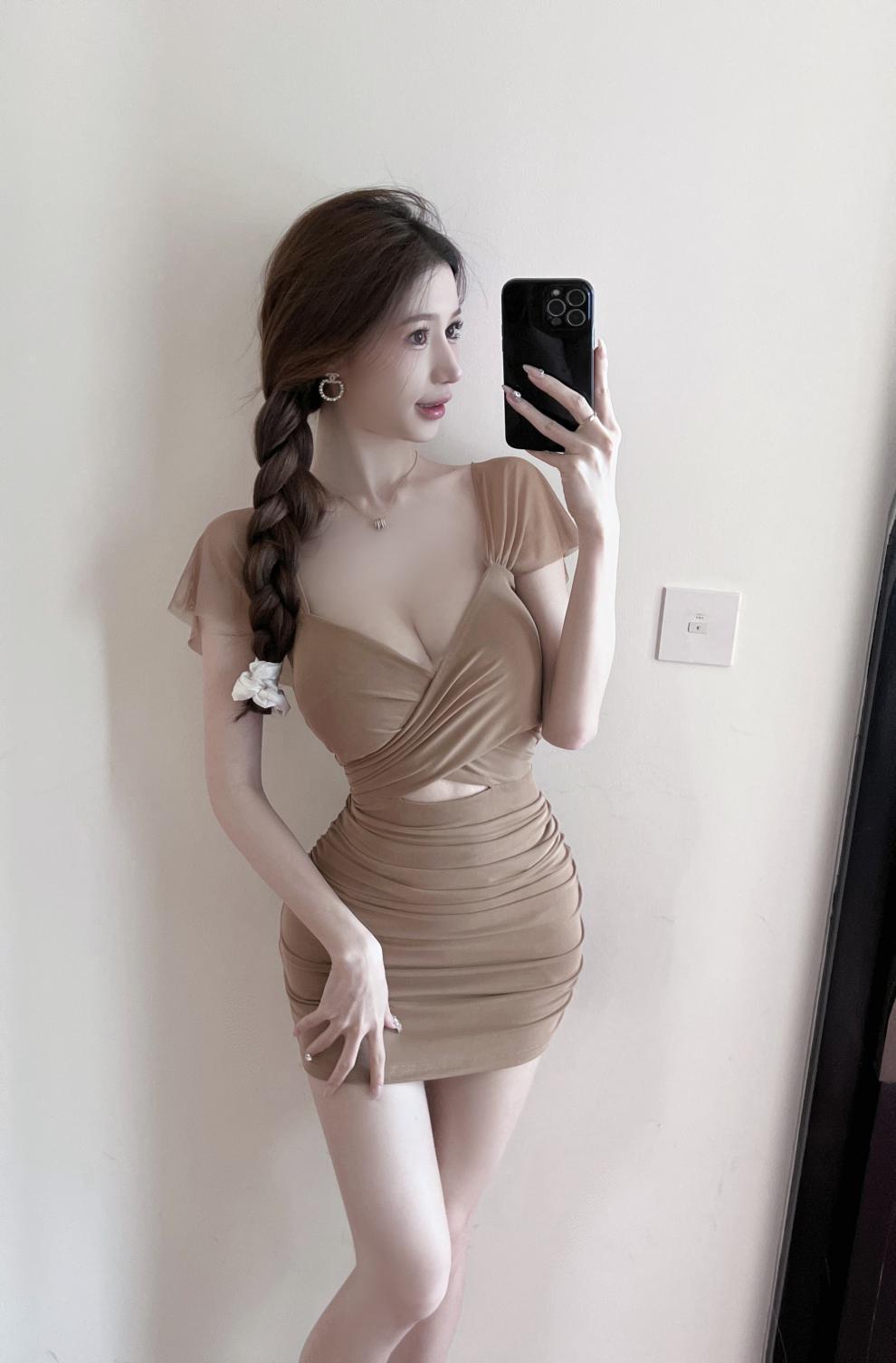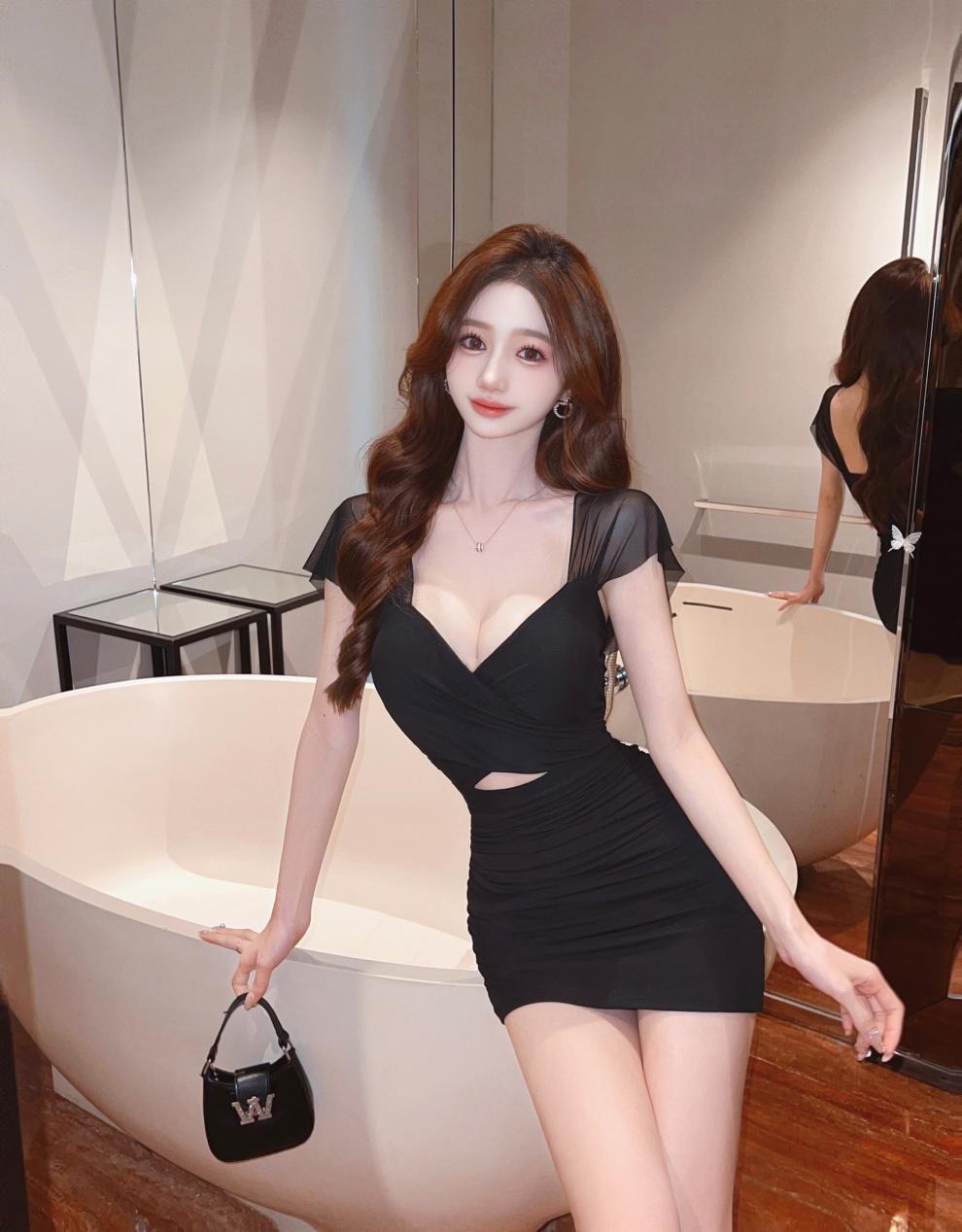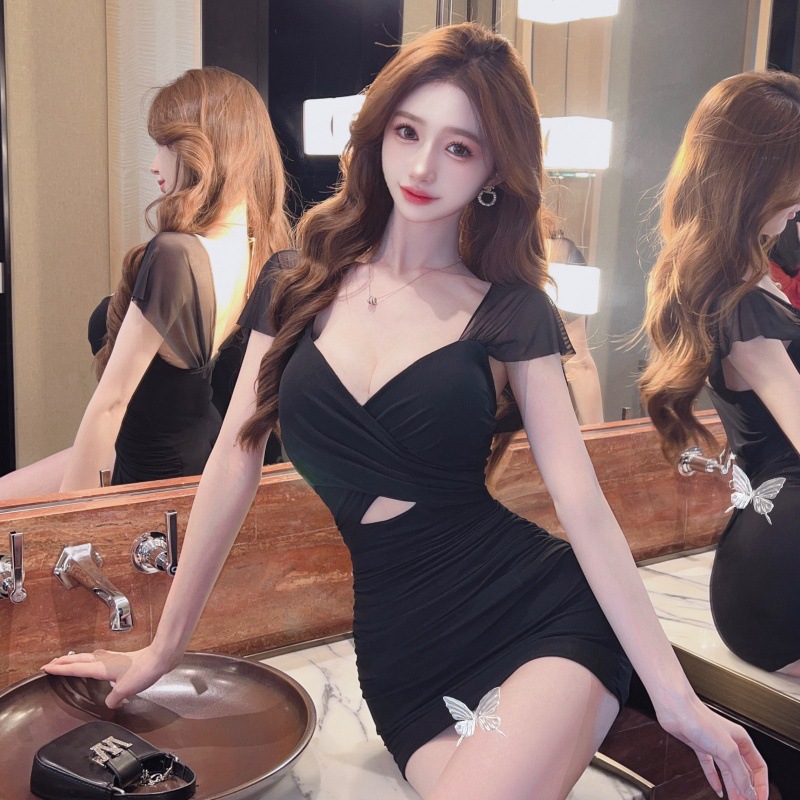 진짜 샷 순수한 욕망 스타일 섹시한 원피스 여성 배 꽉 엉덩이 스커트 여름 기질 로우 컷 V 넥 슬림 스커트스토어 가기
