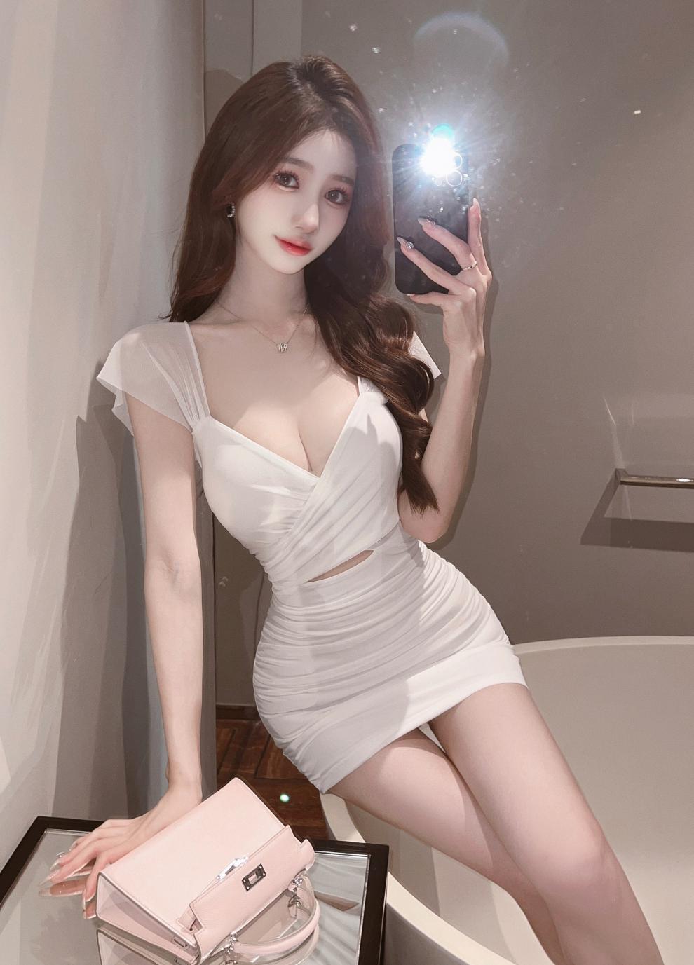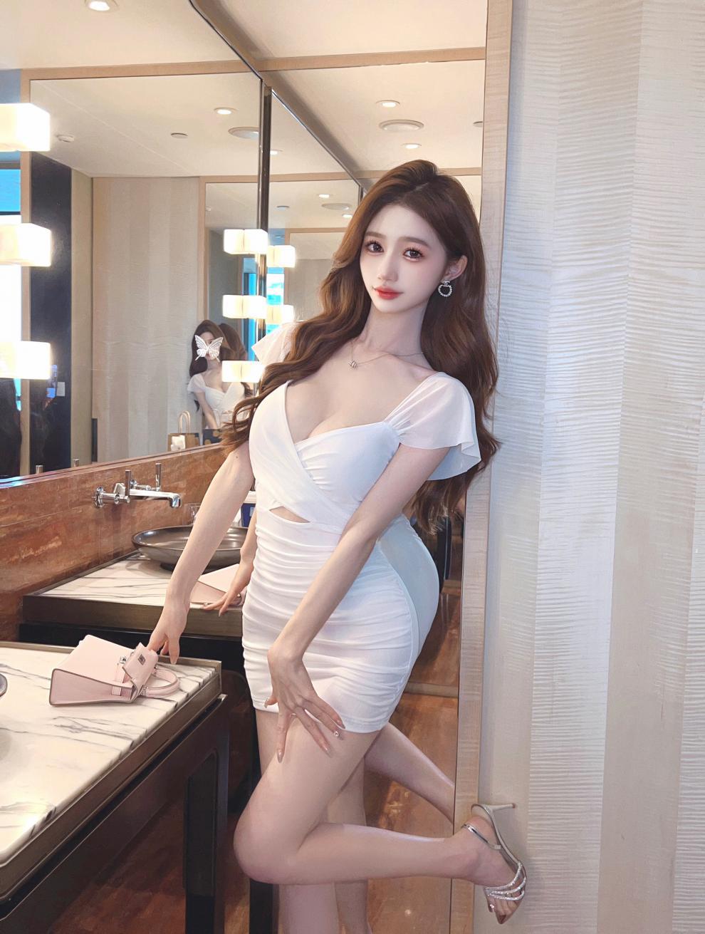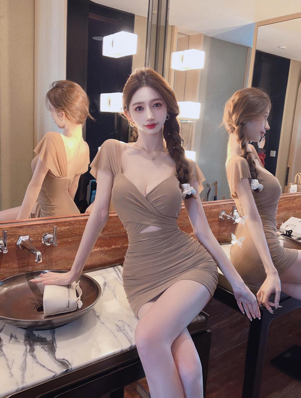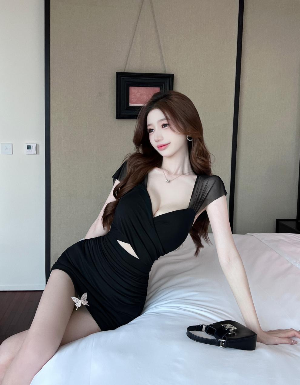 진짜 샷 순수한 욕망 스타일 섹시한 원피스 여성 배 꽉 엉덩이 스커트 여름 기질 로우 컷 V 넥 슬림 스커트스토어 가기
