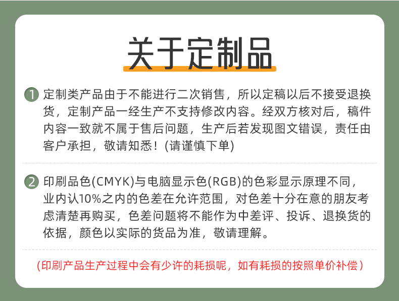 1、本店铺所有商品均为定制品没有现货,所有商品定价均为参考价