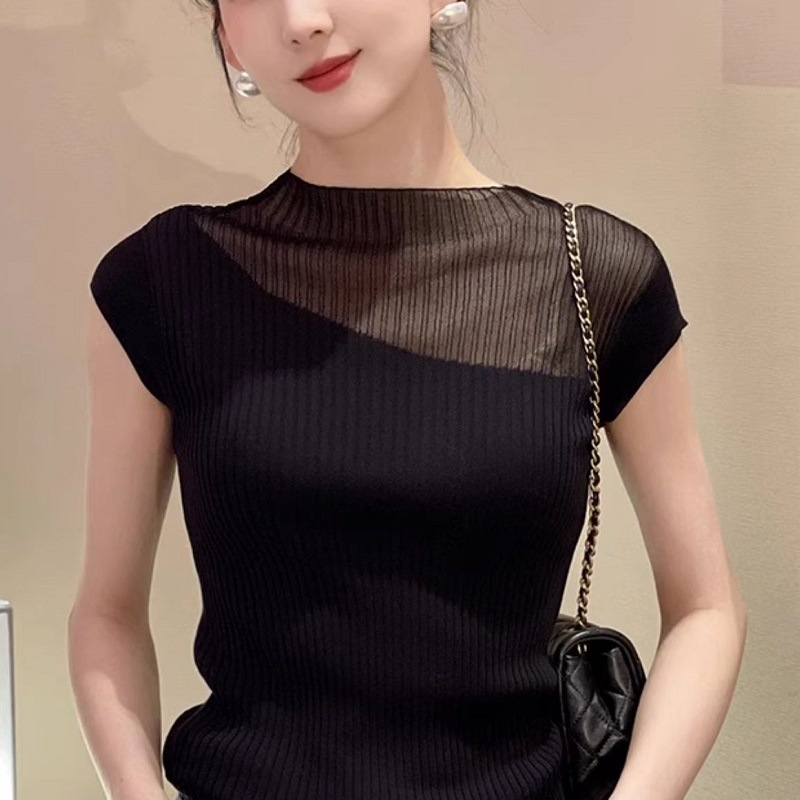 인터넷 유명인 새로운 올 매치 프랑스 반투명 스웨터 반팔 티셔츠 여성의 여름 어깨 민소매 아이스 실크 탑