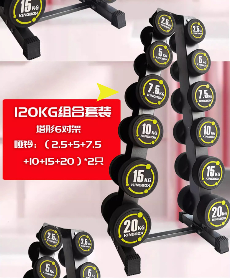 120KG套装:2.5公斤1对,5公斤1对,7.5公斤1对,10公斤1对,15公斤1对,20公斤1对;