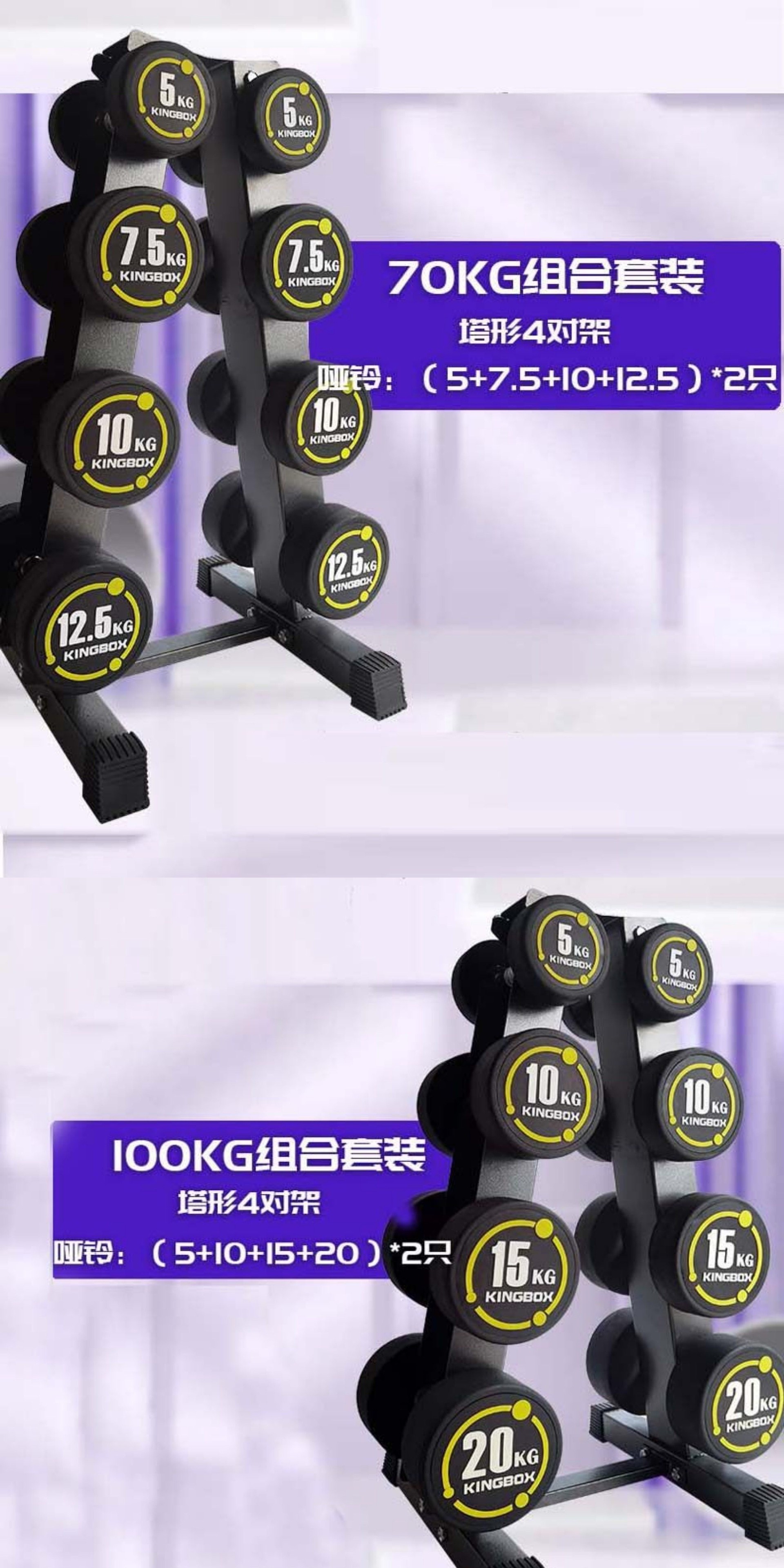 100KG套装:5公斤1对,10公斤1对,15公斤1对,20公斤1对;