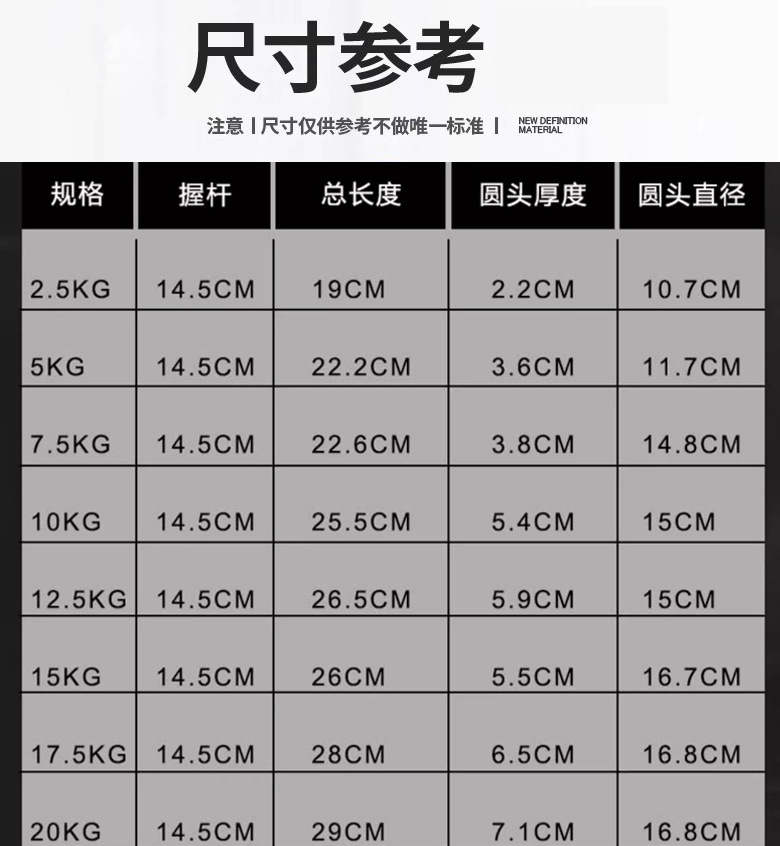 135KG套装:5公斤1对,7.5公斤1对,10公斤1对,12.5公斤1对,15公斤1对,17.5公斤1对;