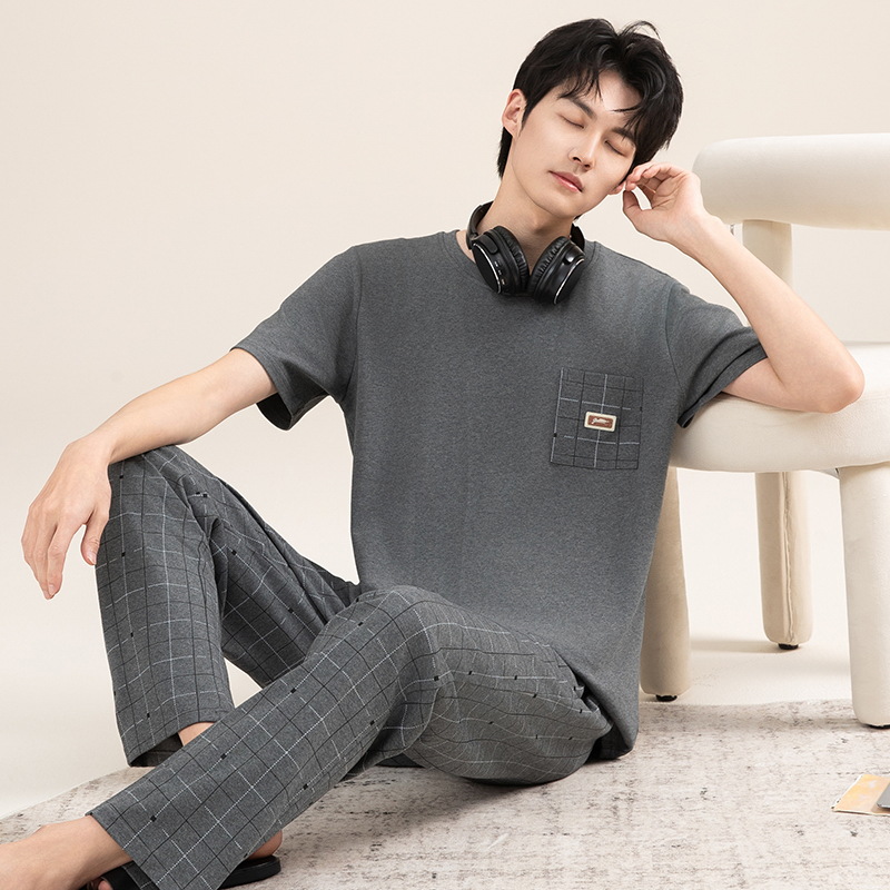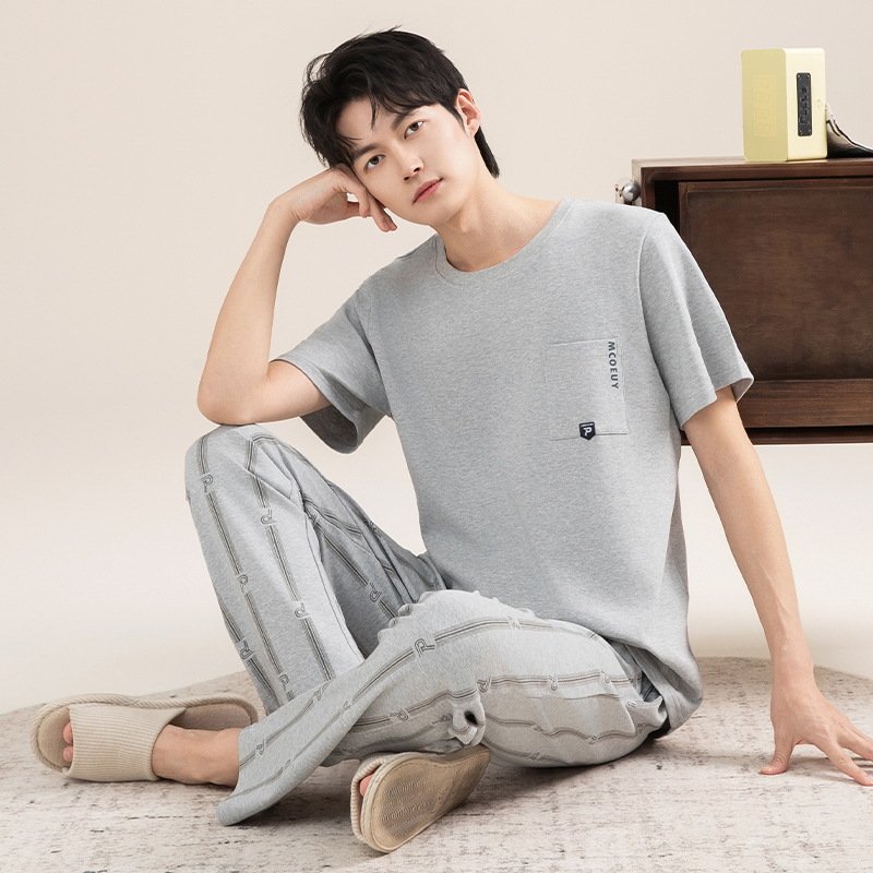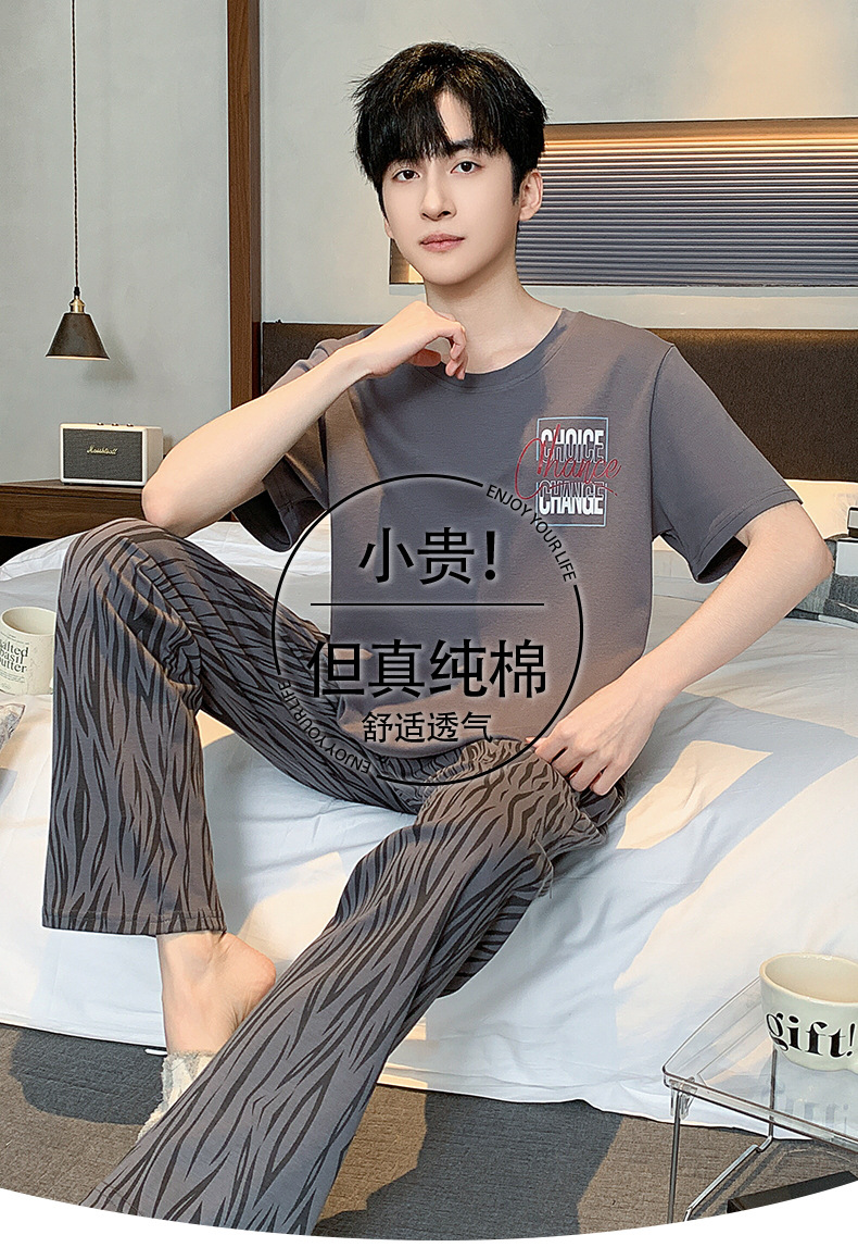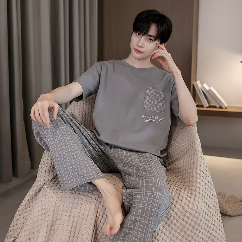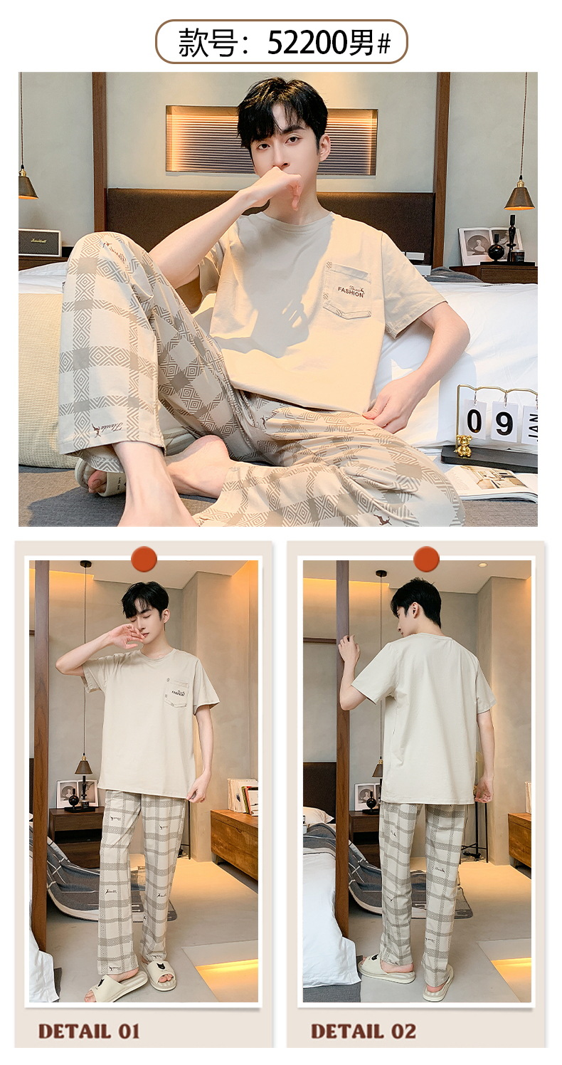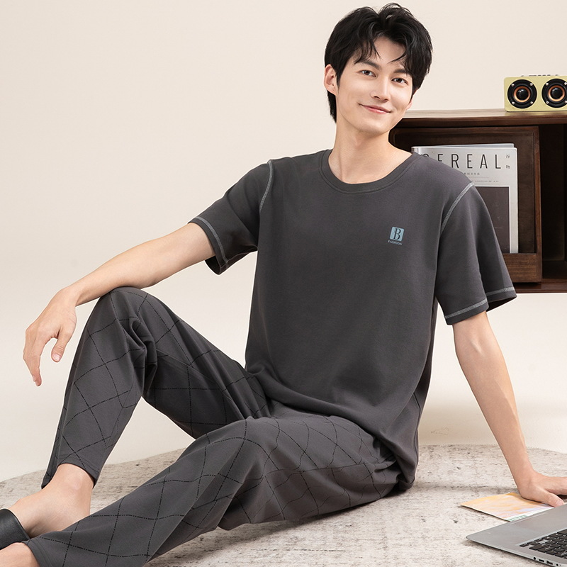 100% 순면 남성용 반팔 여름 반팔 바지 잠옷 얇은 캐주얼 면 홈웨어 세트스토어 가기