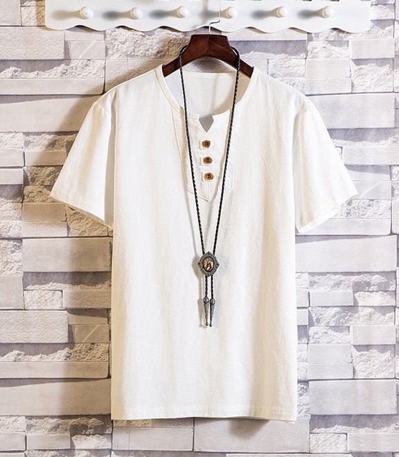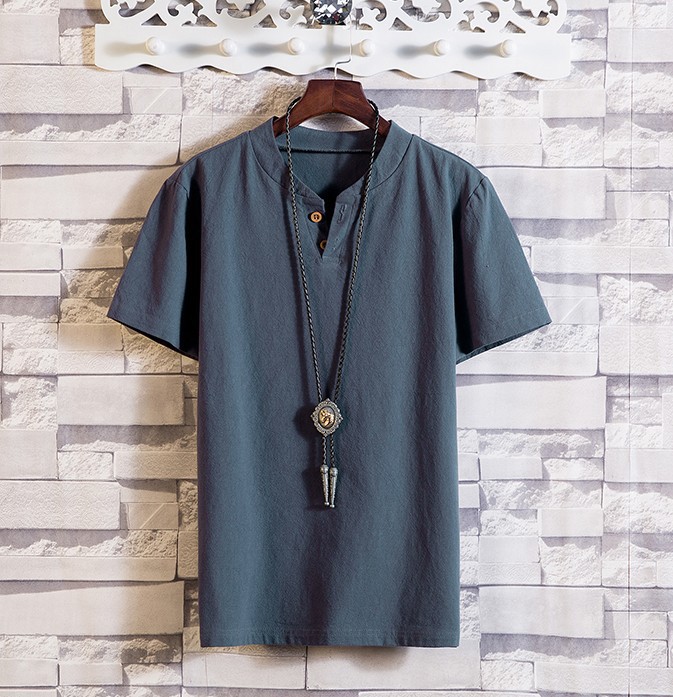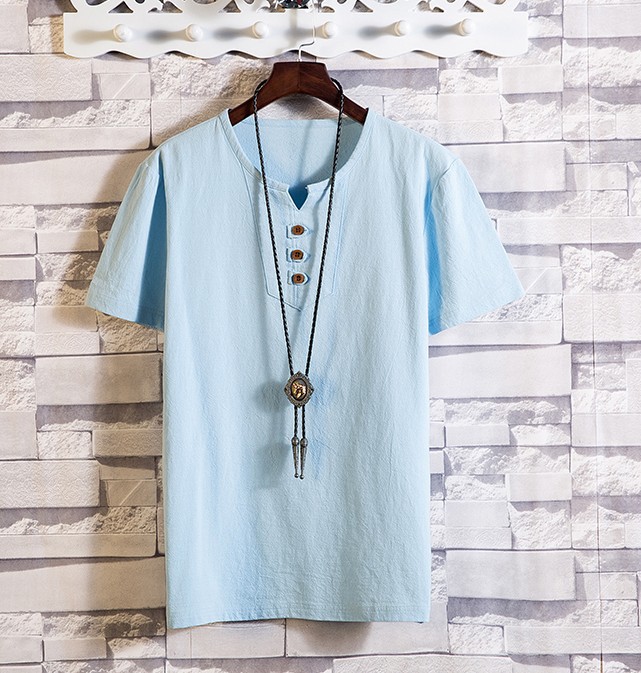 2024 여름 새로운 남성 일본 린넨 반팔 티셔츠 얇은 소프트 V 넥 코드와 린넨 청소년 패션 반팔 티셔츠
