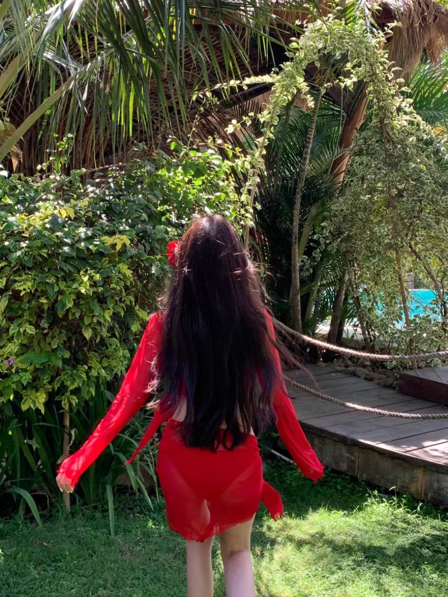 수영복 여성의 순수한 욕망 밝은 빨간색 흰색 섹시한 비키니 4 피스 세트 분할 작은 가슴 푸시 긴 소매 고기 커버 휴가
