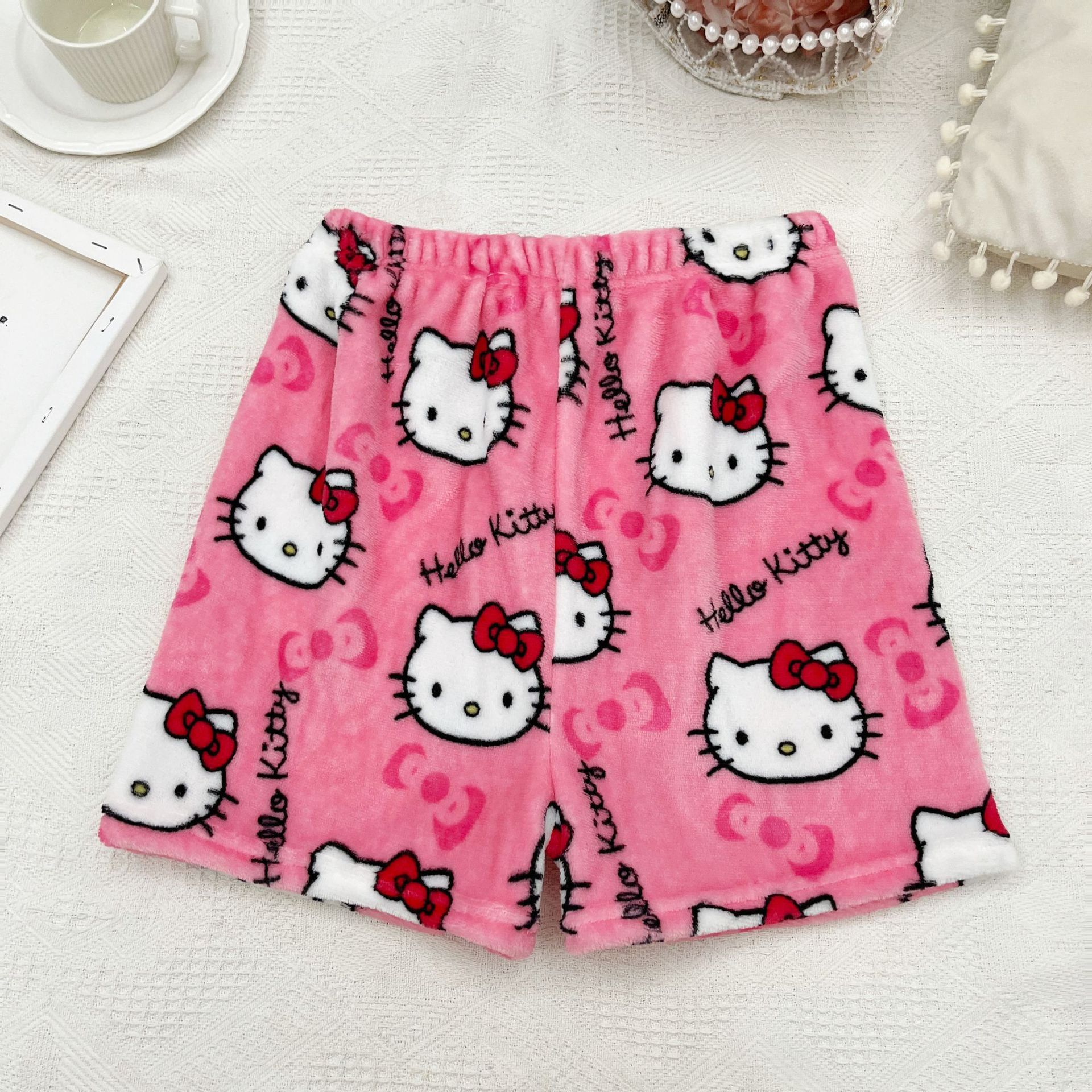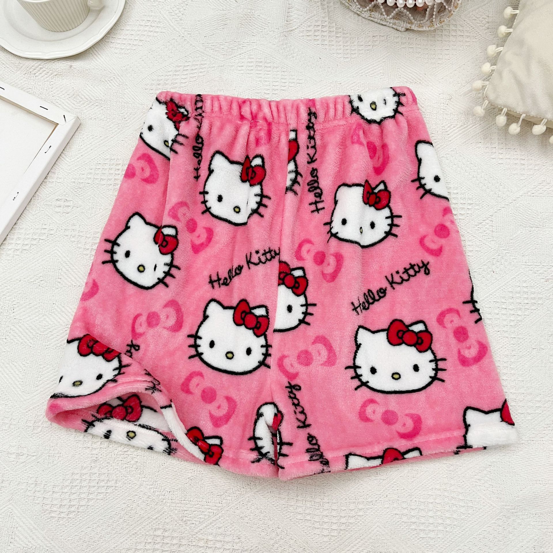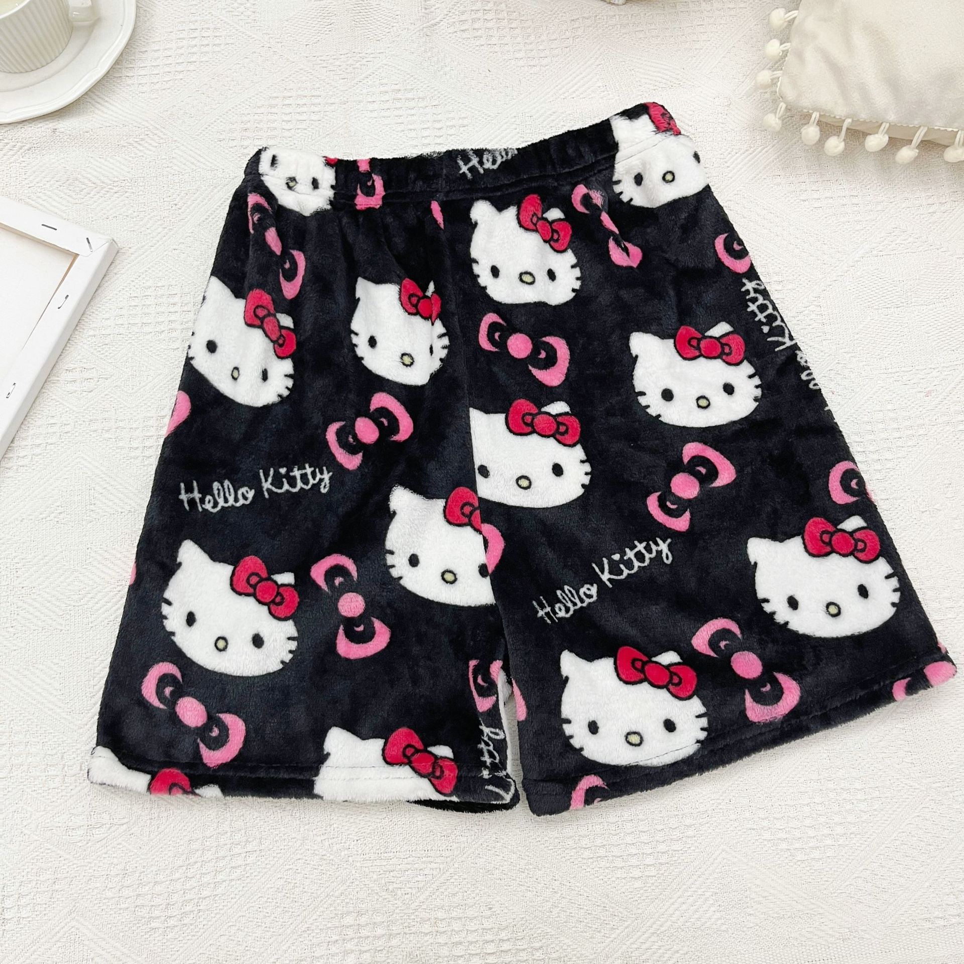 키티 잠옷 플란넬 바지 수출용 만화 캐릭터 KT 고양이 여름용 신축성 반바지 와이드 레그 섹시한 여자
