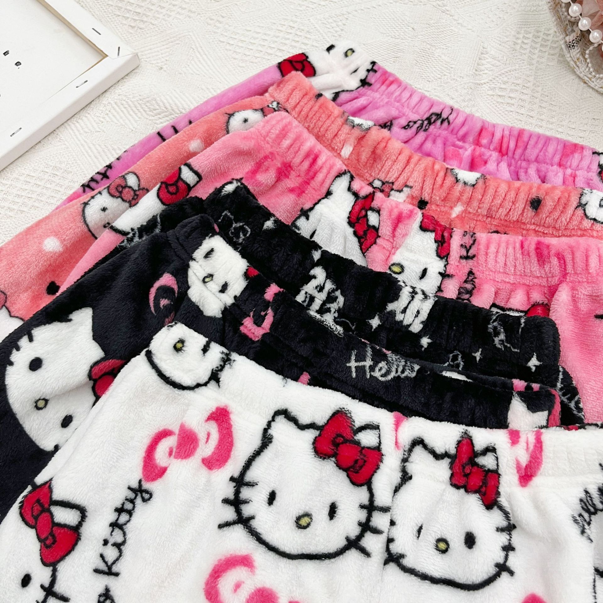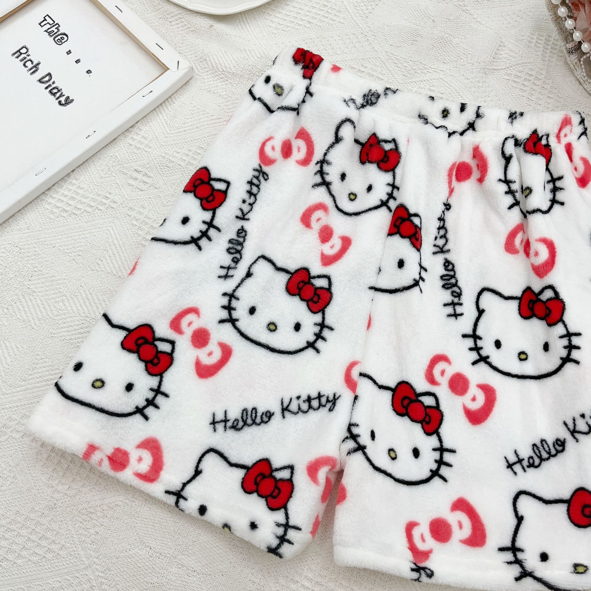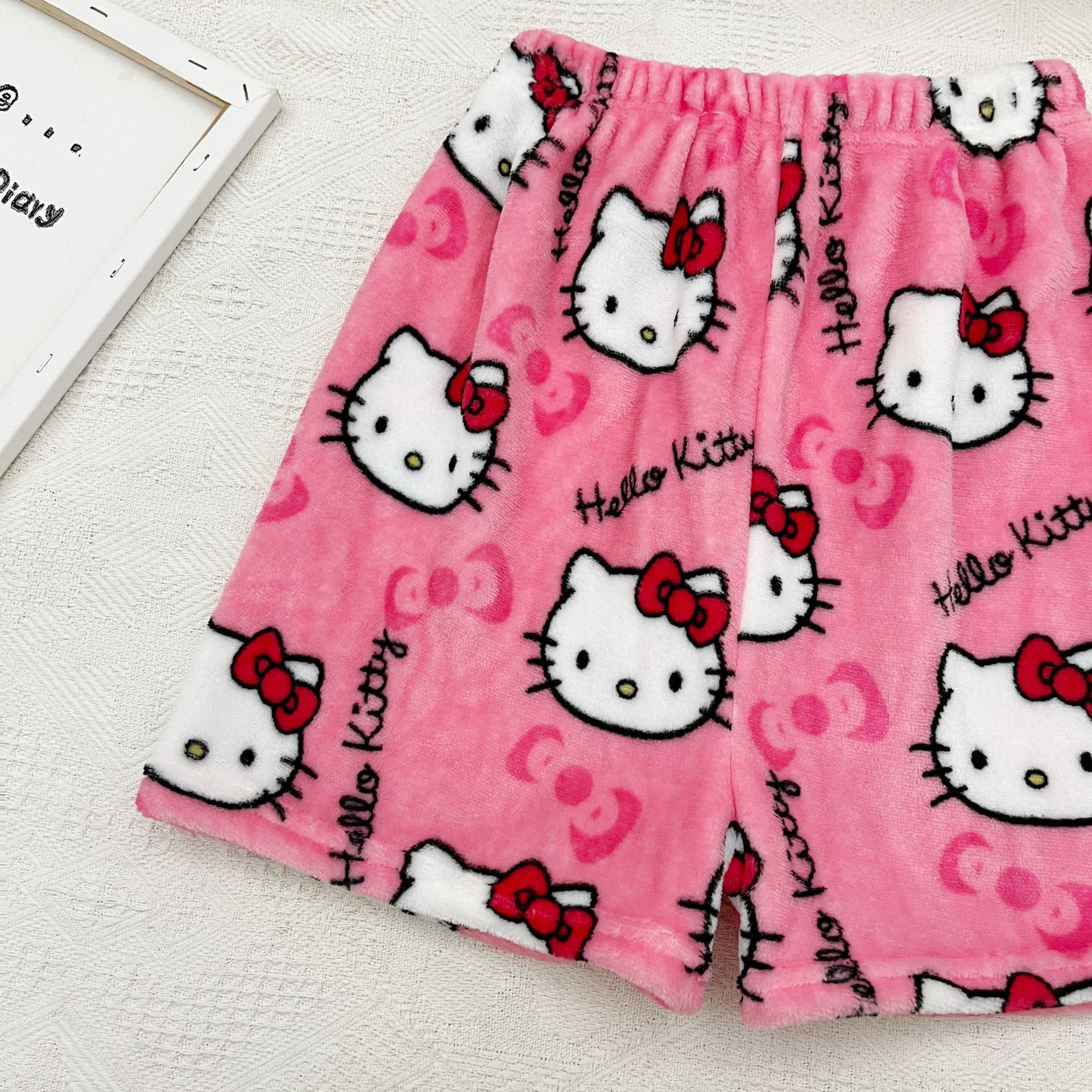 키티 잠옷 플란넬 바지 수출용 만화 캐릭터 KT 고양이 여름용 신축성 반바지 와이드 레그 섹시한 여자