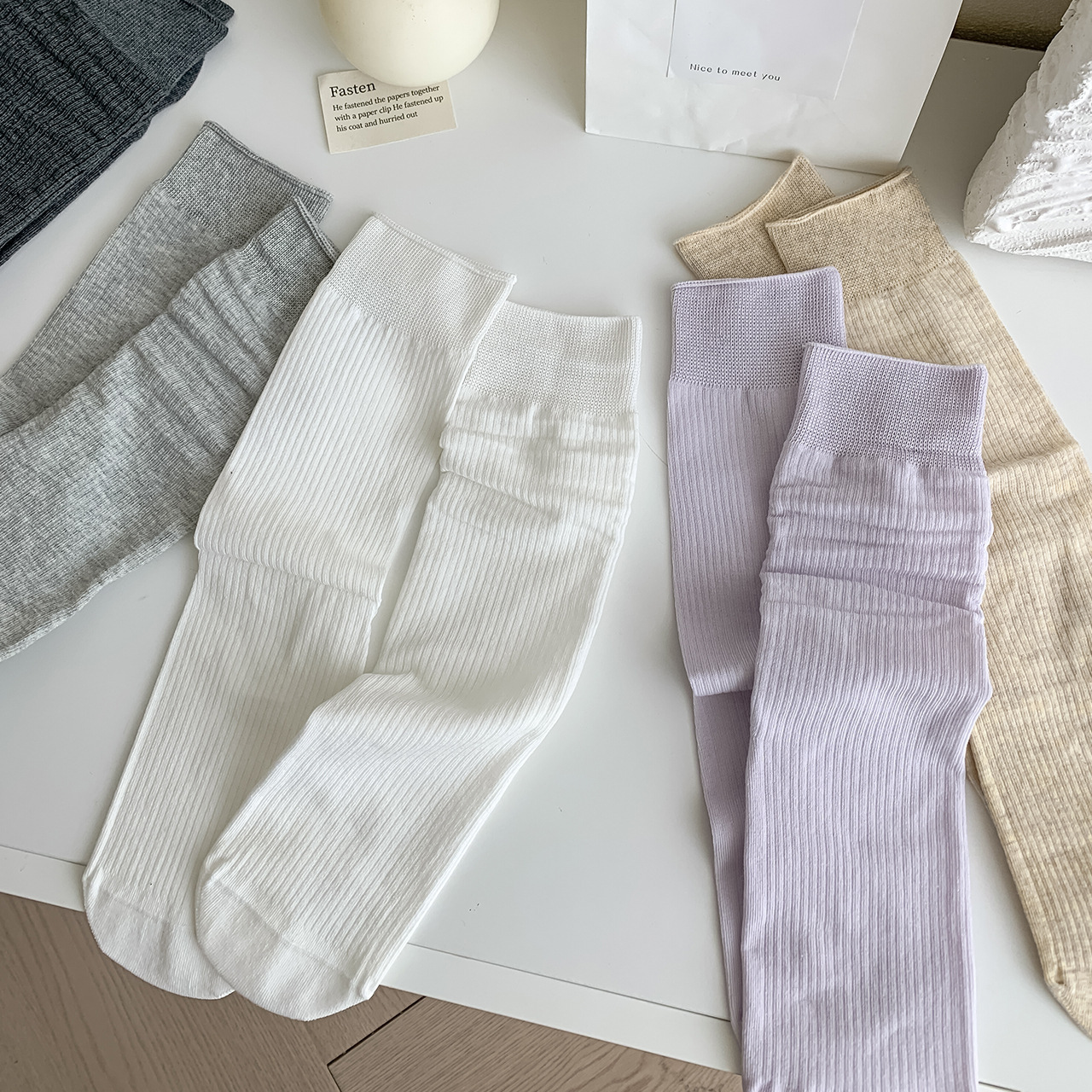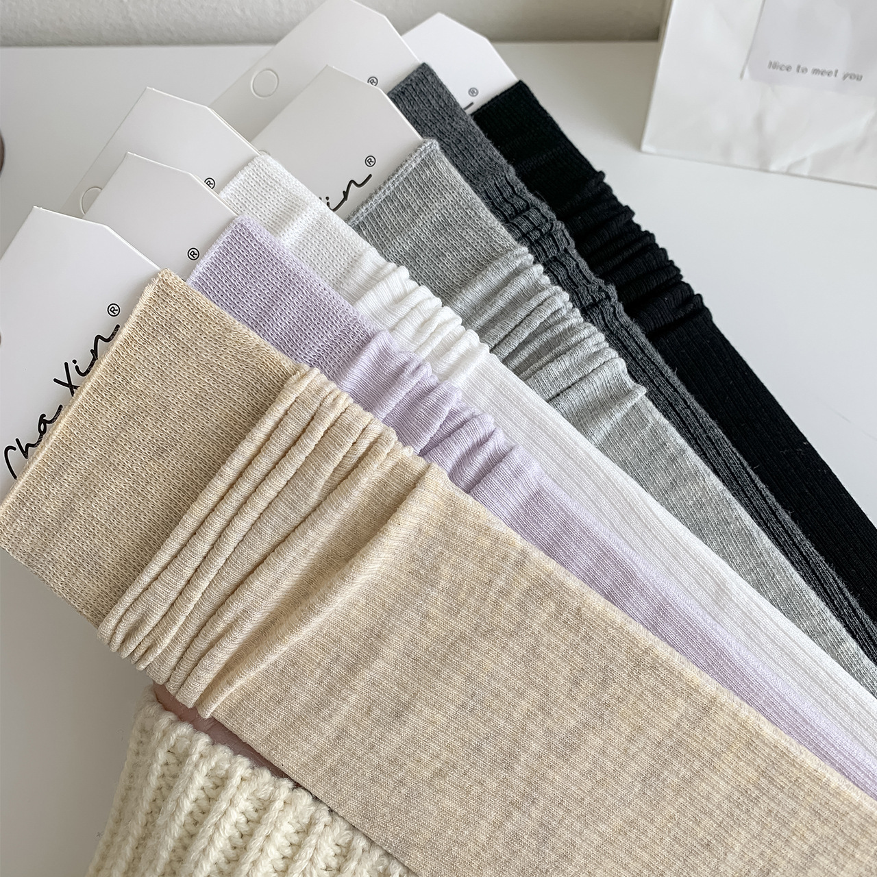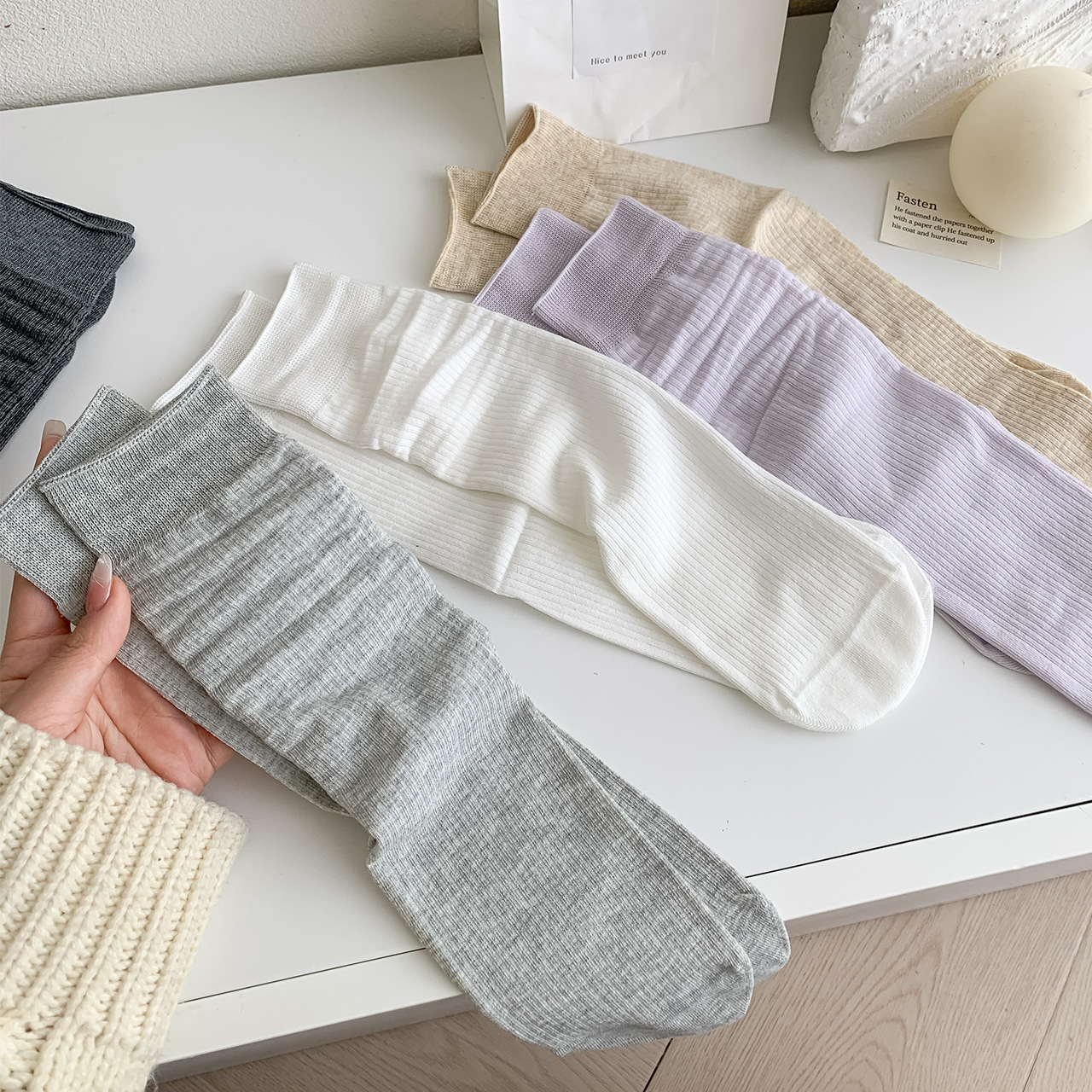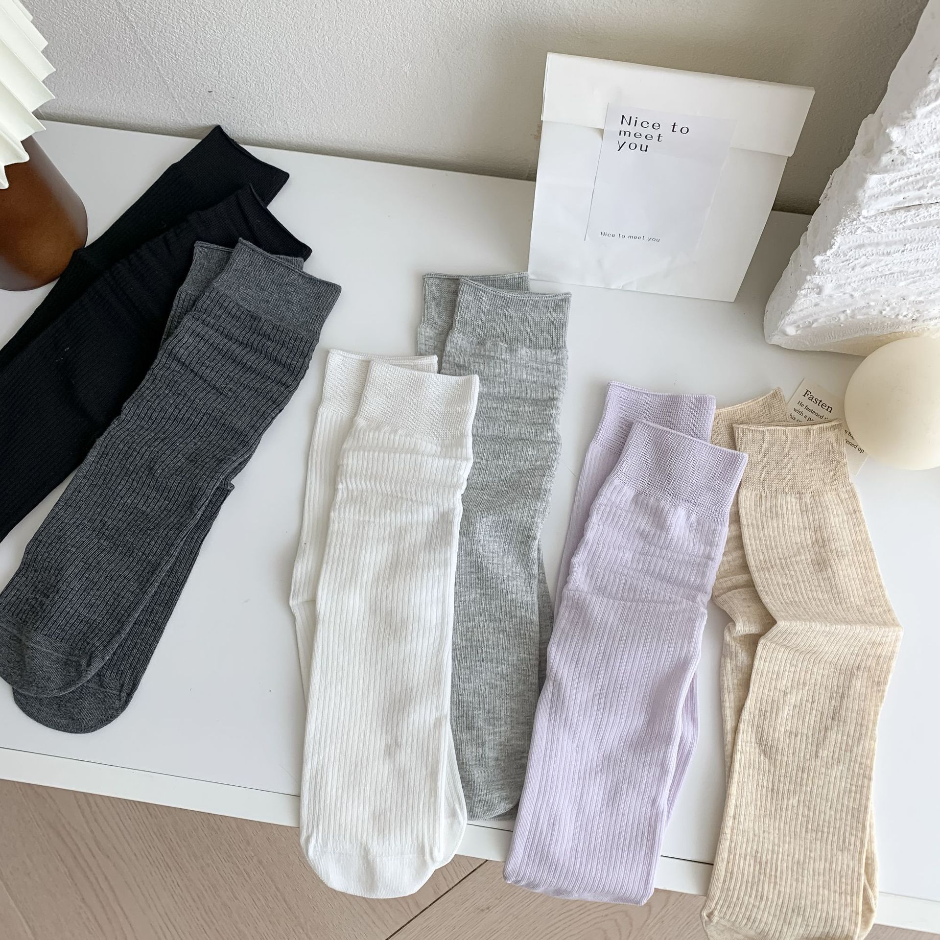 봄과 여름 얇은 양말 여성의 중간 종아리 양말 단색 세로 줄무늬 검은 흰색 회색 기본 스트레이트 크림 컬러 파일 양말스토어 가기