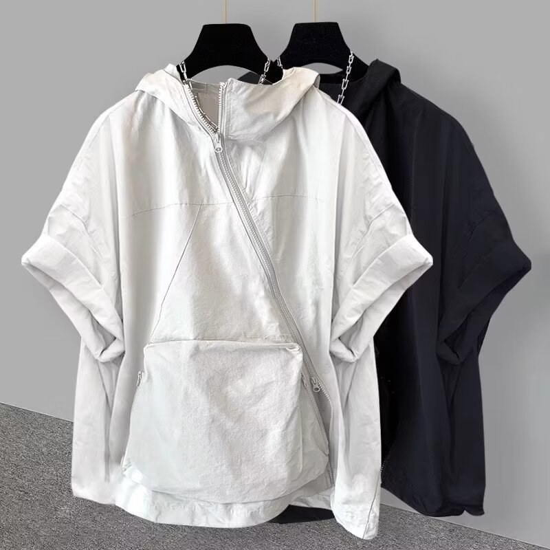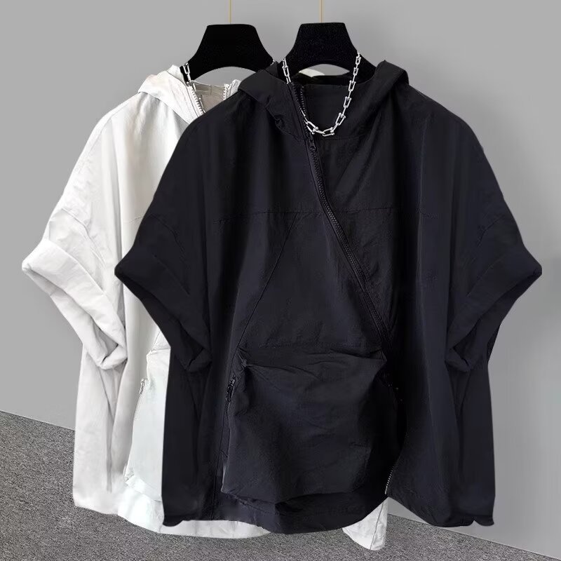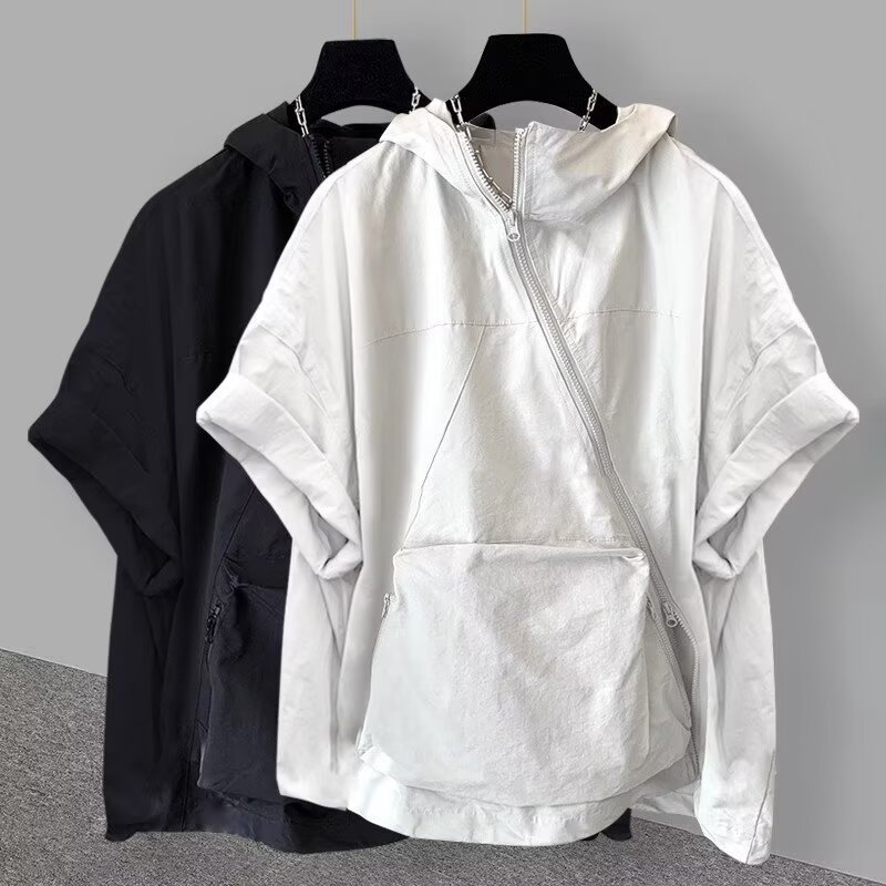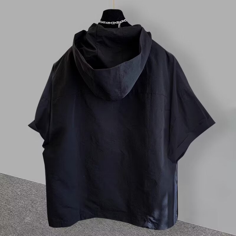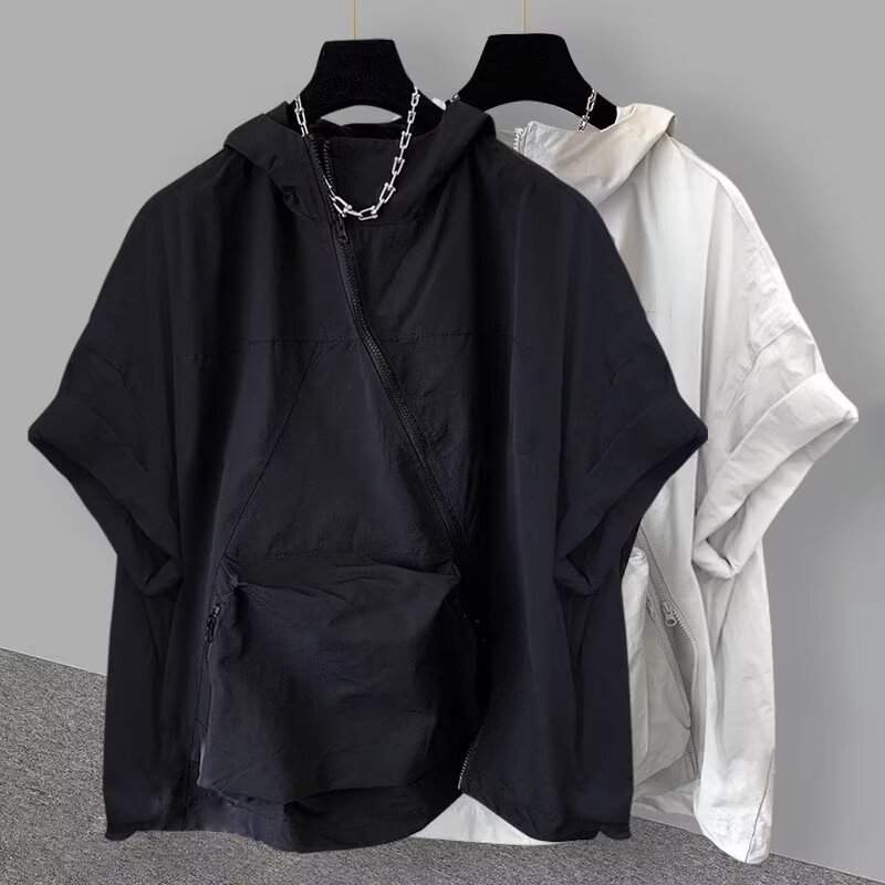 지퍼 디자인 후드 반팔 티셔츠 남성 여름 한국 스타일의 트렌디 한 툴링 큰 포켓 반소매 티셔츠 패션 브랜드 느슨한스토어 가기