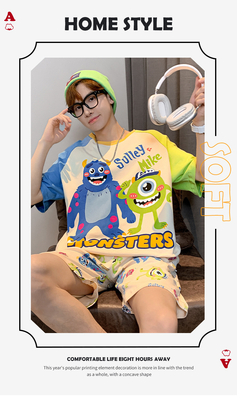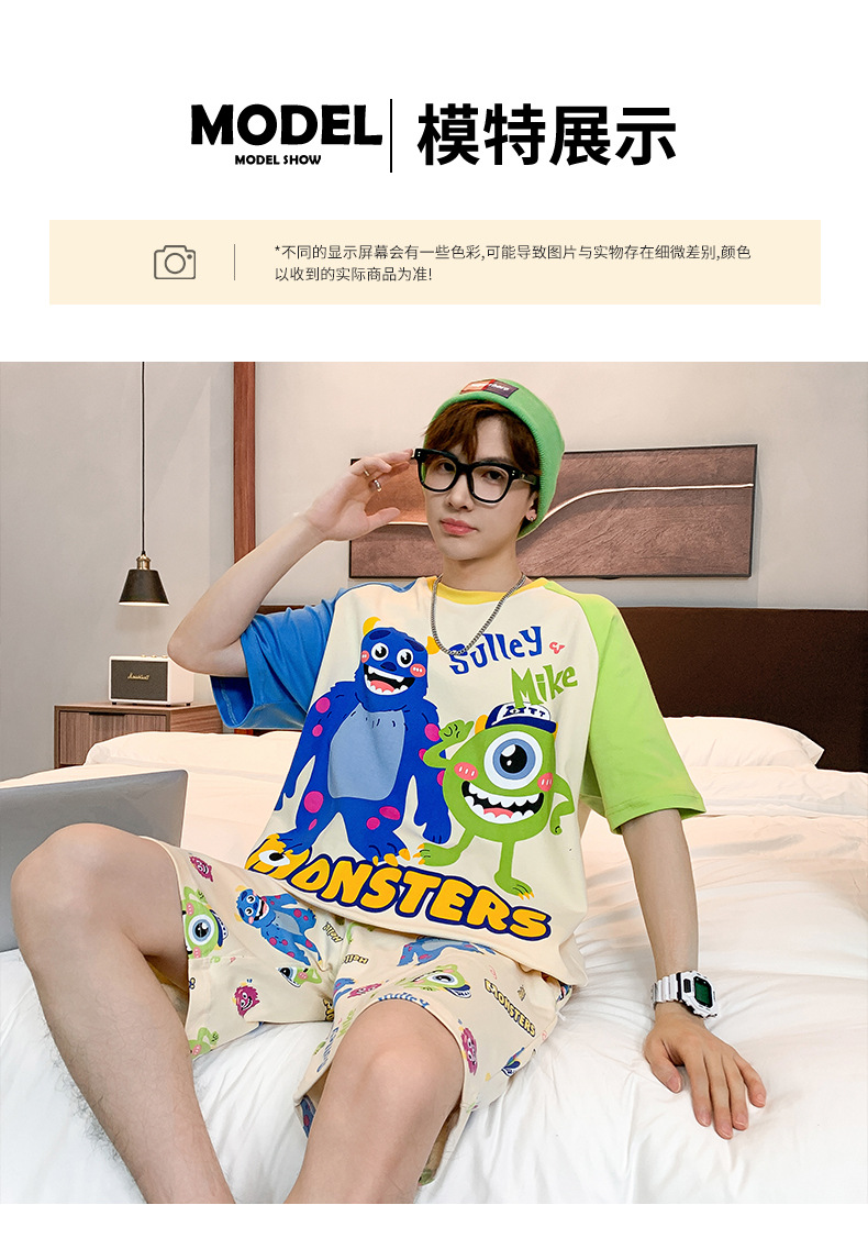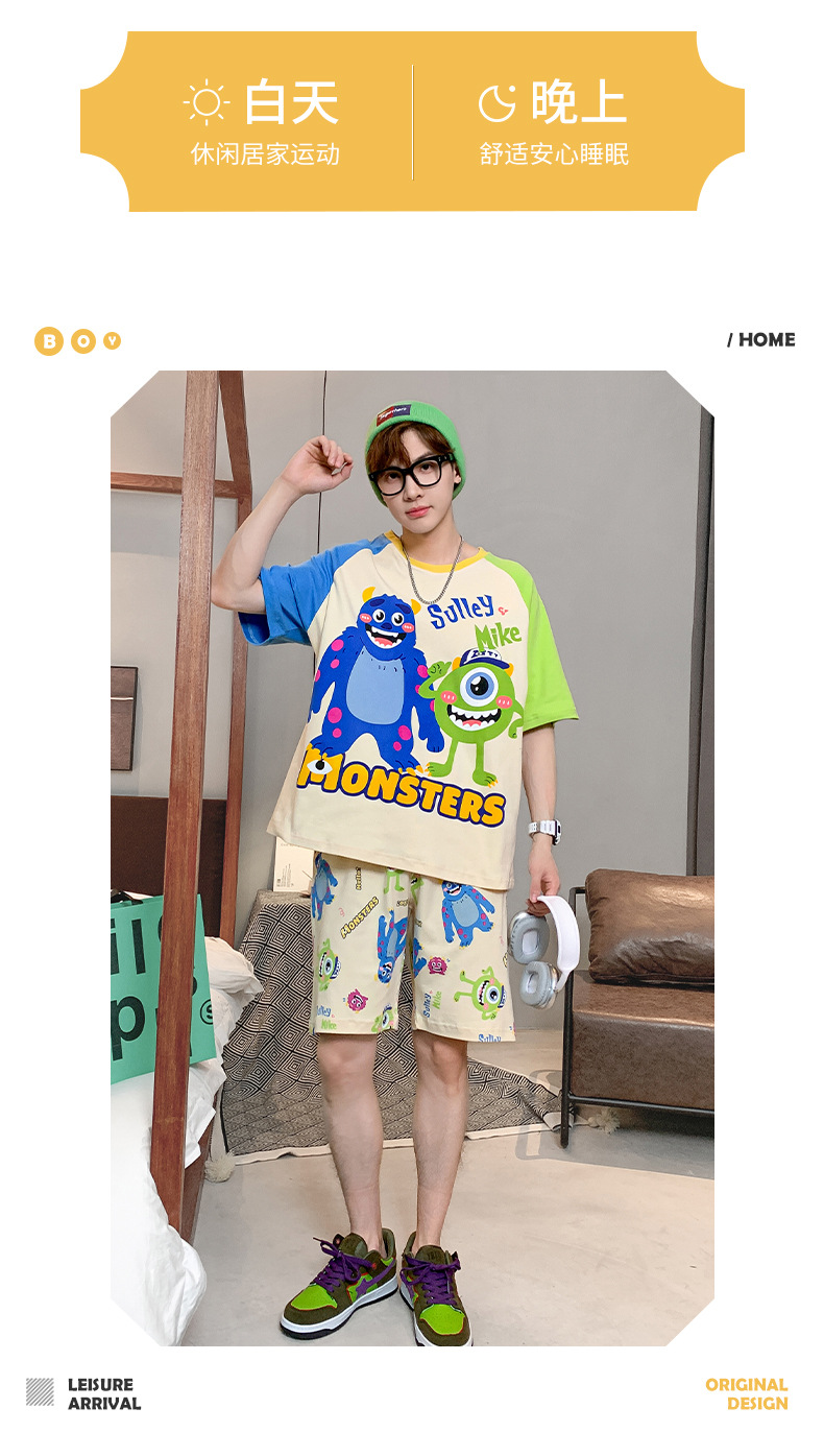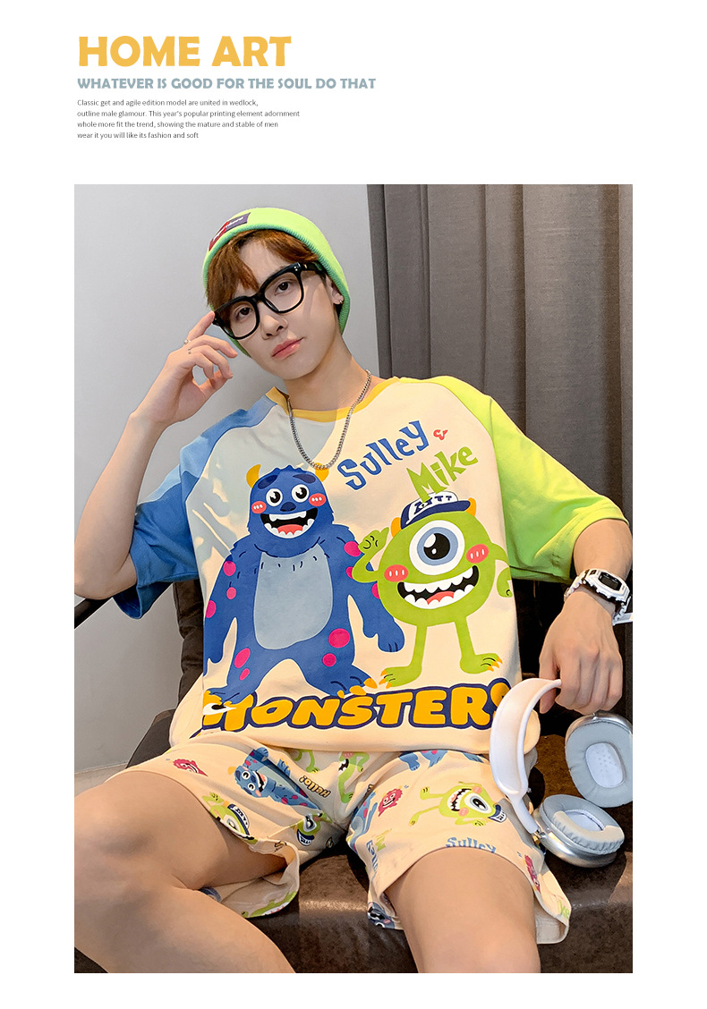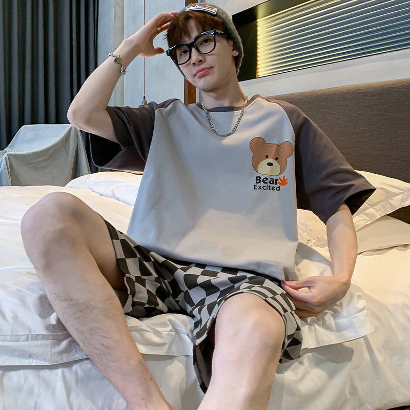 2024 새로운 여름 잠옷 남성의면 짧은 소매 얇은 만화 홈 착용 여름 느슨한 세트 패션 밖에서 착용 할 수 있습니다스토어 가기