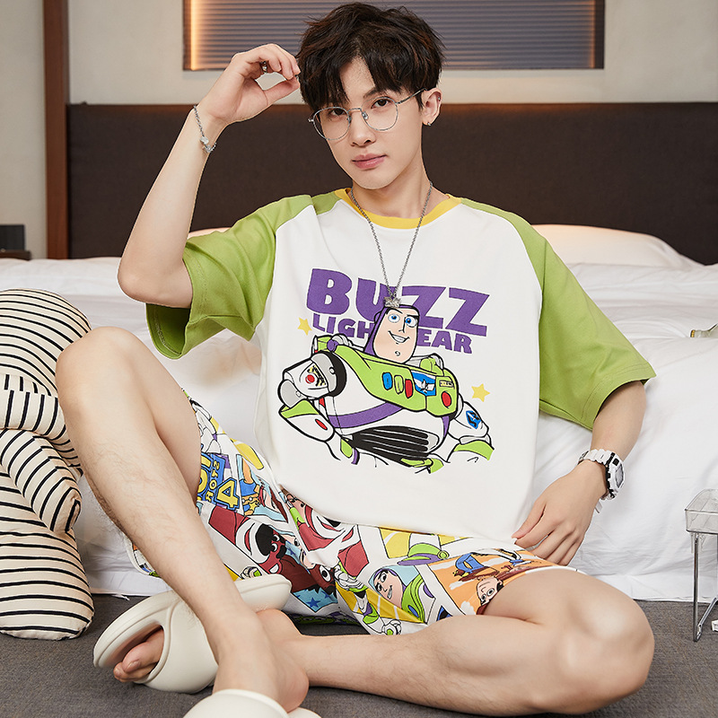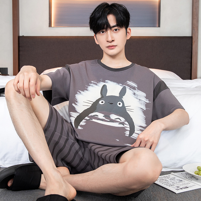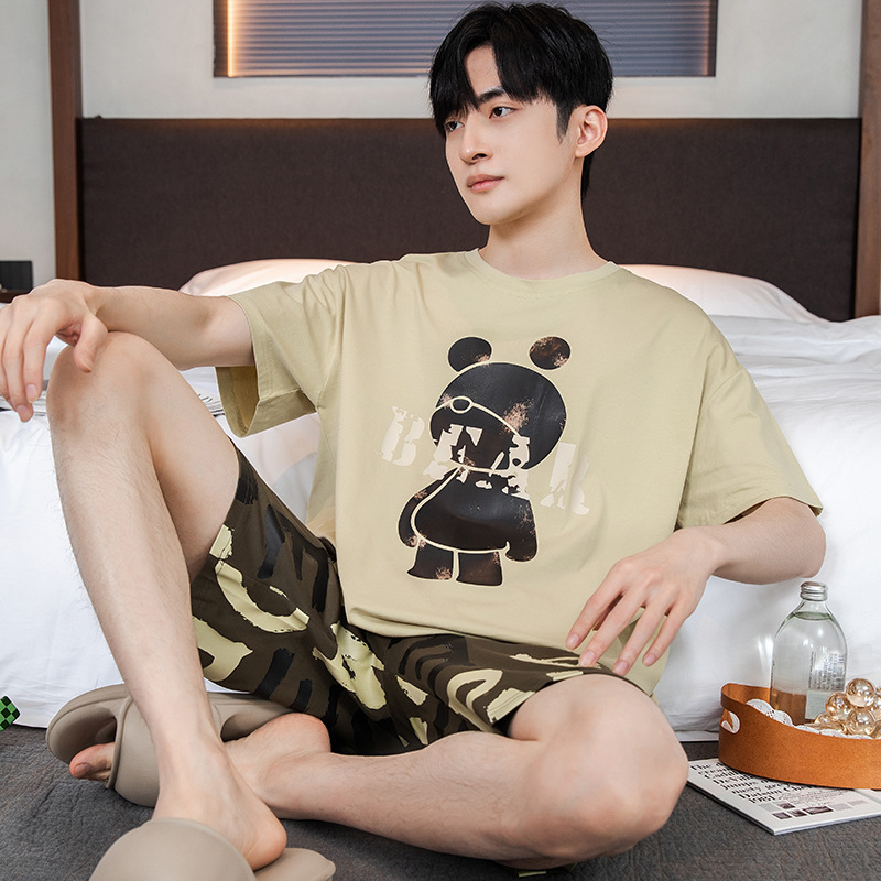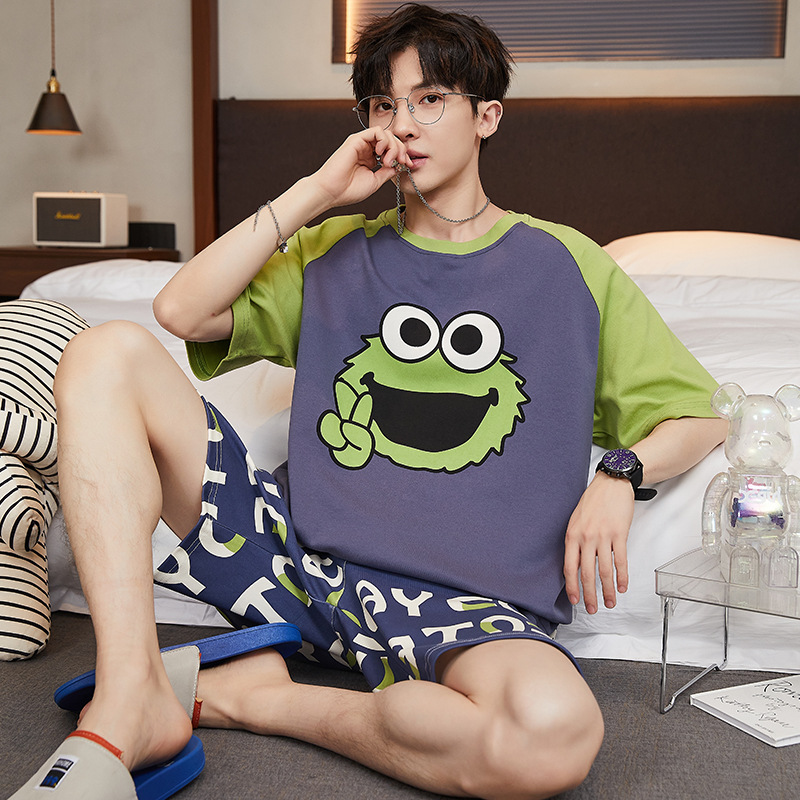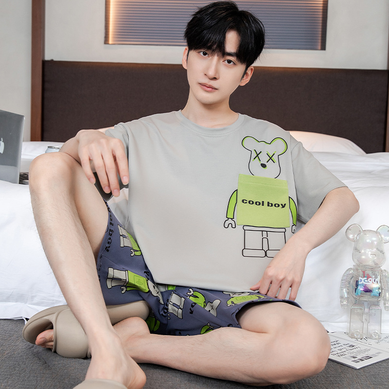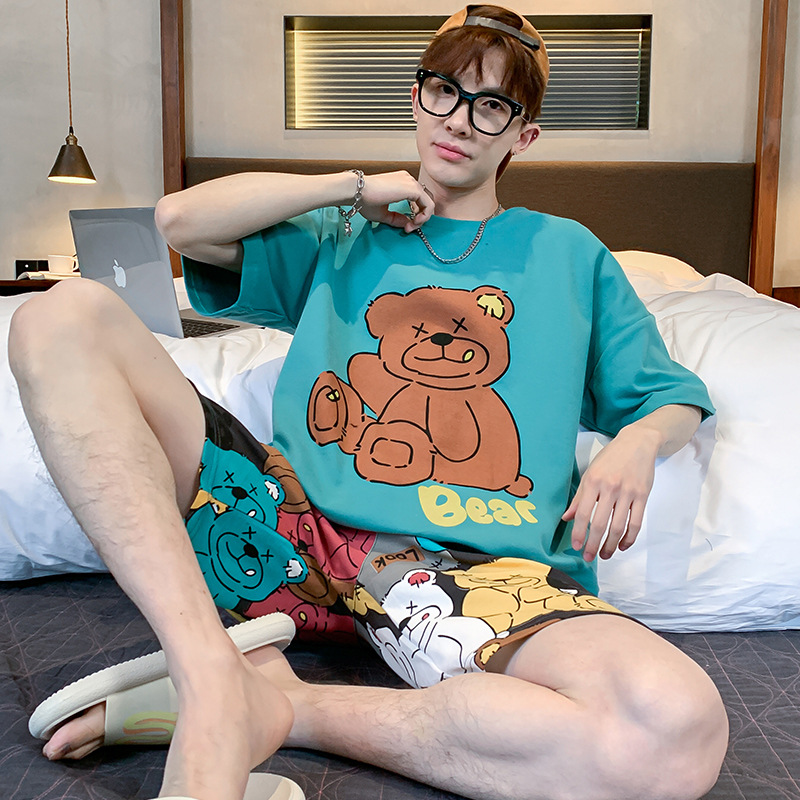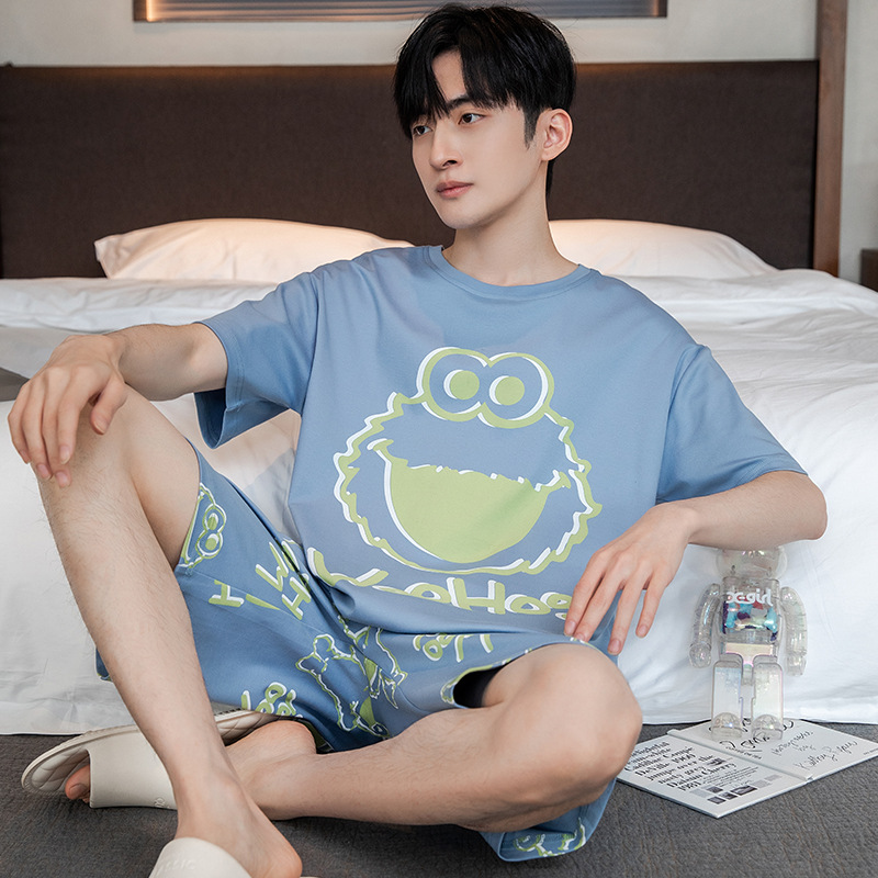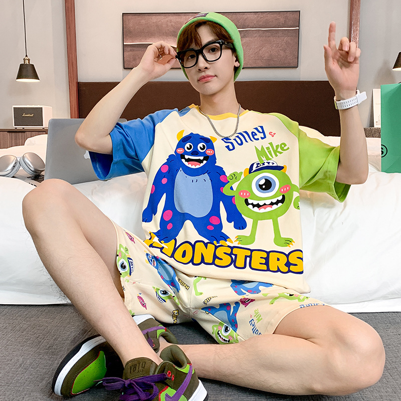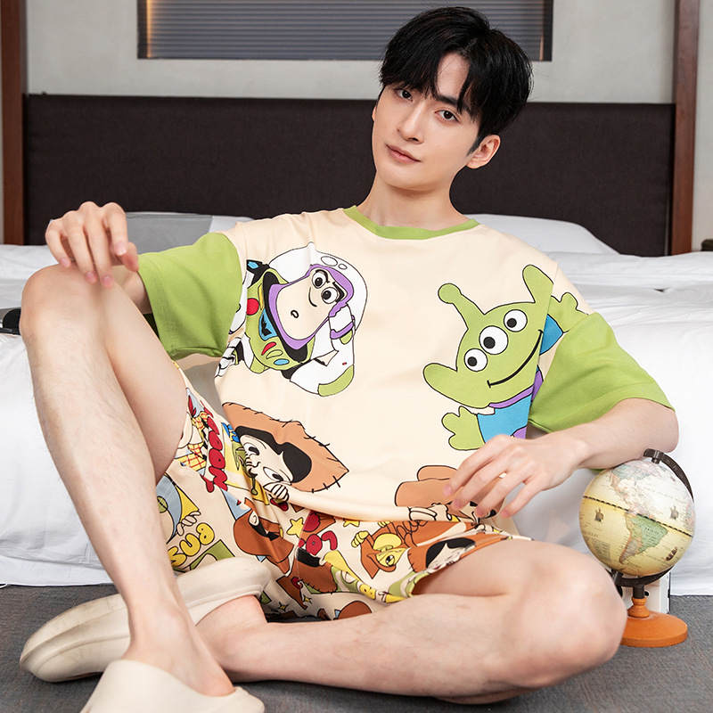 2024 새로운 여름 잠옷 남성의면 짧은 소매 얇은 만화 홈 착용 여름 느슨한 세트 패션 밖에서 착용 할 수 있습니다