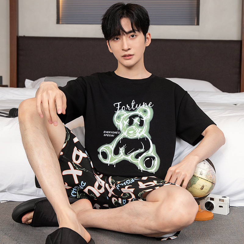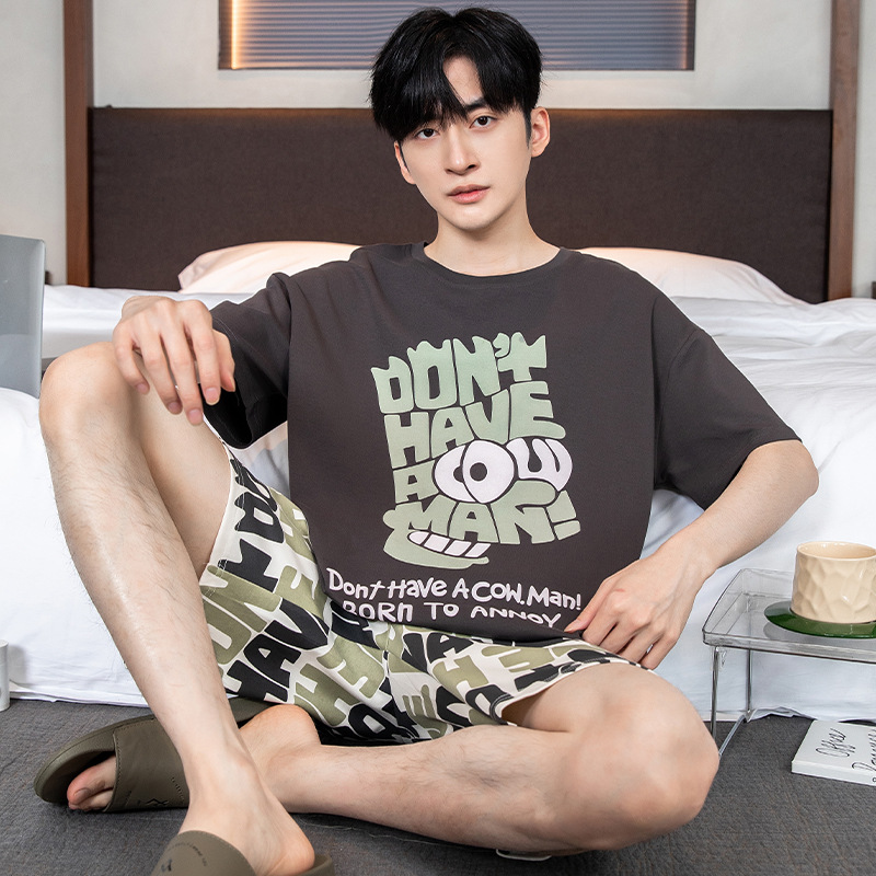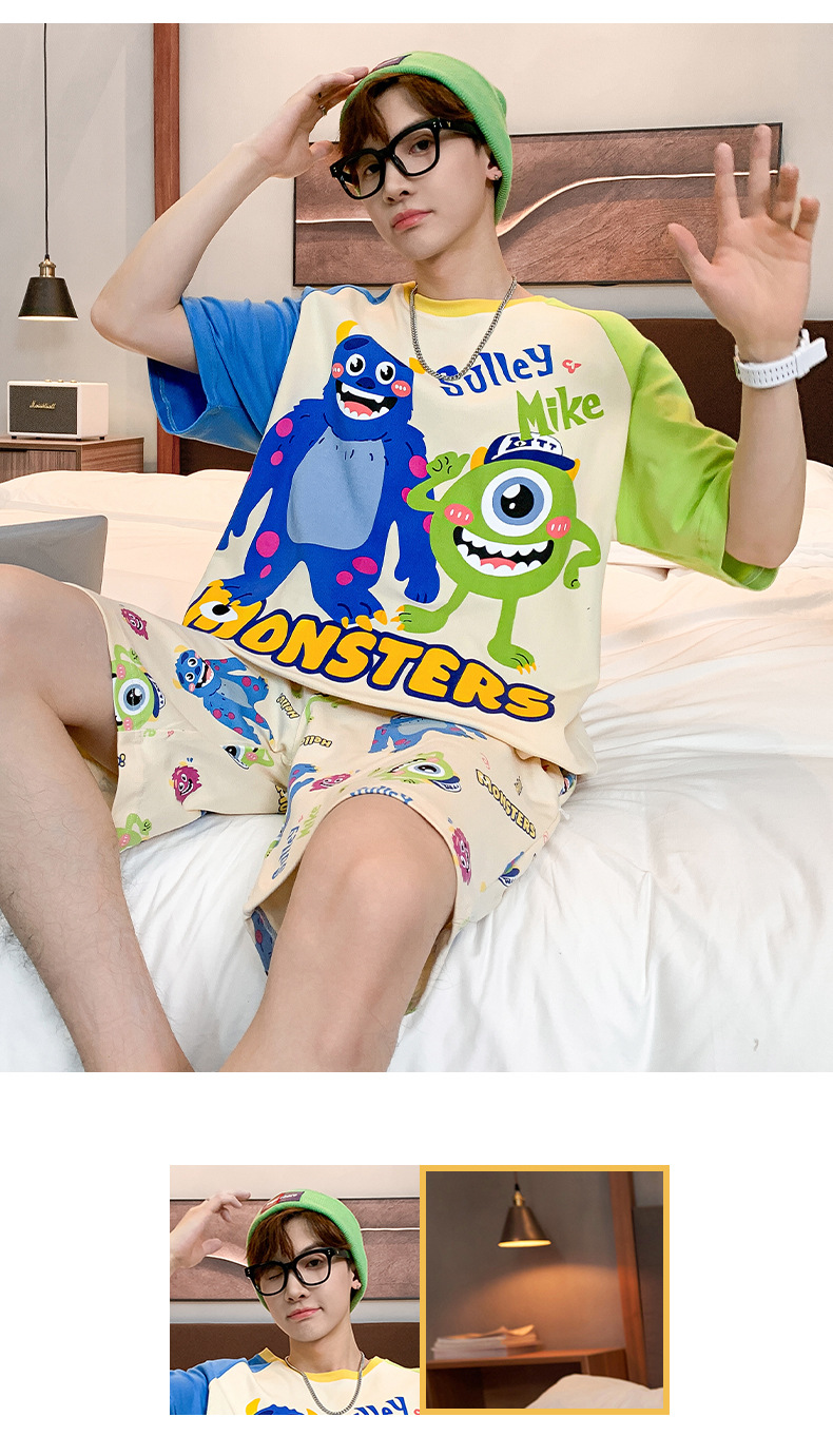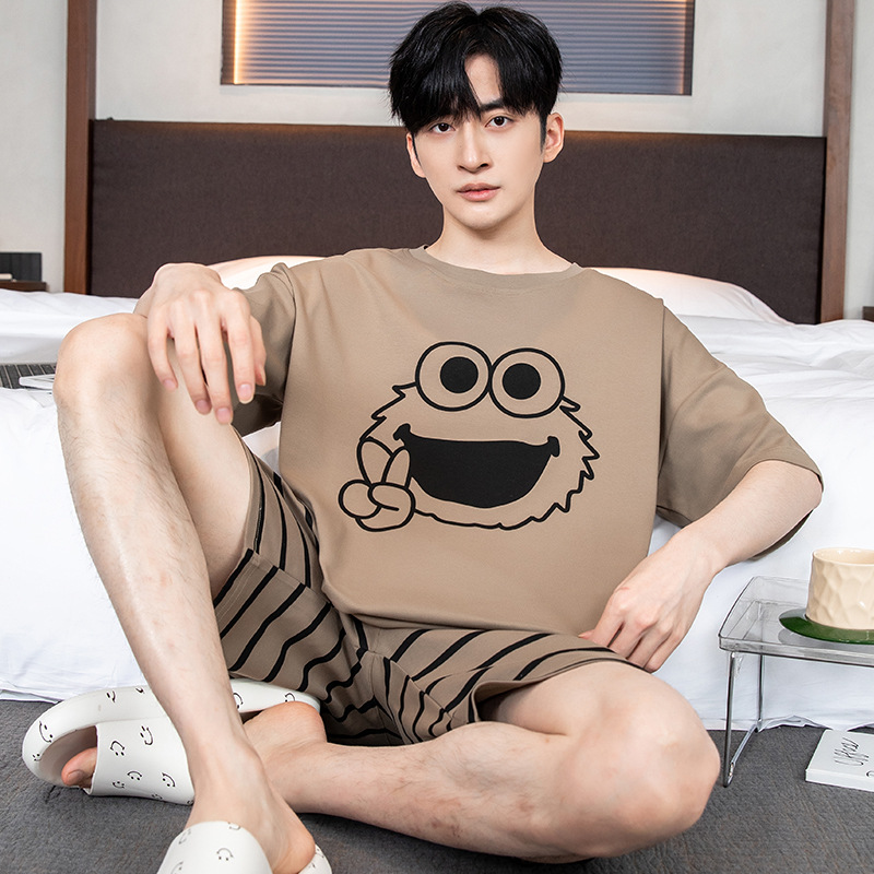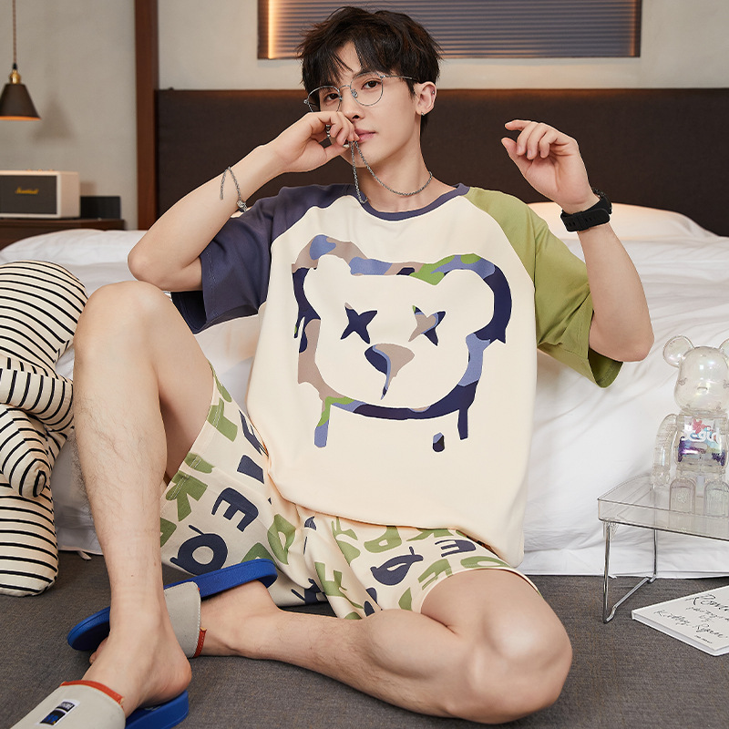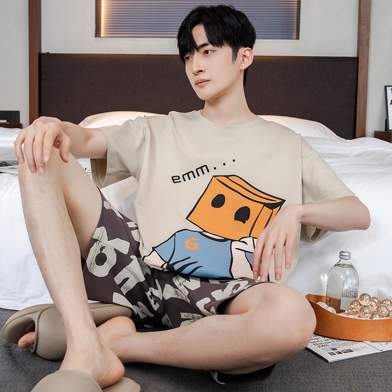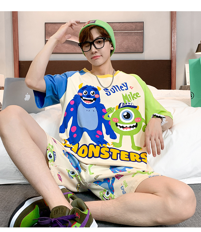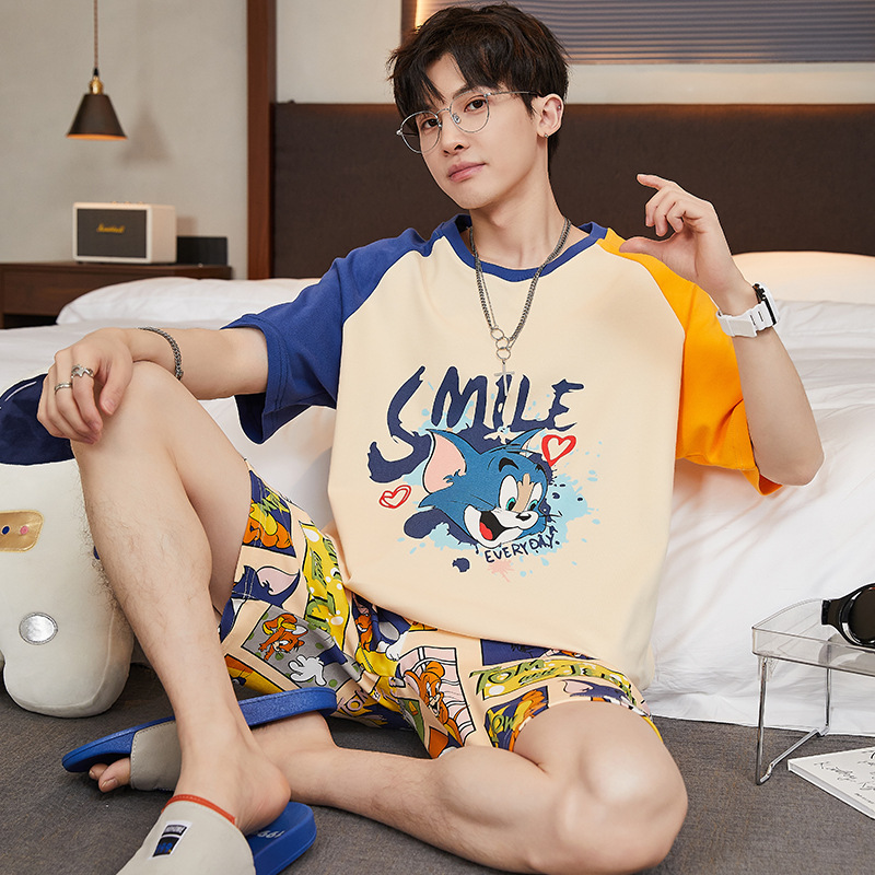 2024 새로운 여름 잠옷 남성의면 짧은 소매 얇은 만화 홈 착용 여름 느슨한 세트 패션 밖에서 착용 할 수 있습니다