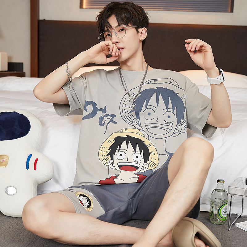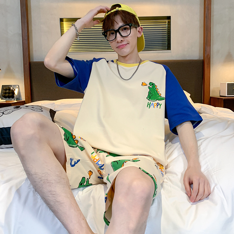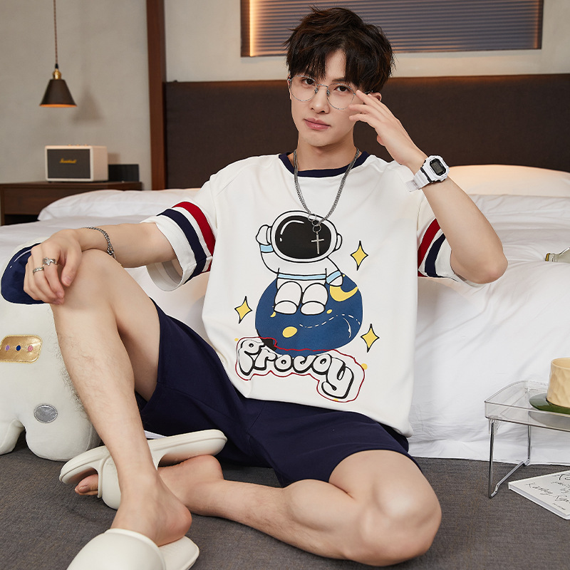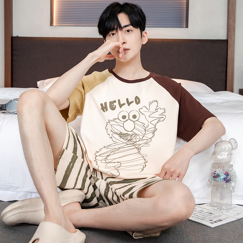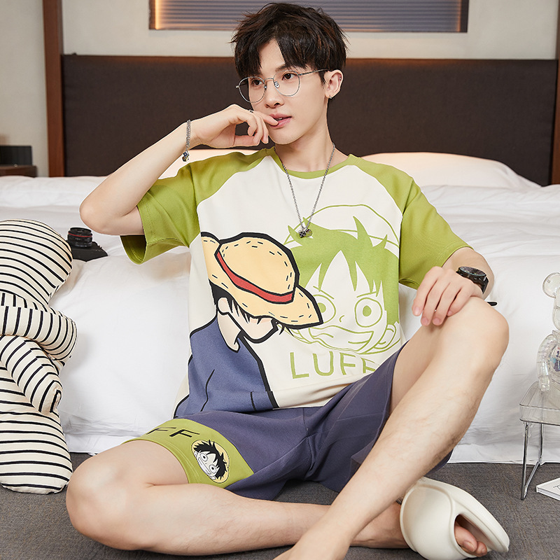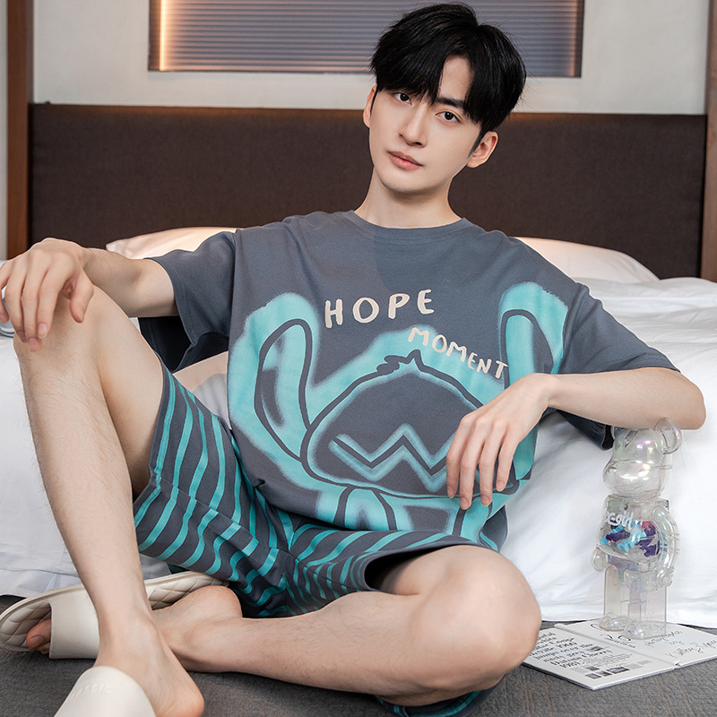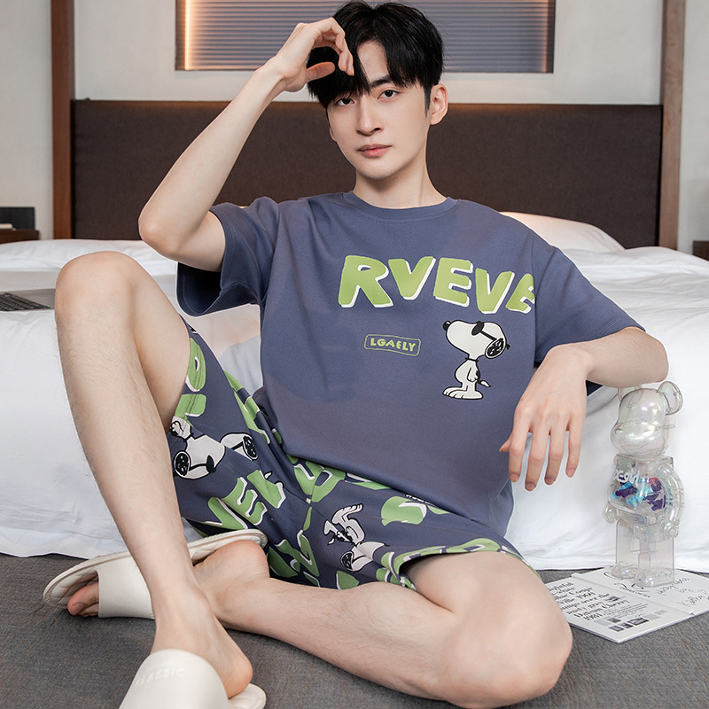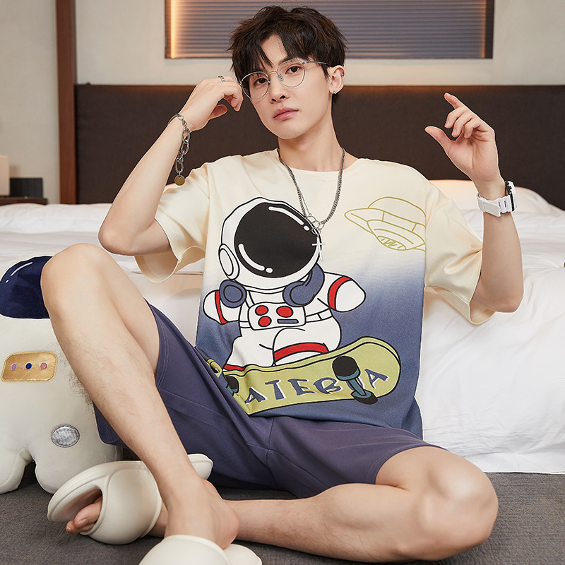 2024 새로운 여름 잠옷 남성의면 짧은 소매 얇은 만화 홈 착용 여름 느슨한 세트 패션 밖에서 착용 할 수 있습니다