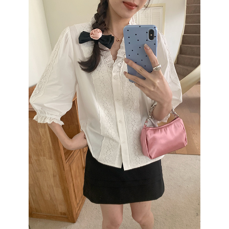【남프랑스의 백월광】게밍 프렌치 레트로 V넥 레이스 여성 셔츠 여름 출퇴근용 상의 Y1312F