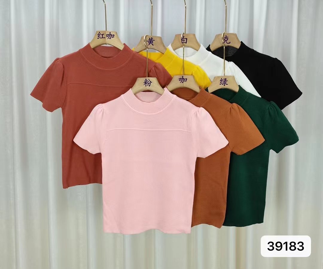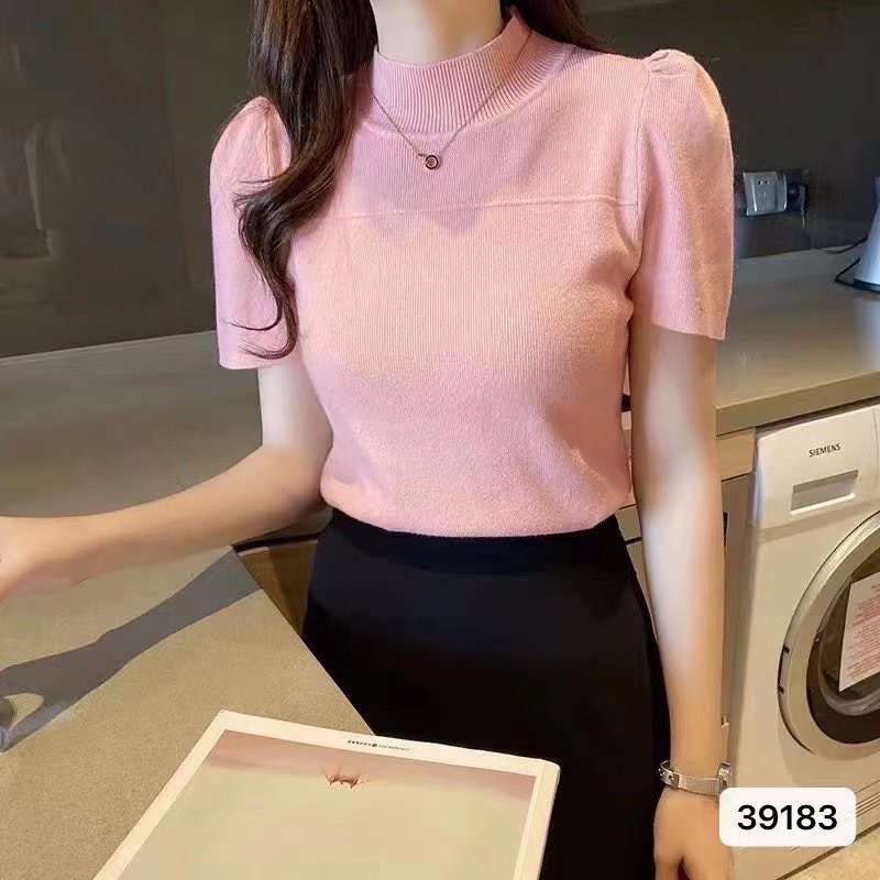 반팔 티셔츠 여성용 부티크 슬림 핏 하프 하이 칼라베이스 셔츠 얇은 퍼프 소매 니트웨어 숏 슬림 핏 탑 여름