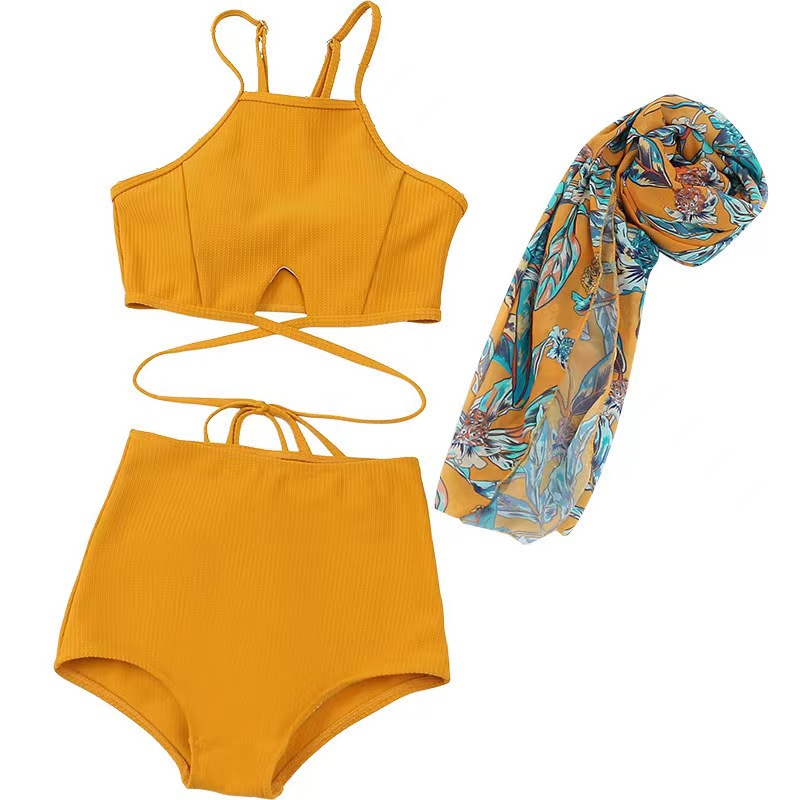 2025 새로운 커플 수영복 여성 비키니 롱 스커트 스플릿 하이 웨이스트 3 피스 세트 작은 가슴 푸시 업 온천 수영복