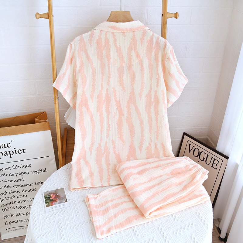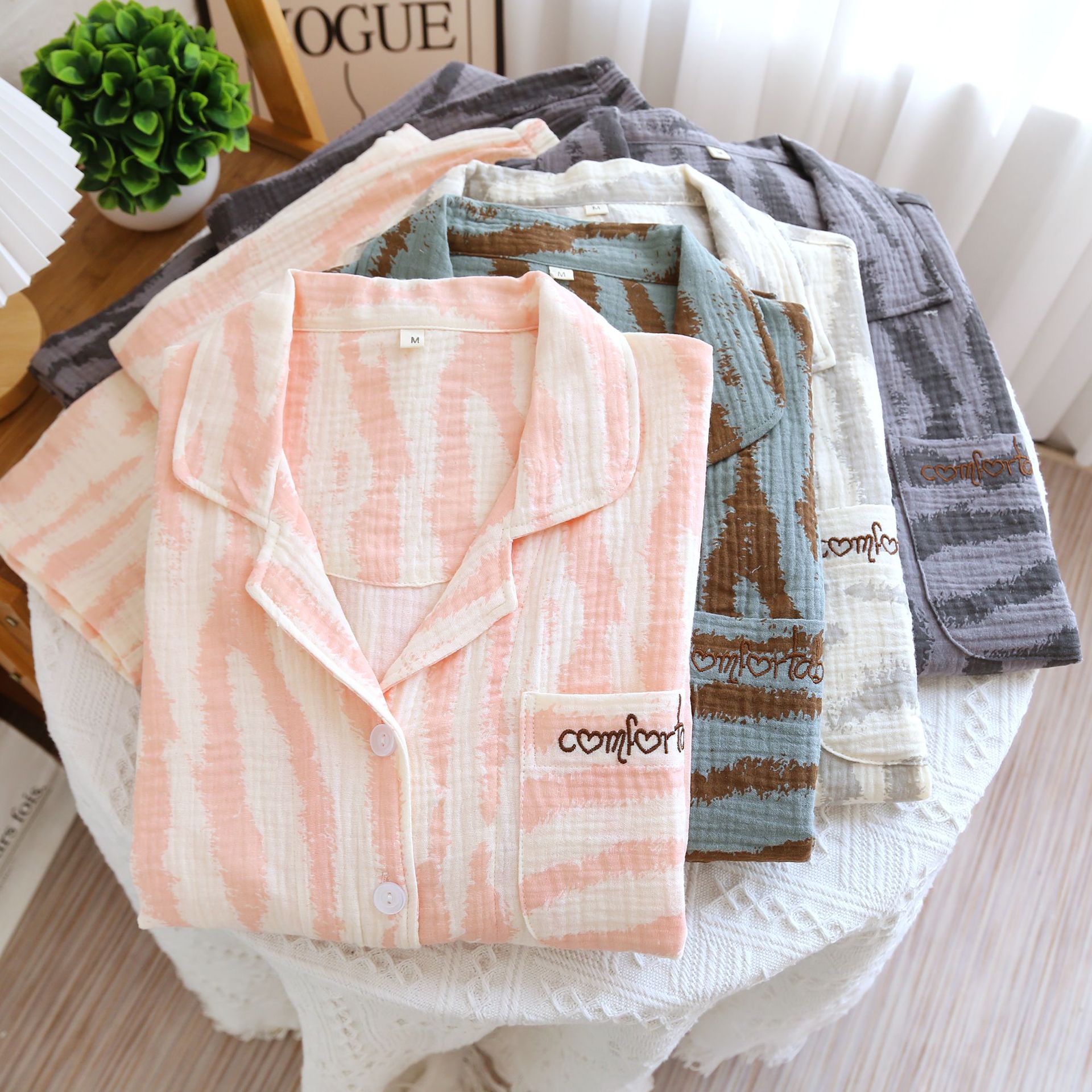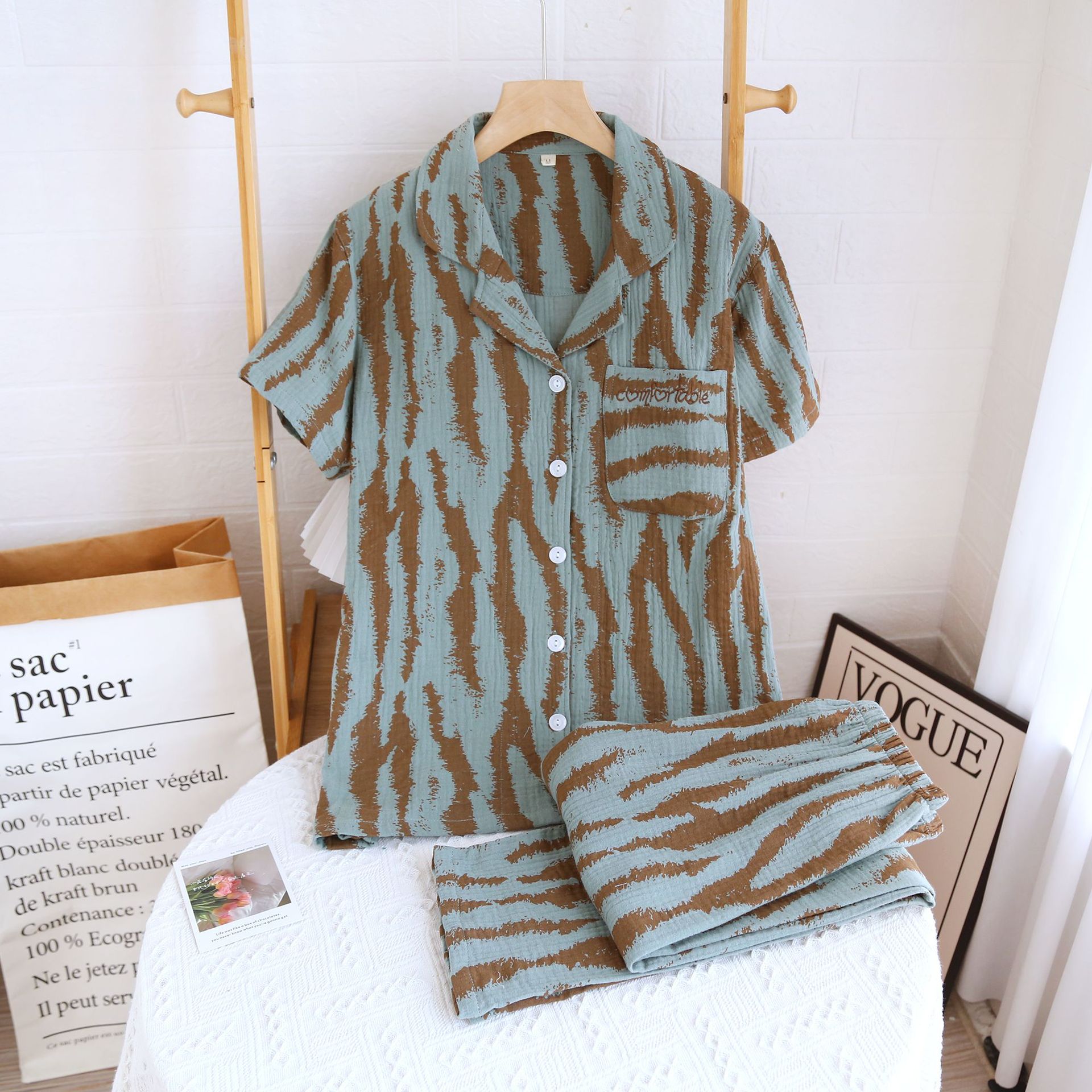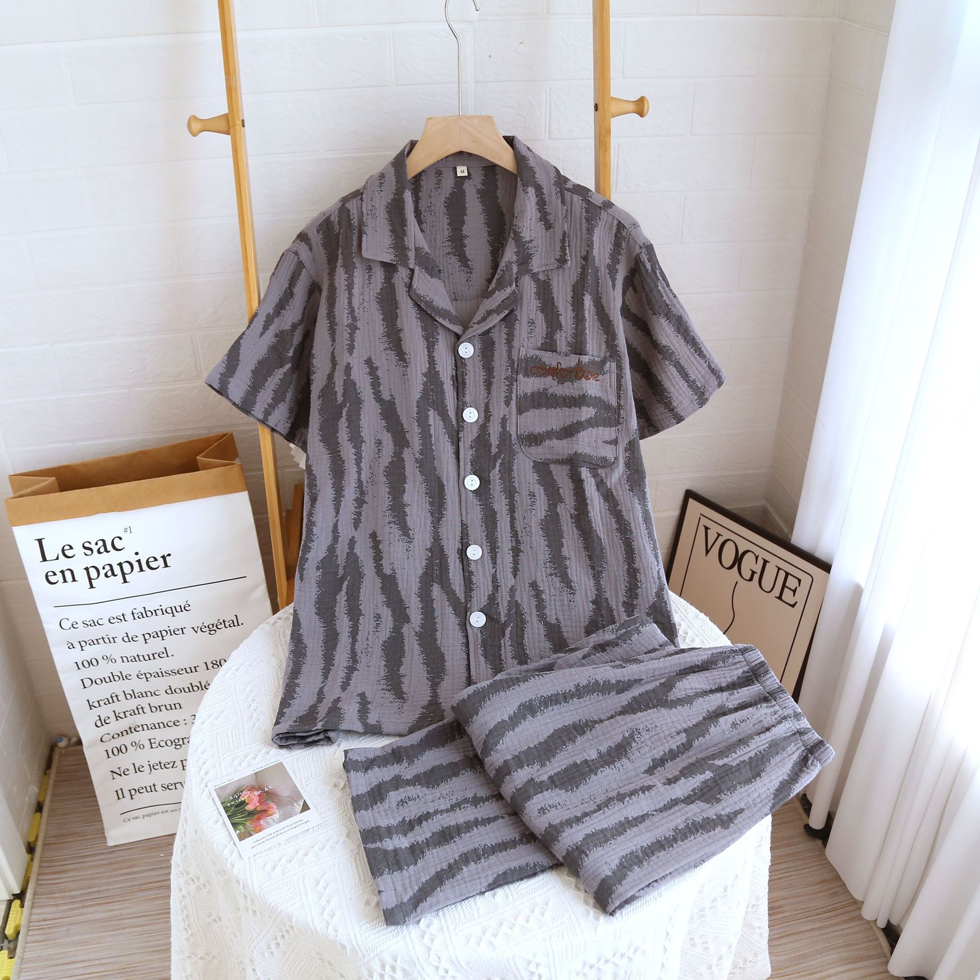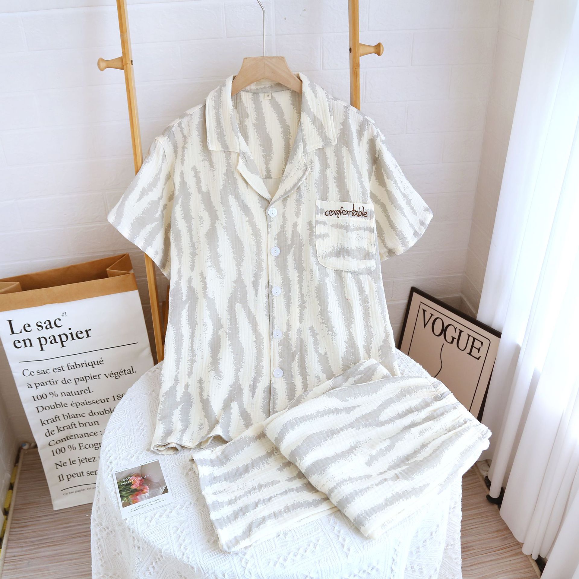새 커플의 반팔 바지 파자마 남성과 여성의 가정복 세트 면 거즈 봄과 여름 면화 얼룩말 패턴