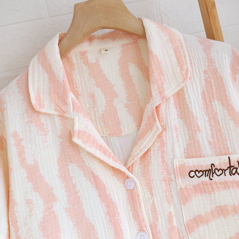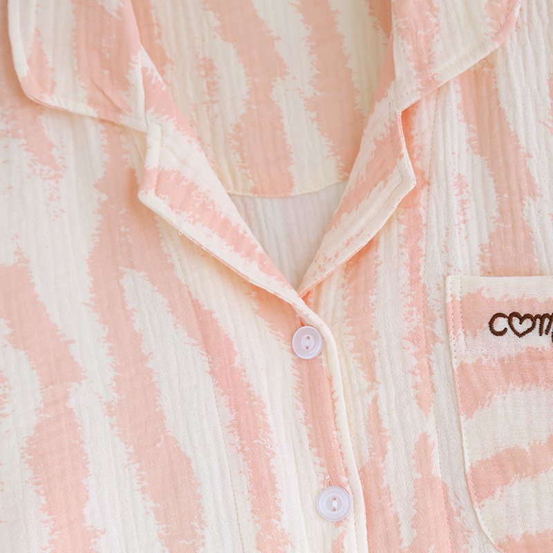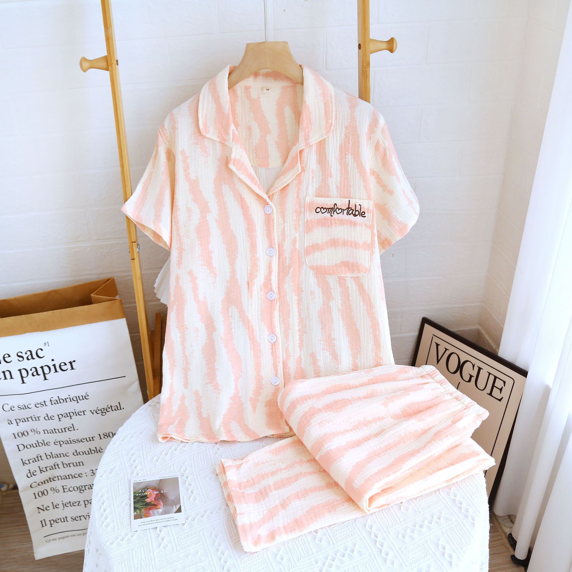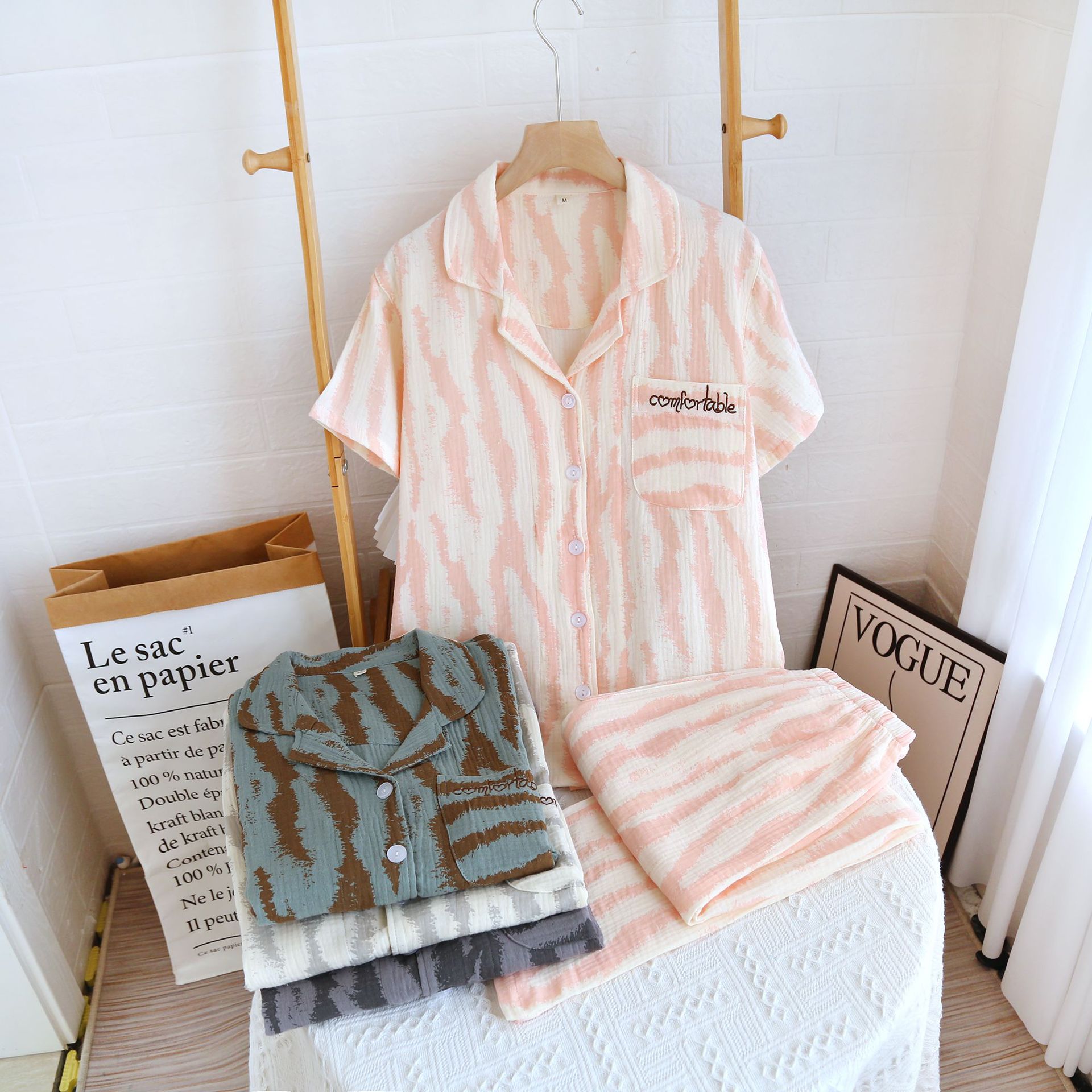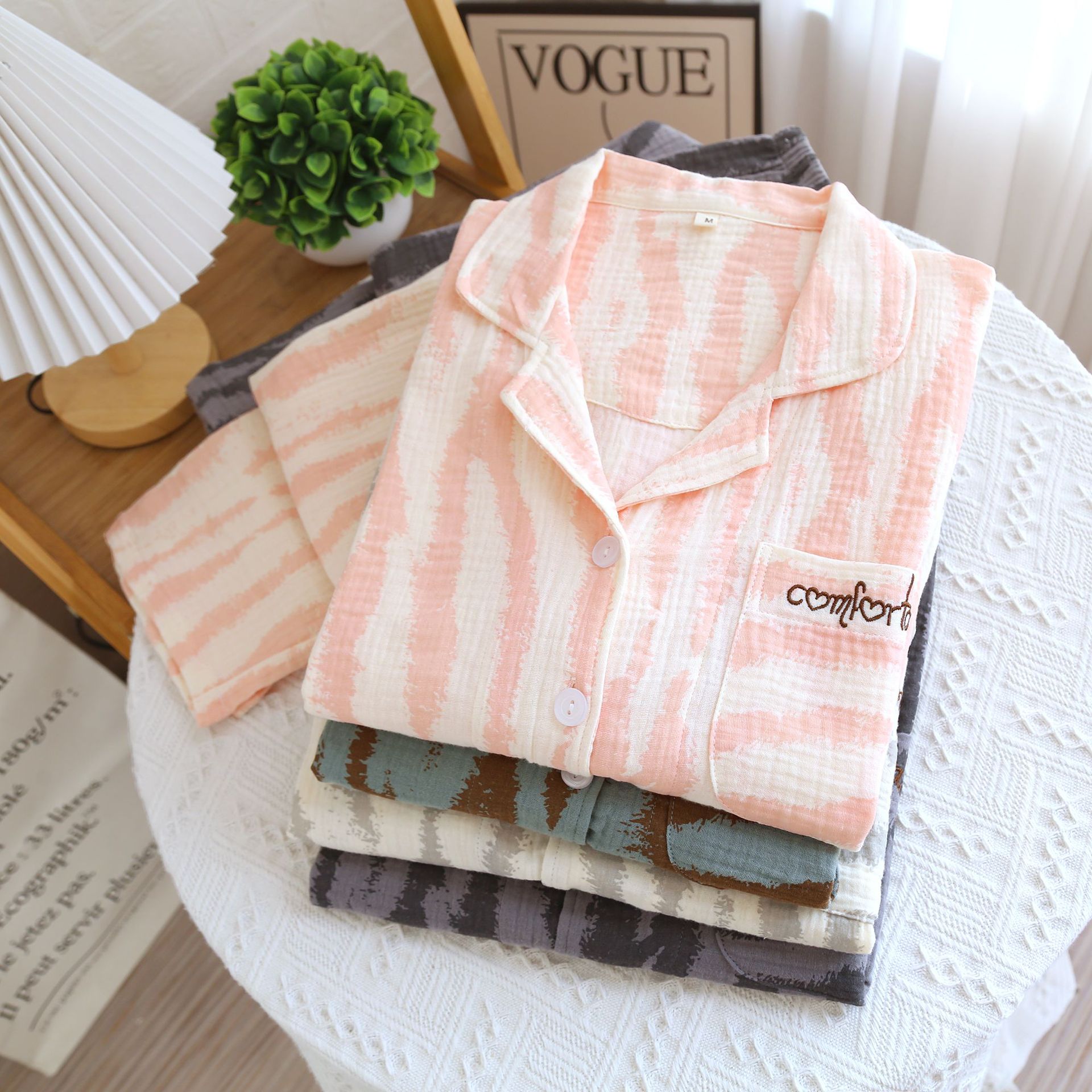 새 커플의 반팔 바지 파자마 남성과 여성의 가정복 세트 면 거즈 봄과 여름 면화 얼룩말 패턴