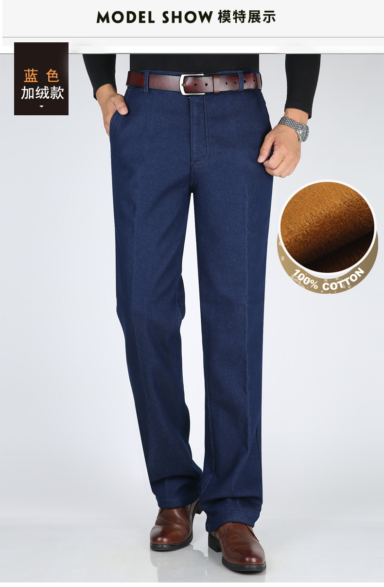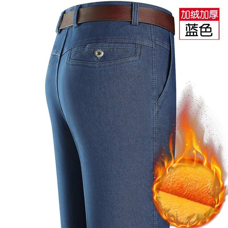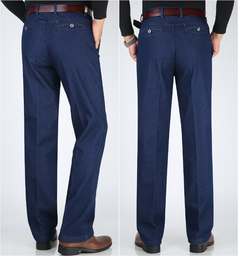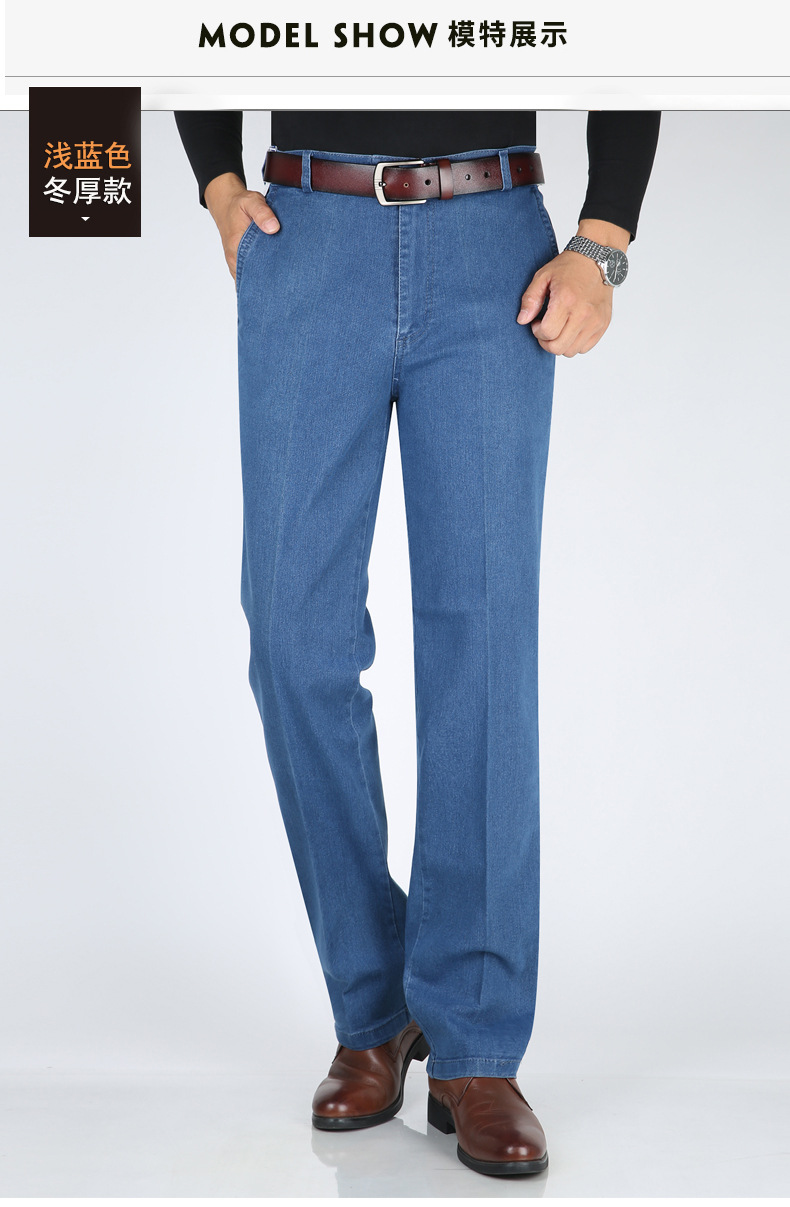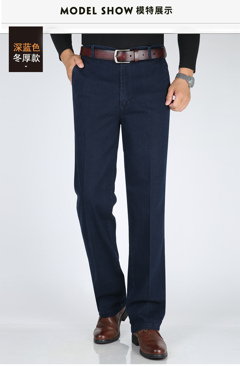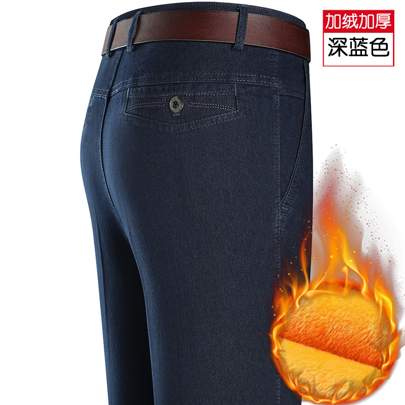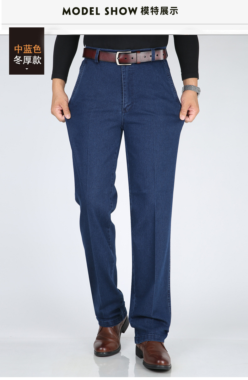 가을 겨울 두꺼운 청바지 중년 및 노년 남성용 루즈핏 스트레이트 하이웨이스트 딥컷 신축성 캐주얼 팬츠 아빠용 긴바지스토어 가기