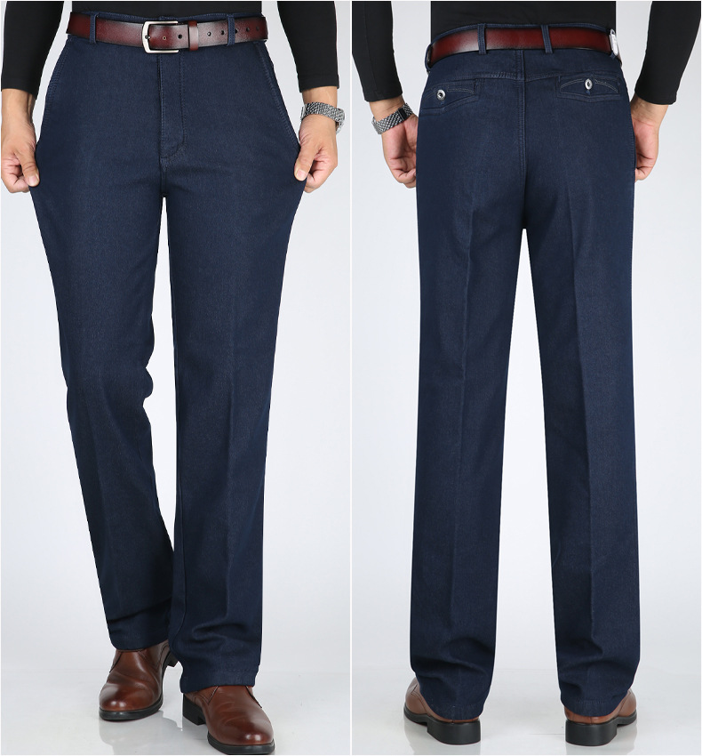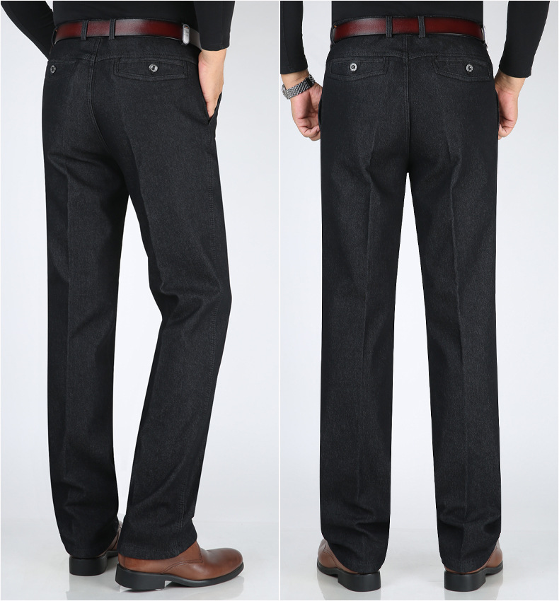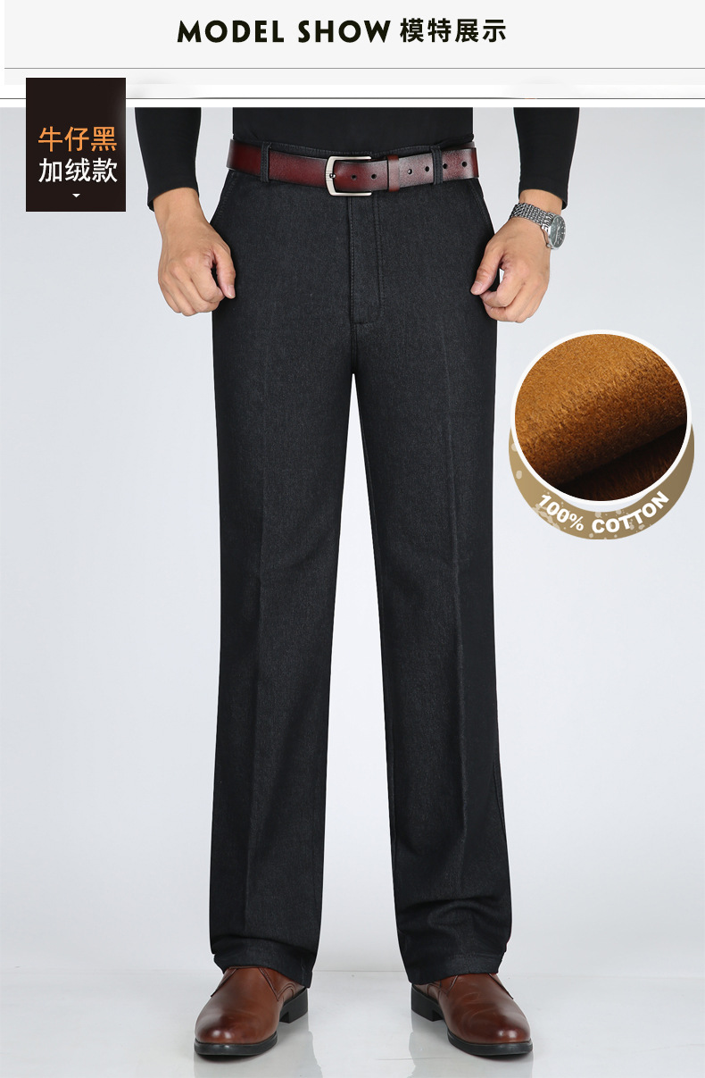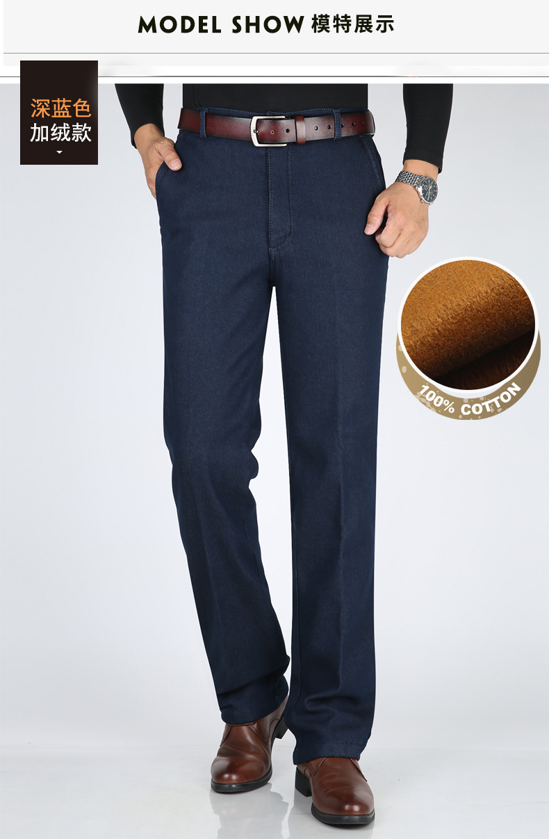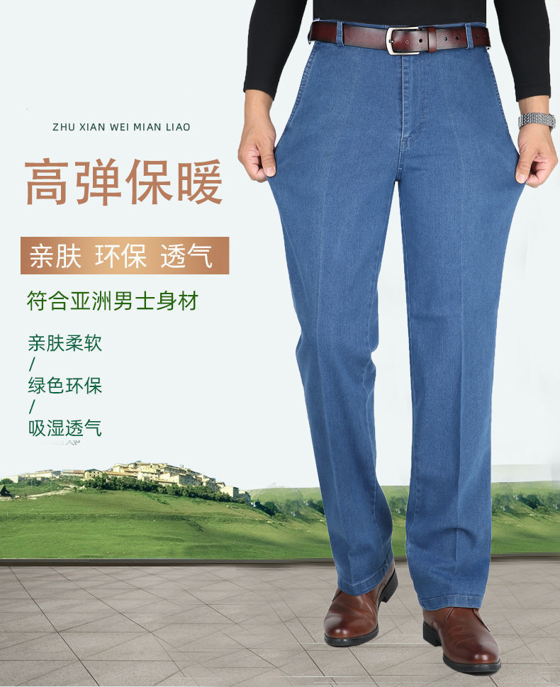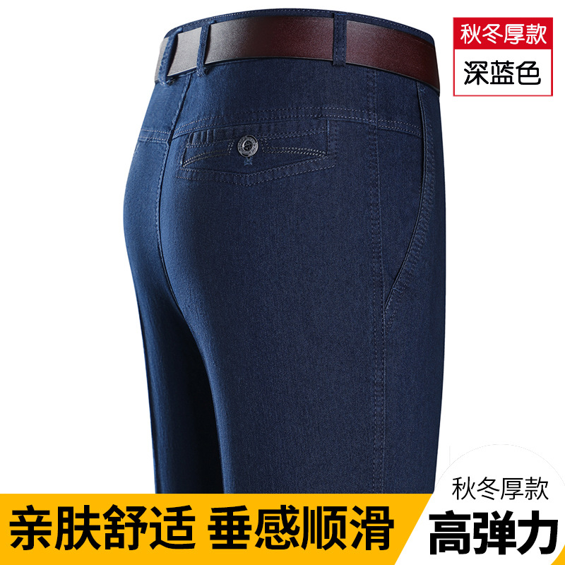 가을 겨울 두꺼운 청바지 중년 및 노년 남성용 루즈핏 스트레이트 하이웨이스트 딥컷 신축성 캐주얼 팬츠 아빠용 긴바지스토어 가기