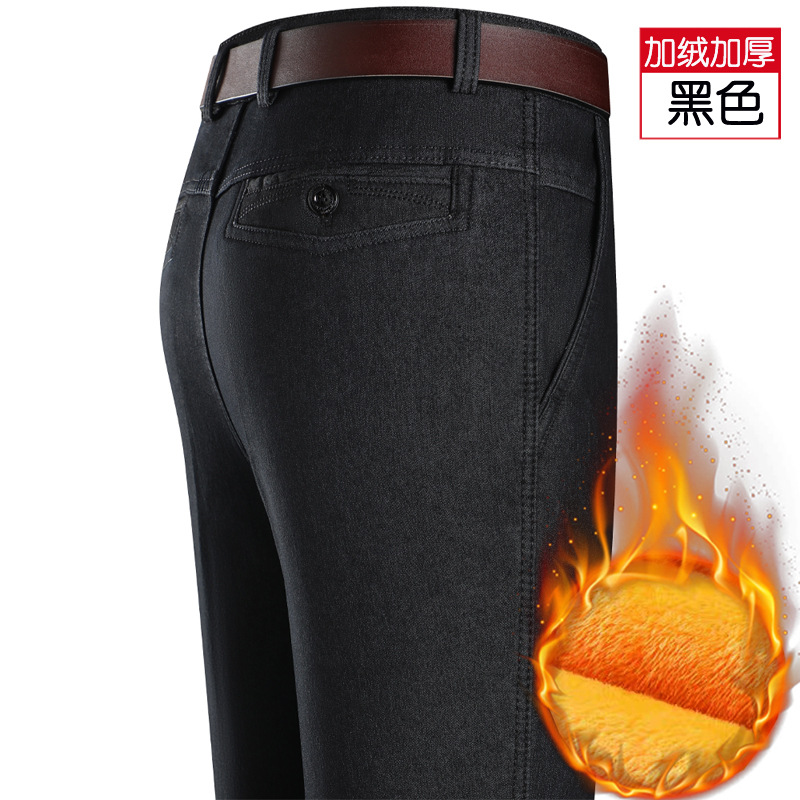 가을 겨울 두꺼운 청바지 중년 및 노년 남성용 루즈핏 스트레이트 하이웨이스트 딥컷 신축성 캐주얼 팬츠 아빠용 긴바지